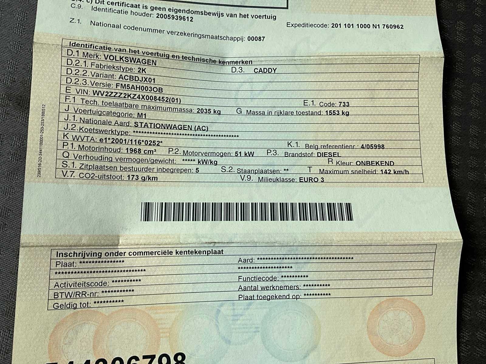 Nee Merk: Volkswagen Model: Caddy Bouwjaar: 2004 Afgelezen kilometerstand: 194234km Cilinderinhoud: 1968cc Vermogen (kW): 51kW Brandstof: diesel Chassisnummer: WV2ZZZ Datum eerste toelating: 24/03/2004 Transmissie: Handgeschakeld Emissieklasse: Euro 3 Nationaliteit documenten: Belgisch Gelijkvormigheidsattest aanwezig: true Start en rijdt: Ja Keuringsrapport geldig tot: 23/04/2026 Vavato voert geen technische keuring uit.: true Inschrijvingsbewijs - deel 1 : Aanwezig Inschrijvingsbewijs - deel 2: Aanwezig