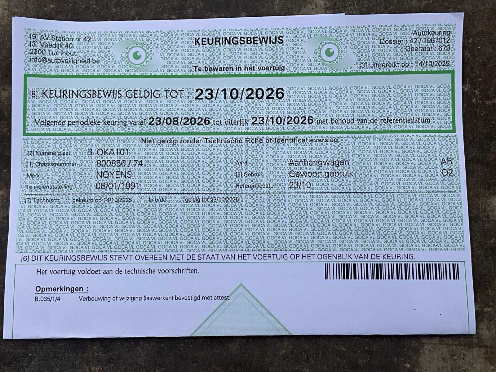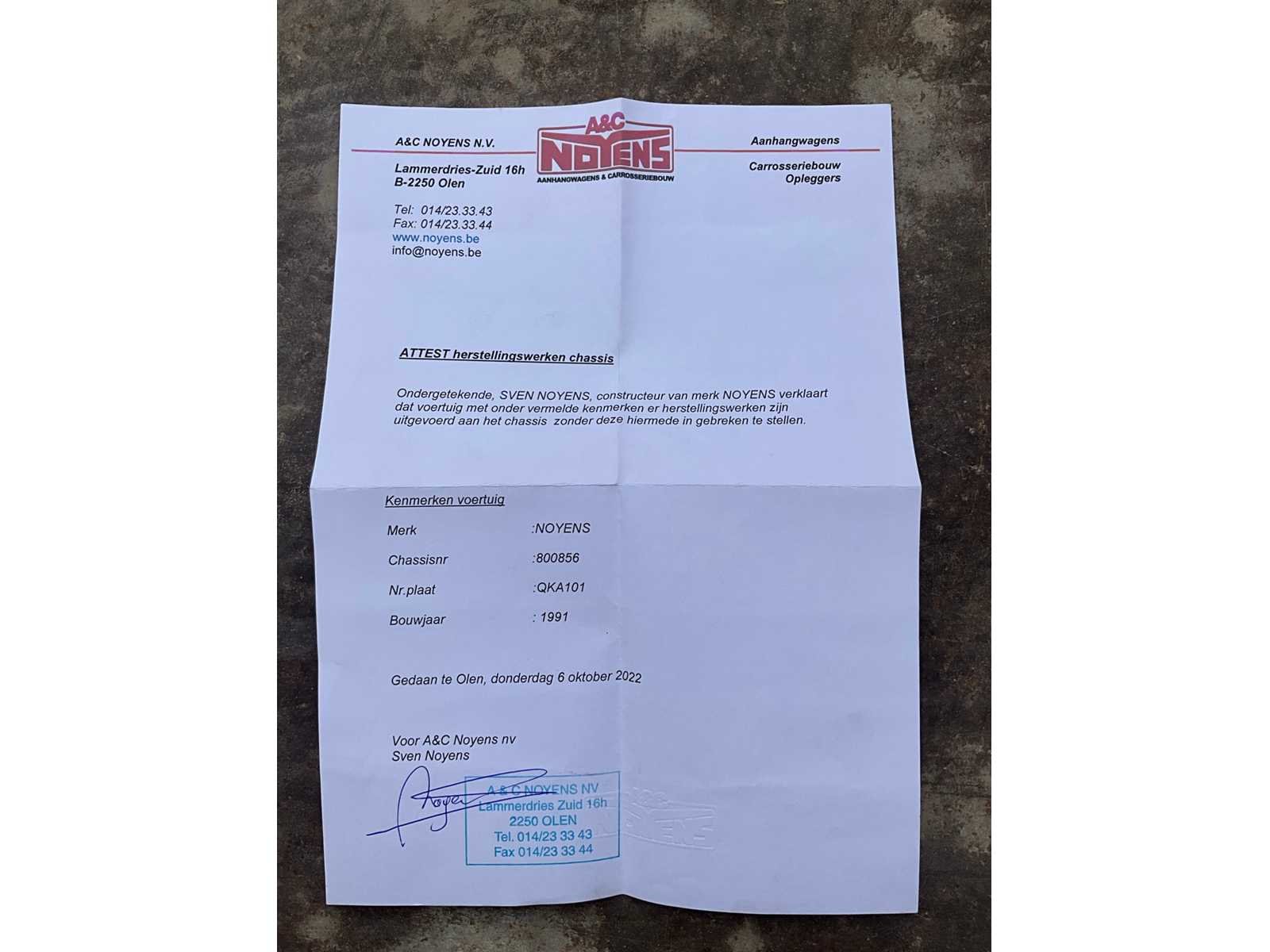 Nee Merk: Noyens Type: K2/2000 Bouwjaar: 2009 Chassisnummer: 800856 Aantal assen: 2 Laadbak afmeting l: 300cm Laadbak afmeting b: 165cm Ledig gewicht: 780kg Laadvermogen: 1220kg Datum eerste toelating: 08/01/1991 Nationaliteit documenten: Belgisch