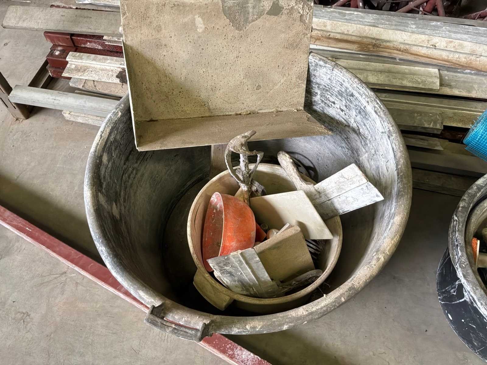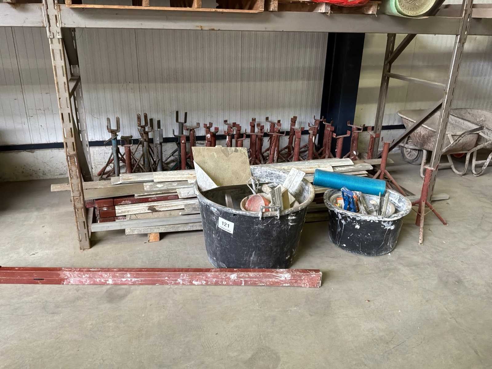 Diverse stucadoorsmateriaal waaronder onder meer diverse handgereedschap, stellingvoeten en -balken,… Nee