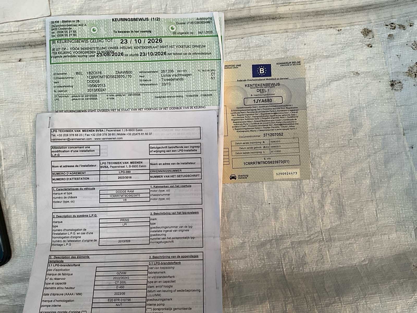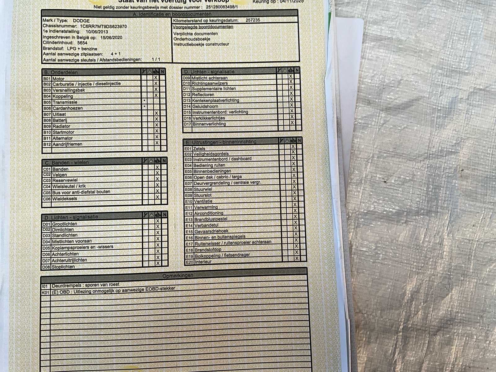 Lichte vracht Nee Merk: DODGE RAM Model: RAM 1500 Type: RR7M Bouwjaar: 2013 Afgelezen kilometerstand: 261696km Cilinderinhoud: 5654cc Vermogen (kW): 295kW Brandstof: LPG +Benzine Chassisnummer: 1C6RR7MT9DS623970 Laadvermogen: 3084kg Datum eerste toelating: 10/06/2013 Energielabel: Euro5b Aantal zitplaatsen: 5 Kleur: Wit Transmissie: Automaat Drive type: Vierwiel Gasinstallatie: true Stuurwiel: Links Aantal deuren: 4 Aantal sleutels: 3 Carrosserie: Ok Nationaliteit documenten: België Start en rijdt: Ja Keuringsrapport geldig tot: 23/10/2026 Andere boorddocumenten: Ja Airconditioning: true Navigatie: true LED-koplampen: true Leder bekleed: true Vierwielaandrijving 4x4: true Inschrijvingsbewijs - deel 1 : Ja Inschrijvingsbewijs - deel 2: Ja