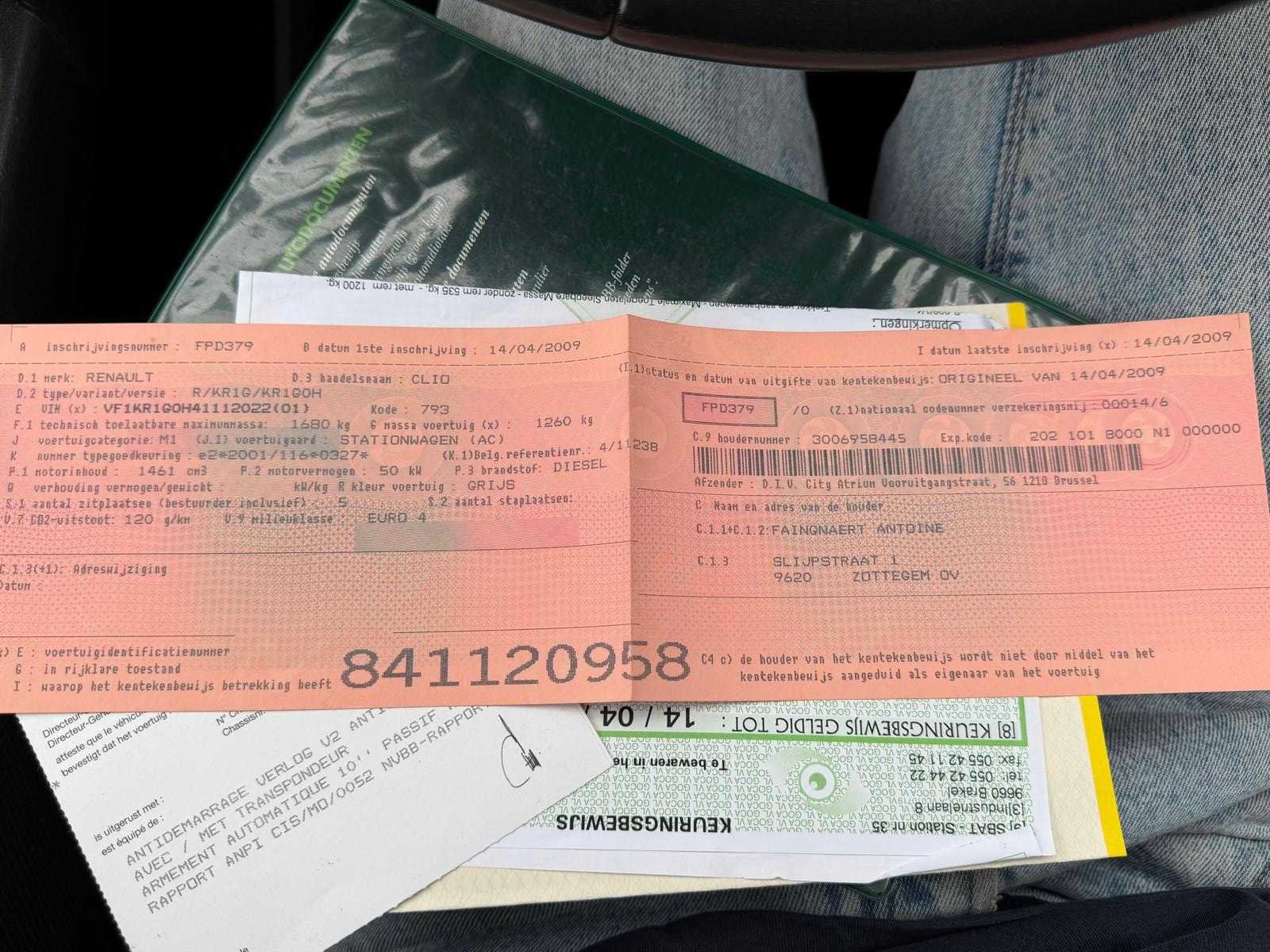 De wagen start en rijdt zonder problemen. Documenten aanwezig, zie foto’s voor details., Nee Merk: Renault Model: Clio Bouwjaar: 2009 Afgelezen kilometerstand: 162483km Cilinderinhoud: 1461cc Vermogen (kW): 50kW Brandstof: diesel Chassisnummer: VF1KR1GOH41112022 Datum eerste toelating: 14/04/2009 Aantal zitplaatsen: 5 Kleur: Grijs Transmissie: Handgeschakeld Emissieklasse: Euro 4 Nationaliteit documenten: België Vavato voert geen technische keuring uit.: true Inschrijvingsbewijs - deel 1 : Aanwezig