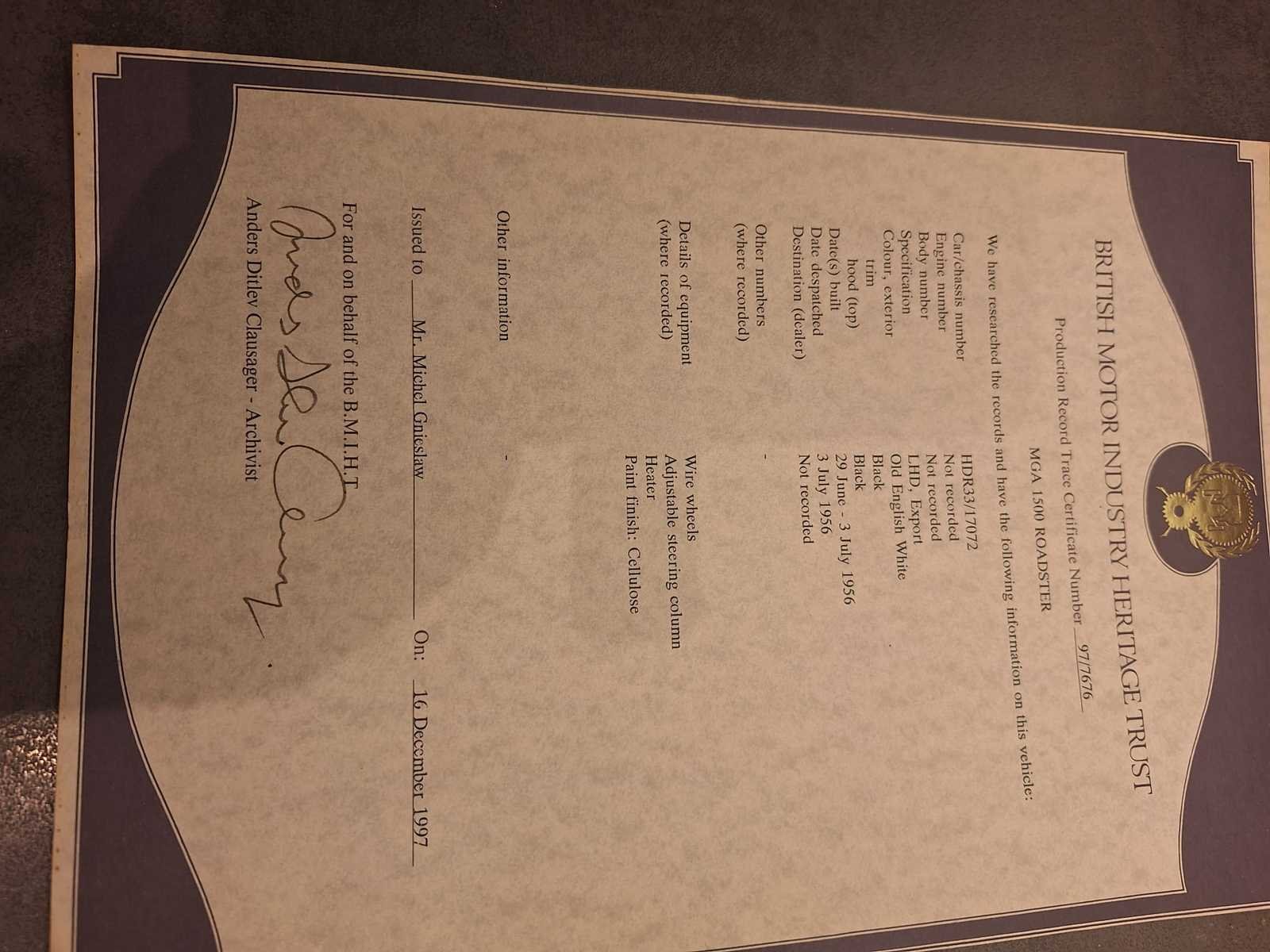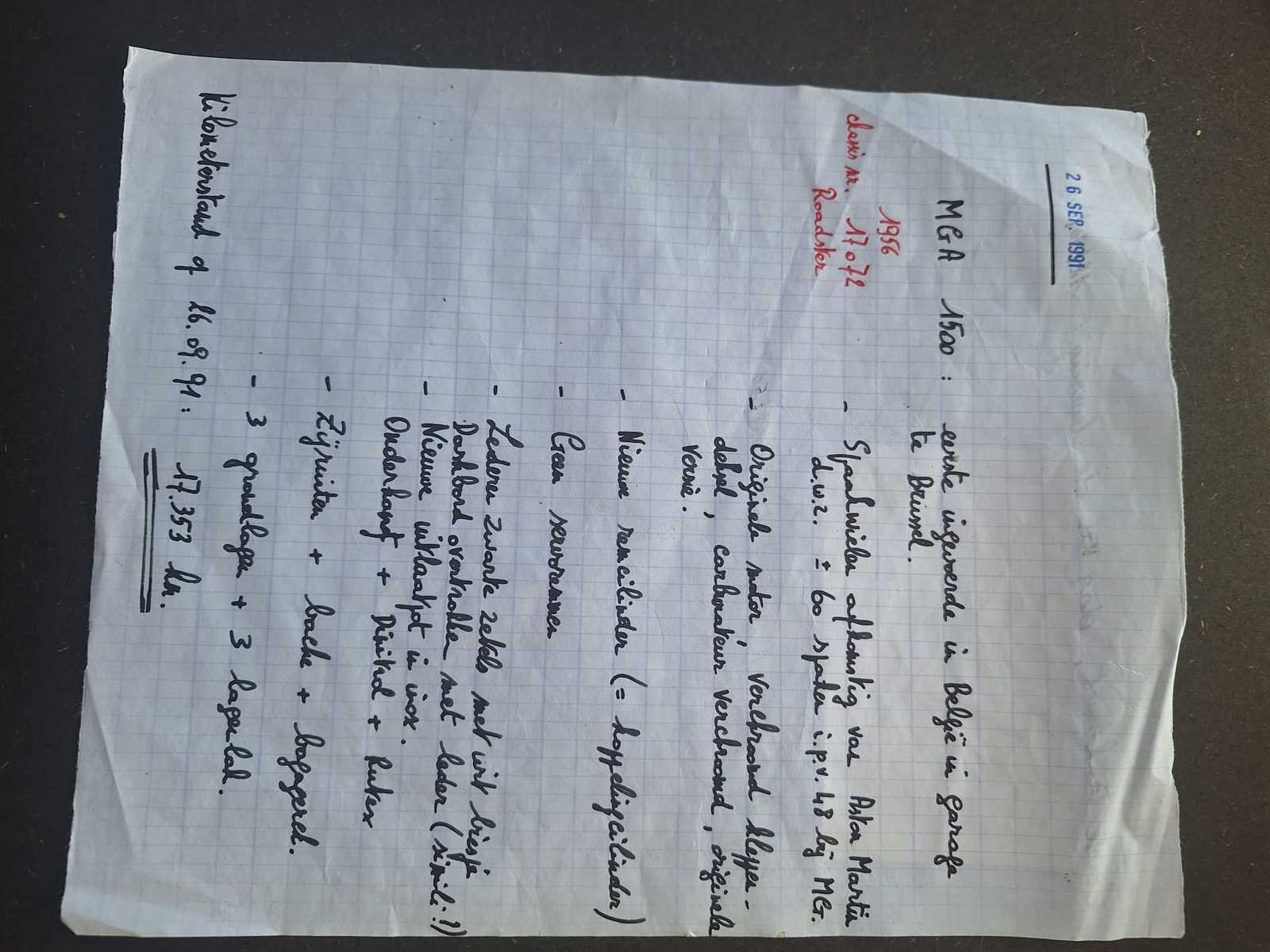 De wagen start, rijdt en draait soepel. Carrosserie zeer proper. Compleet met alle papieren. MGA 1500 : eerste ingevoerde in België in garage te Brussel 1956 chassis nr. 17072 Roadster * Spatwielen afkomstig van Alfa Martin d.w.z. = 60 spaken i.p.v. 48 bij MG. * Originele motor, versnellingsbak, deel, carburateur verchroomd, originele wielen. * Nieuwe remcilinders (= hoofdcilinders) * Geen reservewiel * Lederen zwarte zetels met wit biesje Dashboard overtrokken met leder (zoals!) Nieuwe uitlaat is inox. * Onderkant + dicht + rubber * Zijruiten + hoes + bagagerek. * 3 gordels + 3 kapellen. Kilometerstand op 26.09.91 : 17.353 km. Nee Merk: MGA Type: 1500 roadster Bouwjaar: 1956 Chassisnummer: 17072 Afgelezen kilometerstand: 57347 Datum eerste inschrijving: 25/07/1956 Nationaliteit documenten: Belgisch Vermogen (pk): 68 Vermogen (kW): 50kW Startinformatie: Start en rijdt Cilinderinhoud: 1489 Aantal cilinders: 4 Inschrijvingsbewijs - deel 1 : Aanwezig Inschrijvingsbewijs - deel 2: Aanwezig