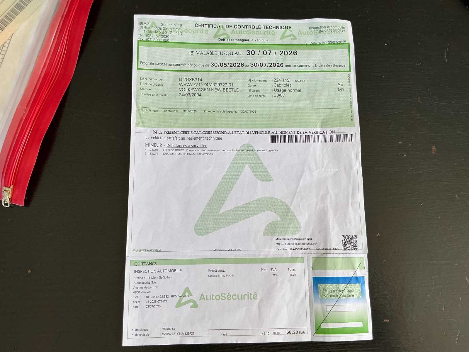 Deze New Beetle. Cabriolet heeft : verwarmde zetels, cd-lader, leder interieur, electrisch open dak, airconditioning, .alles in perfect werkende staat. No Merk: Volkswagen Model: New Beetle cabriolet Type: Cabriolet Bouwjaar: 2004 Afgelezen kilometerstand: 231696km Cilinderinhoud: 1390cc Vermogen (kW): 75kW Brandstof: Benzine Chassisnummer: WVWZZZ1YZ 4M 329722-01 Laadvermogen: 450kg Datum eerste toelating: 24/03/2004 Vermogen (pk): 102hp Energielabel: F Aandrijving: Voorwielaandrijving Aantal zitplaatsen: 5 Maximaal trekgewicht ongeremd: 500kg Maximaal trekgewicht geremd: 1200kg Kleur: Zilver Transmissie: Handgeschakeld Drive type: Front wheel Stuurwiel: Li,ks Emissieklasse: Euro 3 Aantal deuren: 3 Aantal sleutels: 1 Ledig gewicht: 1300kg Aantal cilinders: 4 Nationaliteit documenten: België Gelijkvormigheidsattest aanwezig: true Carpass: true Start en rijdt: Ok Keuringsrapport geldig tot: 30/07/2026 startinformatie : Ok Zichtbare schade: Zie foto’s Vavato voert geen technische keuring uit.: true Airconditioning: true Leder bekleed: true Inschrijvingsbewijs - deel 1 : Aanwezig Inschrijvingsbewijs - deel 2: Aanwezig