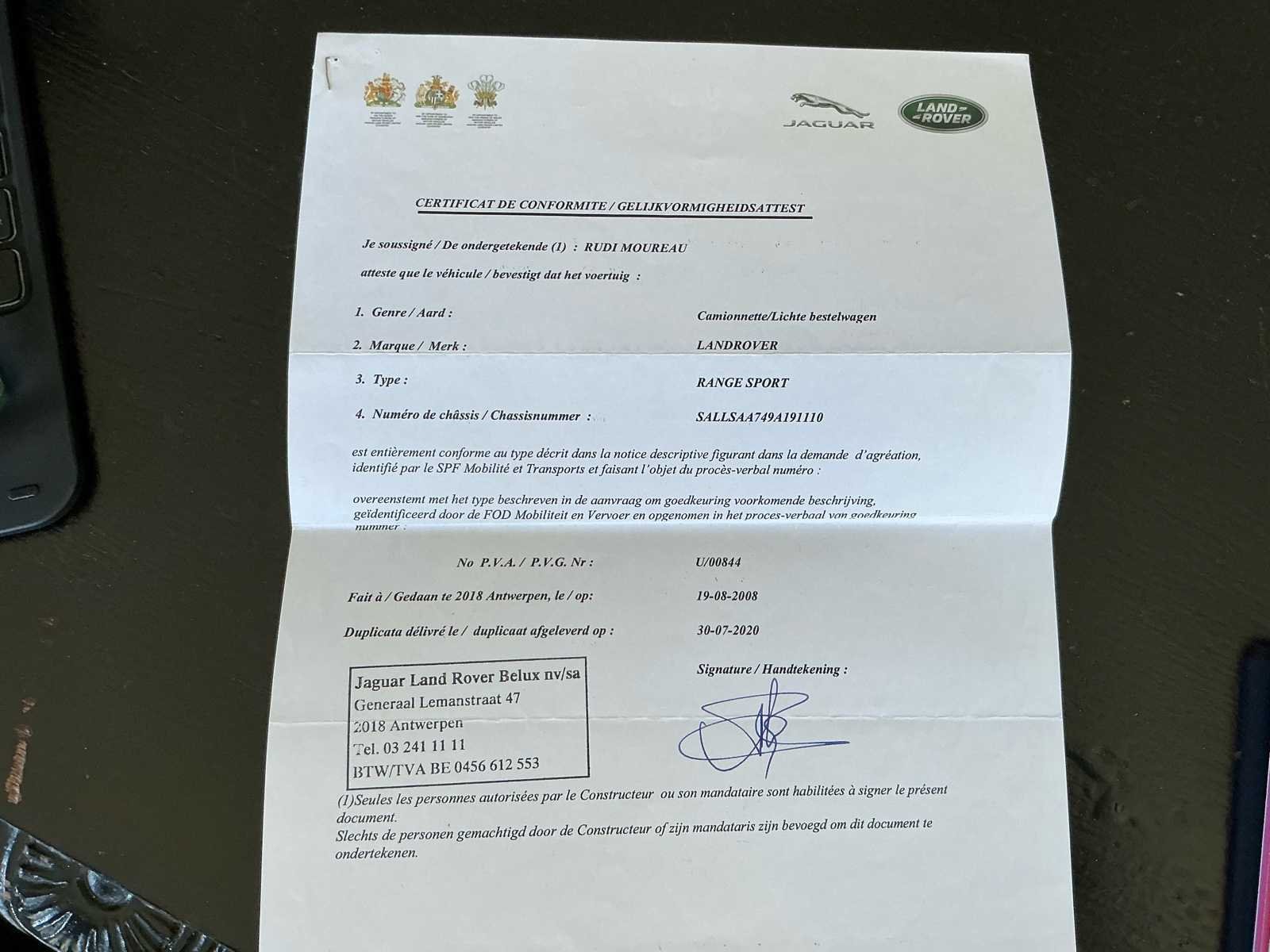 Prachtige wagen aangezien zijn leeftijd, lichte vracht, trekhaak. Nee Merk: Landrover Model: Range Sport Type: Lichte vracht Bouwjaar: 2008 Afgelezen kilometerstand: 242606km Cilinderinhoud: 3.8cc Vermogen (kW): 200kW Brandstof: Diesel Chassisnummer: SALLSAA749A191110(01) Laadvermogen: 600kg Datum eerste toelating: 19/08/2008 Vermogen (pk): 300hp Energielabel: G Aandrijving: 4x4 Aantal zitplaatsen: 2 Maximaal trekgewicht ongeremd: 750kg Maximaal trekgewicht geremd: 3500kg Kleur: Zilver Transmissie: Automaat Drive type: Vierwiel Stuurwiel: Links Emissieklasse: Euro 4 Aantal deuren: 5 Aantal sleutels: 1 Ledig gewicht: 2480kg Aantal cilinders: 8 Nationaliteit documenten: België Gelijkvormigheidsattest aanwezig: true Carpass: true Start en rijdt: Ok Keuringsrapport geldig tot: 17/11/2026 Technische fiche: true Andere boorddocumenten: Alle startinformatie : Ok Zichtbare schade: Licht krasje te zien op de foto Vavato voert geen technische keuring uit.: true Airconditioning: true Navigatie: true Xenon verlichting: true LED-koplampen: true Leder bekleed: true Luchtvering: true Vierwielaandrijving 4x4: true Inschrijvingsbewijs - deel 1 : Aanwezig Inschrijvingsbewijs - deel 2: Aanwezig