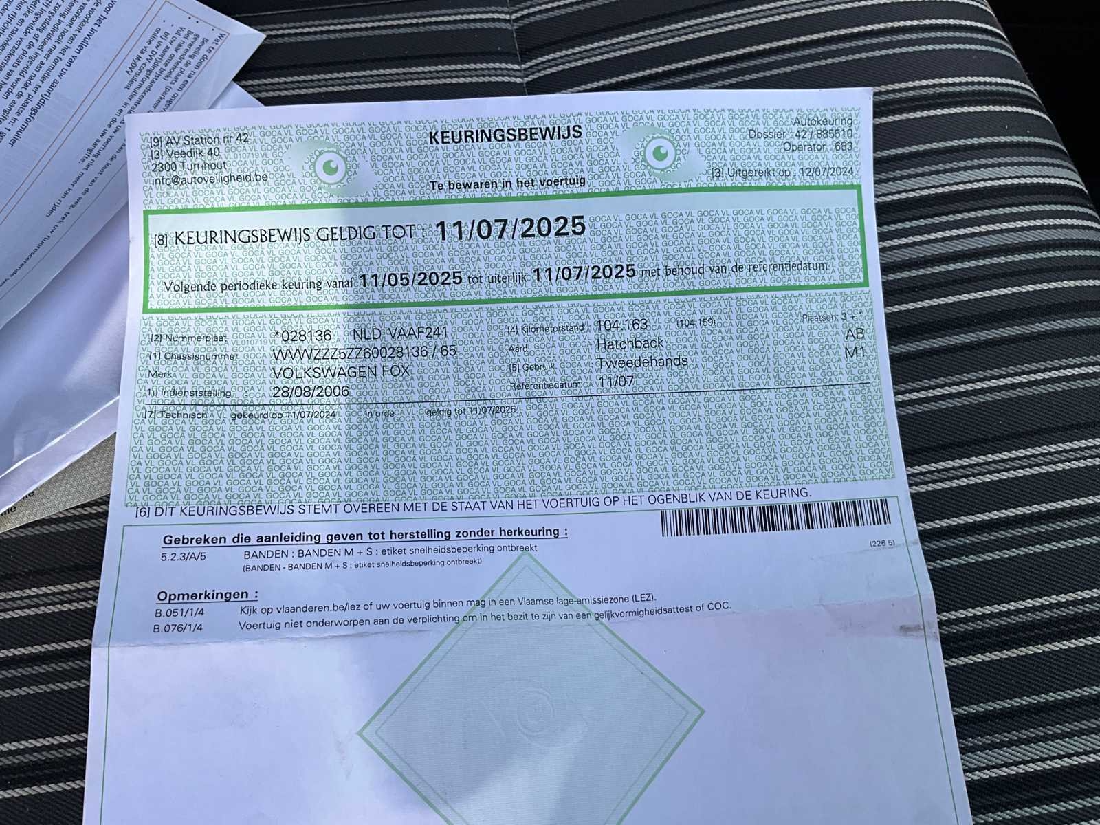 Dashboard is defect hierdoor is ook de kilometerstand niet af te lezen. Nee Merk: Volkswagen Model: Fox Bouwjaar: 2006 Cilinderinhoud: 1390cc Vermogen (kW): 55kW Brandstof: Benzine Tellerstand niet afleesbaar: true Chassisnummer: WVWZZZ5ZZ60028136 Datum eerste toelating: 28/08/2006 Aantal zitplaatsen: 4 Transmissie: Handgeschakeld Emissieklasse: Euro 4 Aantal deuren: 5 Nationaliteit documenten: Belgisch Start en rijdt: Ja startinformatie : Start & rijdt Vavato voert geen technische keuring uit.: true Airconditioning: true Inschrijvingsbewijs - deel 1 : Aanwezig Inschrijvingsbewijs - deel 2: Aanwezig