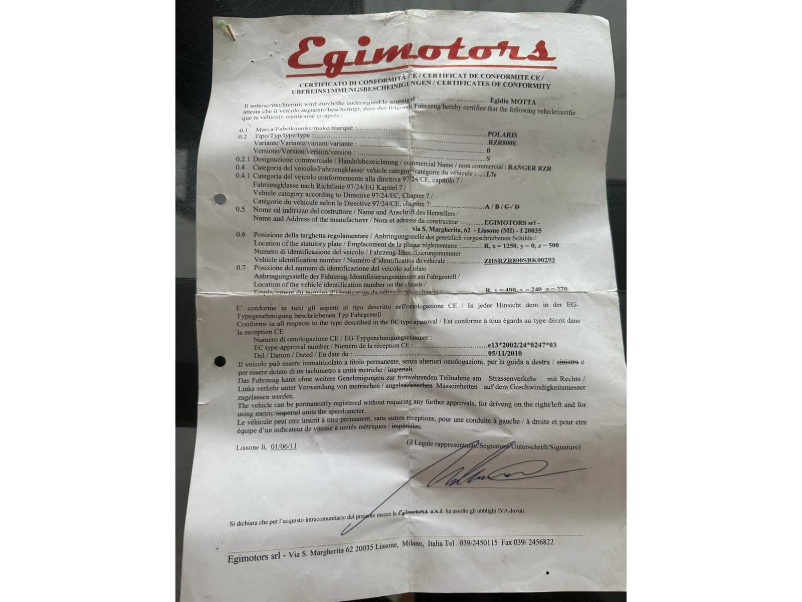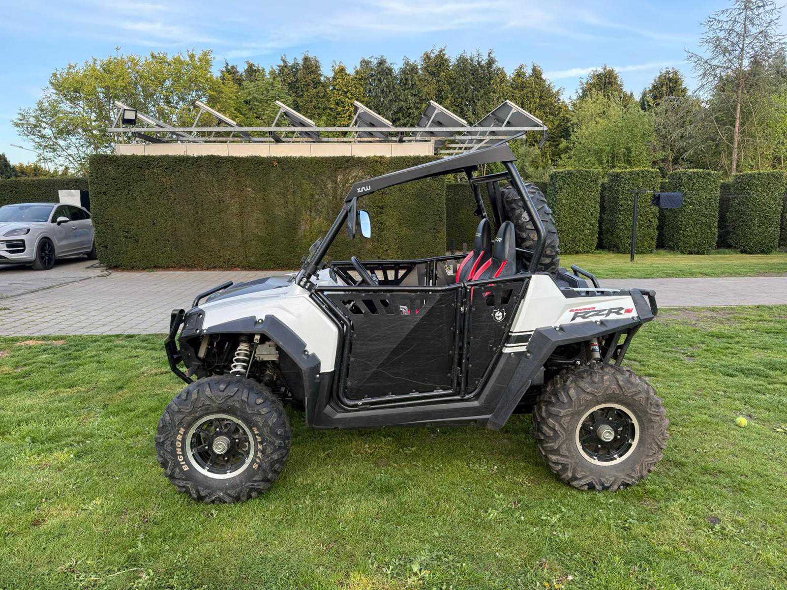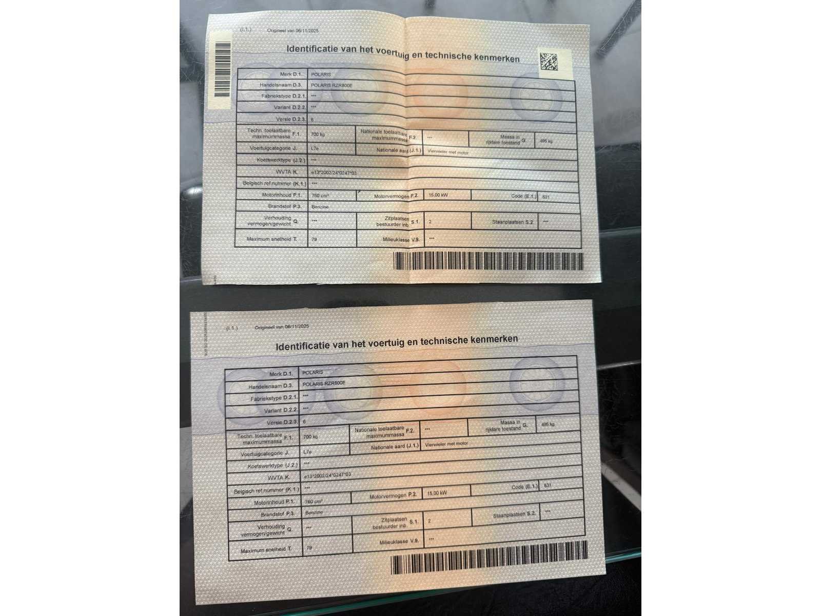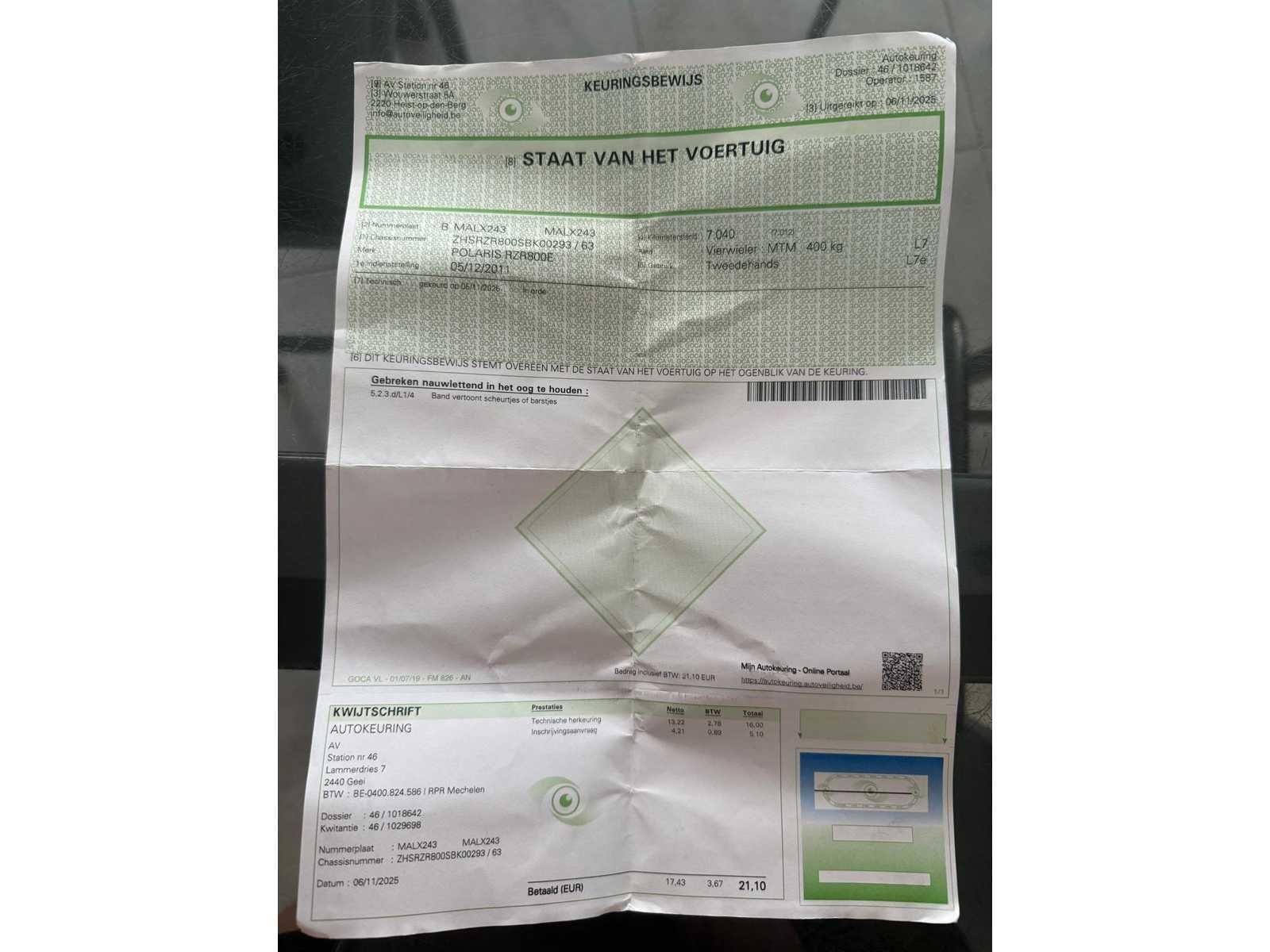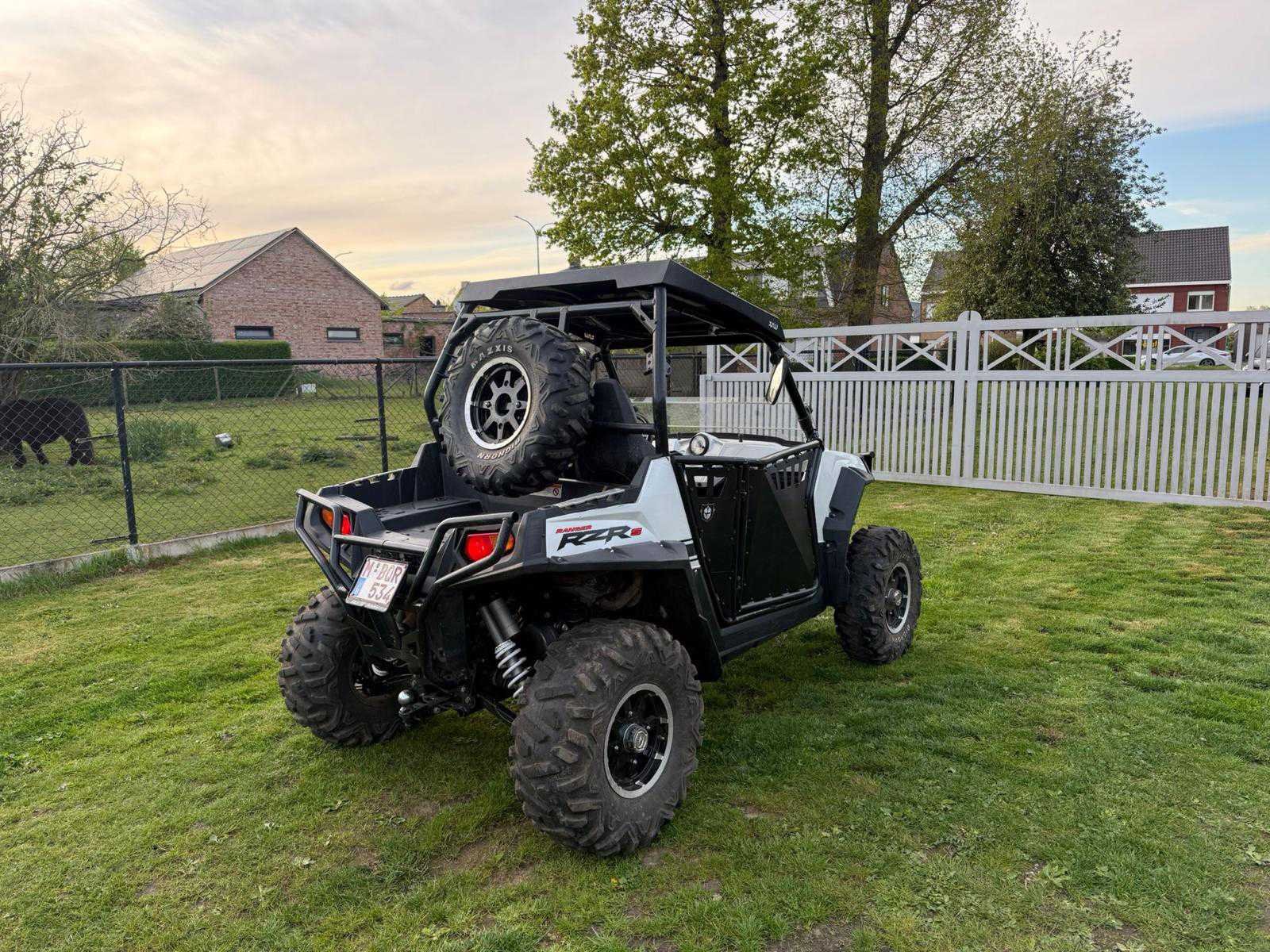 Bent u op zoek naar een betrouwbare en krachtige side-by-side die direct de weg op mag? Deze Polaris RZR 800E verkeert in uitstekende staat en is technisch volledig nagekeken. Het voertuig is officieel gehomologeerd als zware vierwieler (L7e), wat betekent dat u er met een autorijbewijs B mee op de openbare weg mag rijden - Belangrijkste kenmerken: Model: Polaris RZR 800E (L7e wegtoelating), Bouwjaar: 2011 (eerste inschrijving 05/12/2011), Motor: 760cc ProStar tweecilinder benzine, Kilometerstand: 8356km, Transmissie: Automatisch (P/R/N/L/H) met inschakelbare 4x4 (AWD), Extra opties & accessoires, Stevige zwarte sport-voorbumper, Volledige zwarte deuren voor extra veiligheid en comfort, Hardtop dak en half windscherm, Reservewiel gemonteerd op de rolkooi, Maxxis Bighorn banden op sportieve velgen - Staat van het voertuig: De RZR is op 06/11/2025 blanco gekeurd voor verkoop. Het keuringsbewijs is aanwezig en geldig. Er is slechts één kleine opmerking ‘lichte haarscheurtjes in een van de banden’ maar dit vormde geen belemmering voor de goedkeuring. Het voertuig is direct beschikbaar en klaar om in te schrijven. Alle Belgische documenten (inschrijvingsbewijs en keuringsbewijs) zijn aanwezig. Nee Merk: Polaris Model: RZR 800 E Product type: L7E Bouwjaar: 2011 Chassisnummer: ZHSRZR800SBK00293 Vermogen (kW): 15kW Afgelezen kilometerstand: 8356km Gewicht: 700kg