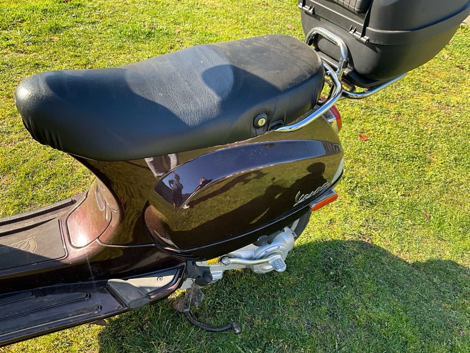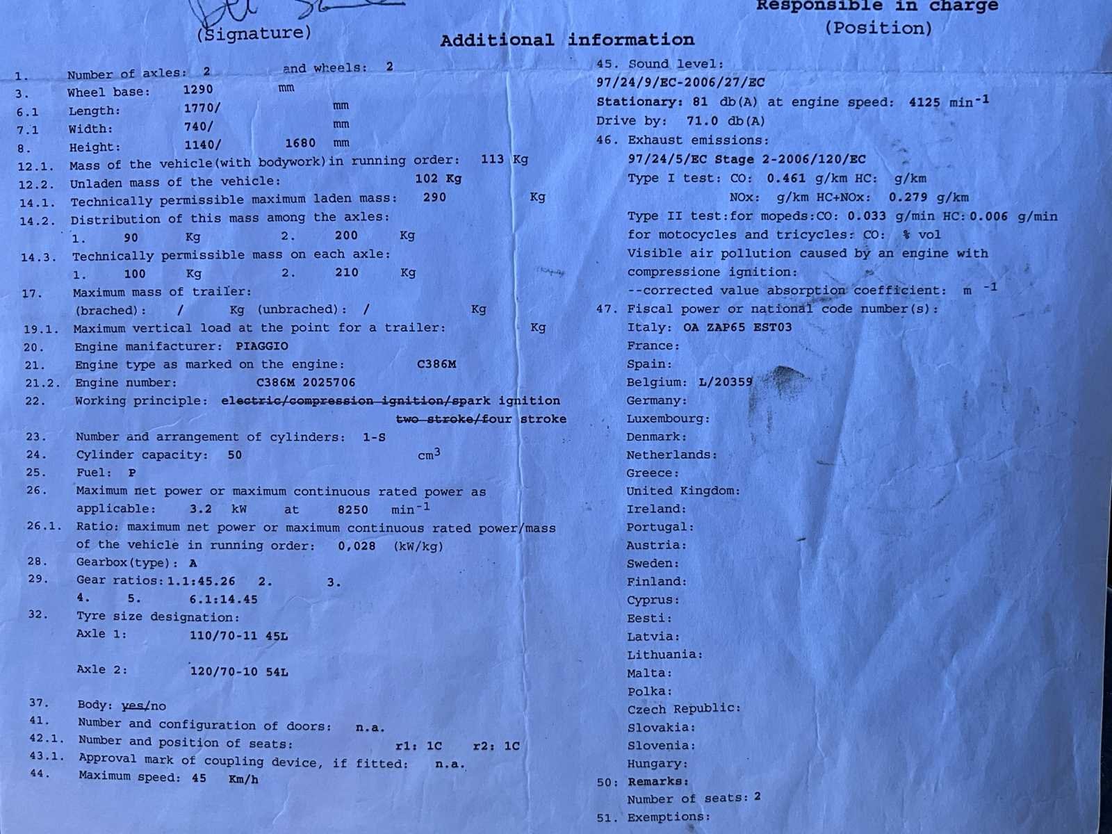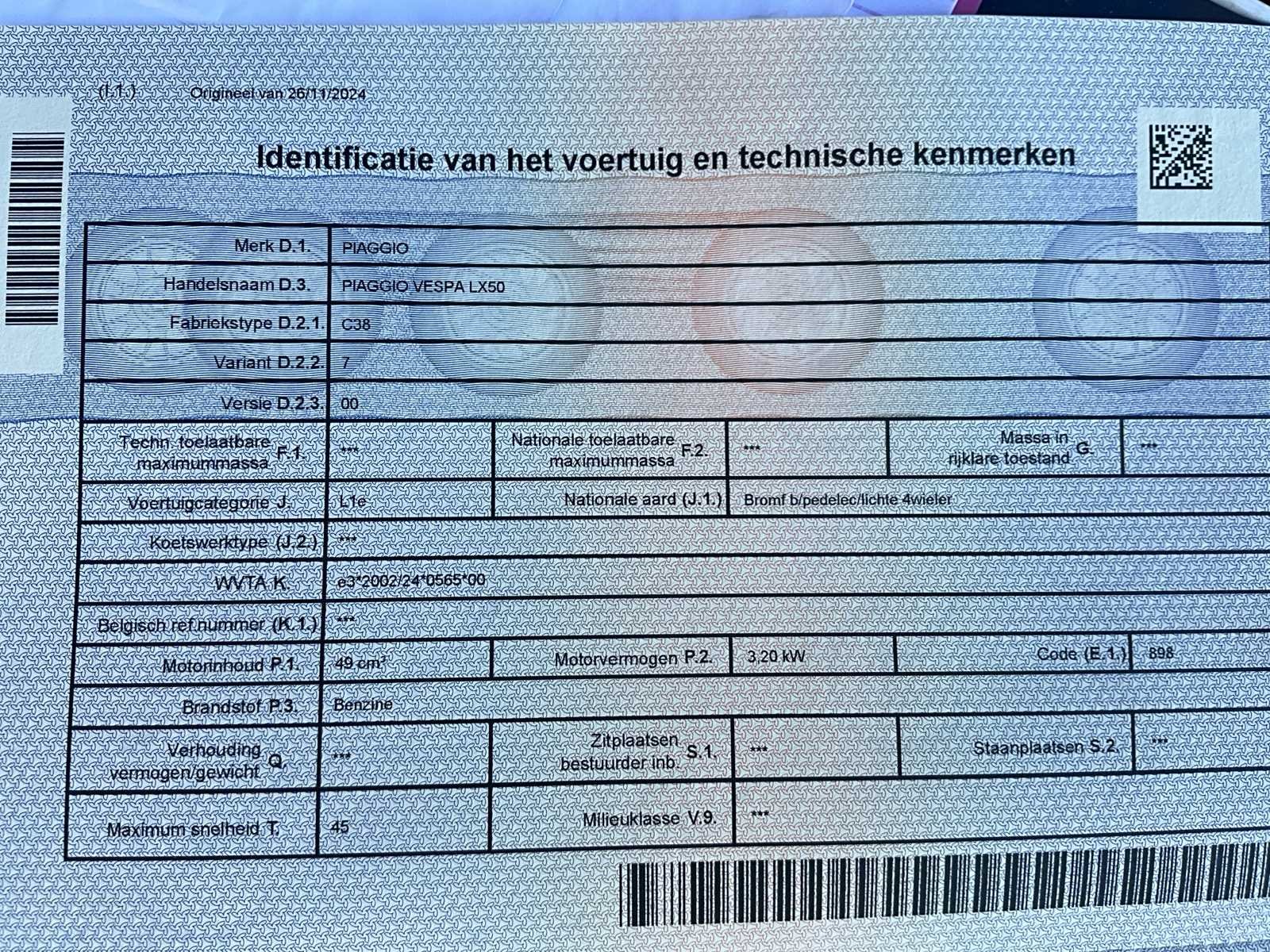 Start, rijdt perfect, schakelt automatisch, 49cc (rijbewijs B voldoende) - wat gebruikssporen aan lakwerk (zie foto’s) maar motor helemaal in orde No Merk: Piaggio Model: Vespa Type: LX50 Chassisnummer: ZAPC3870000038034 Datum eerste toelating: 17/1/2018 Bouwjaar: 2010 Transmissie: automaat Brandstof: benzine Kleur: bruin Afgelezen kilometerstand: 8075km