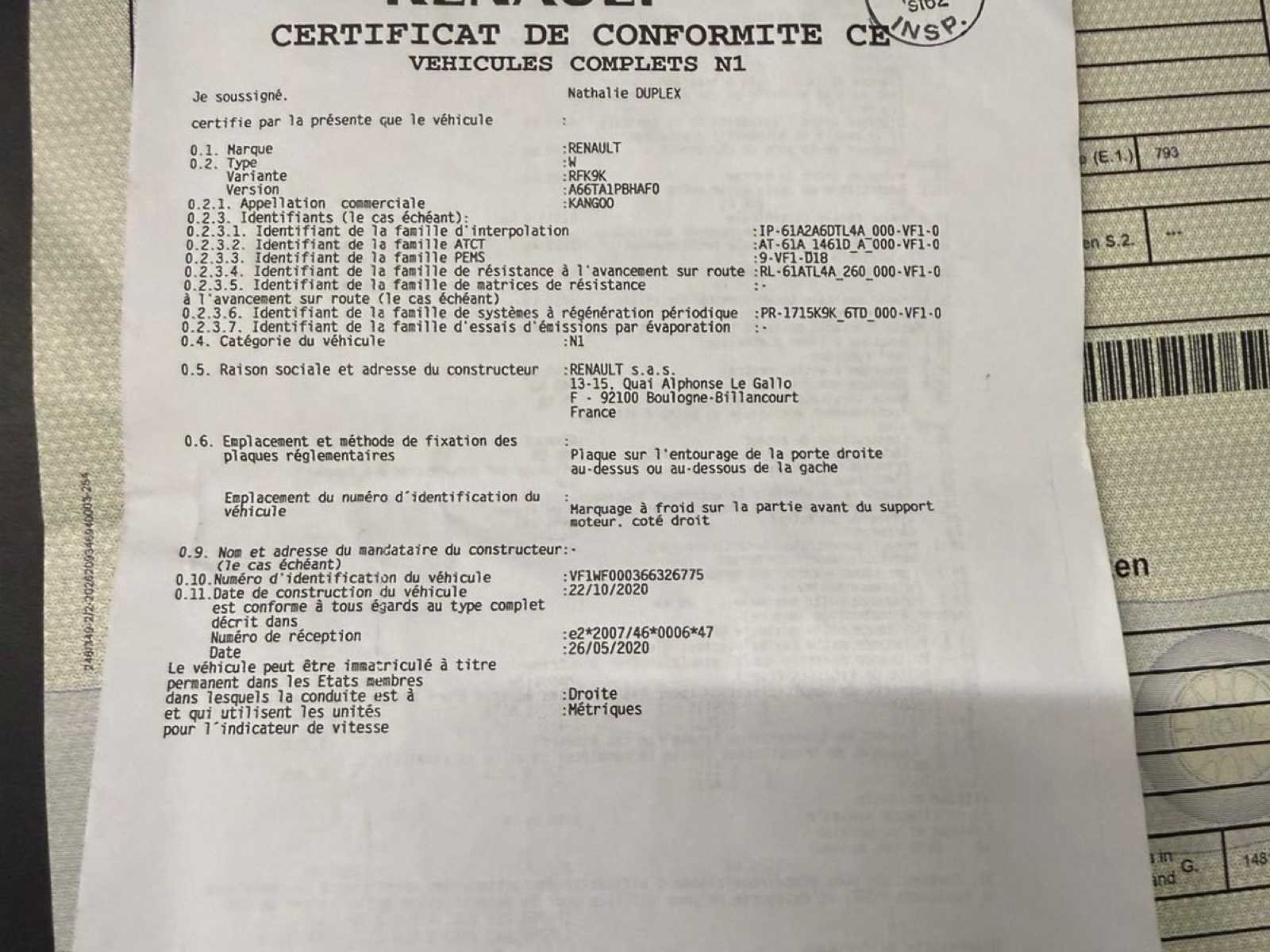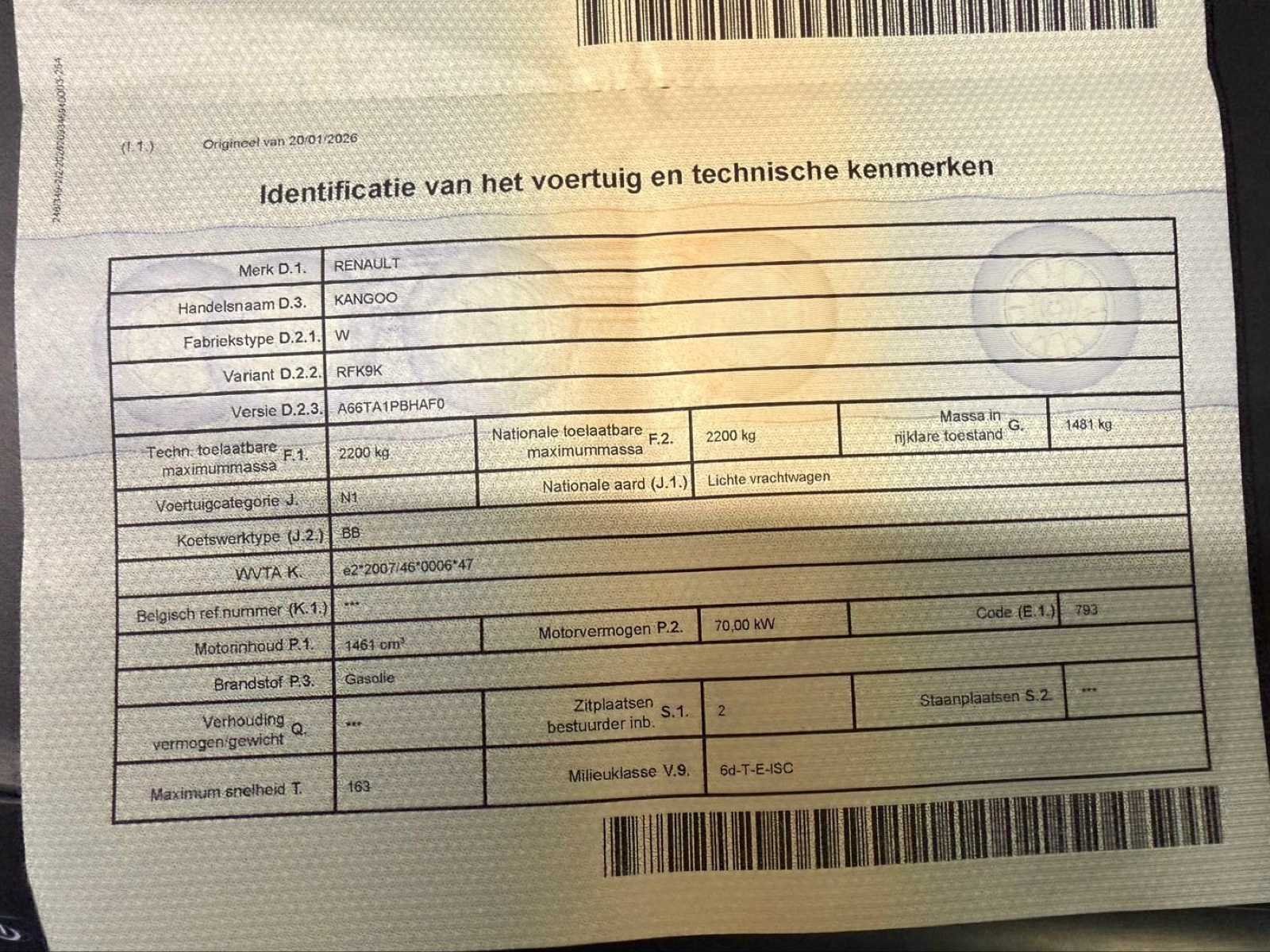 Wagen heeft slechts 77067km - start, rijdt en remt zoals het hoort - gebruikssporen carrosserie & bekleding zetel bestuurder (zie foto’s) - 6 versnellingen - COC is een kopij (indien voor België kan koper dit eenvoudig opnieuw online aanvragen) No Merk: Renault Model: Kangoo Type: lichte vracht Bouwjaar: 2020 Afgelezen kilometerstand: 77067km Cilinderinhoud: 1461cc Vermogen (kW): 70kW Brandstof: diesel Chassisnummer: VF1WF000266326833 Datum eerste toelating: 14/12/2020 Aantal zitplaatsen: 2 Kleur: wit Transmissie: manueel Emissieklasse: Euro 6d Aantal deuren: 5 Aantal sleutels: 1 Gelijkvormigheidsattest aanwezig: true Start en rijdt: ja Vavato voert geen technische keuring uit.: true Inschrijvingsbewijs - deel 1 : aanwezig Inschrijvingsbewijs - deel 2: aanwezig