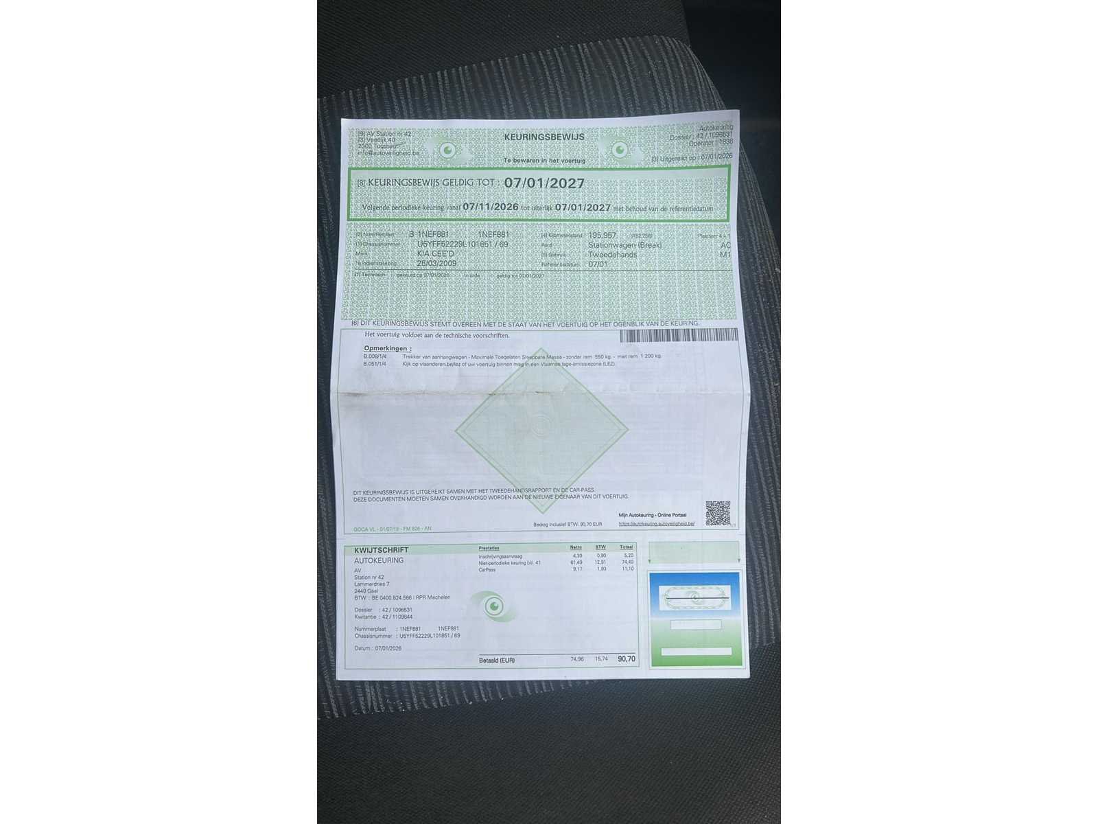 Groot onderhoud gehad in 09/2025 Ingevuld onderhoudsboek Parkeersensoren achter Climate Control Trekhaak Nee Merk: Kia Model: Ceed Bouwjaar: 2009 Afgelezen kilometerstand: 196436km Cilinderinhoud: 1591cc Vermogen (kW): 85kW Brandstof: benzine Chassisnummer: U5YFF52229L101851 Datum eerste toelating: 25/03/2009 Aantal zitplaatsen: 5 Aantal deuren: 5 Nationaliteit documenten: Belgisch Start en rijdt: Ja Keuringsrapport geldig tot: 07/01/2027 Vavato voert geen technische keuring uit.: true Inschrijvingsbewijs - deel 1 : Aanwezig Inschrijvingsbewijs - deel 2: Aanwezig