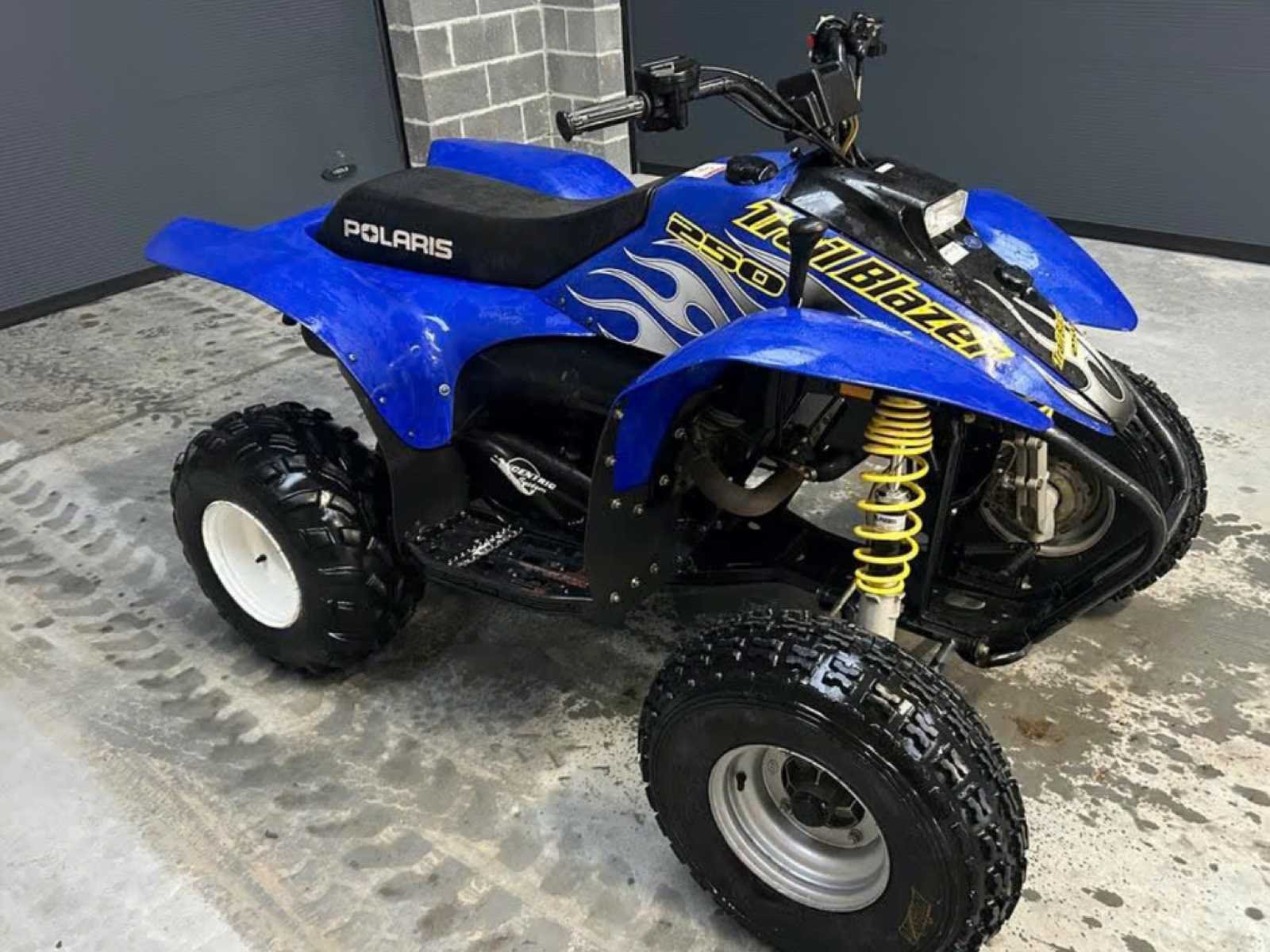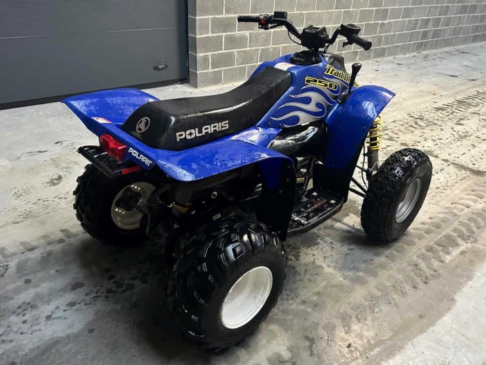 Quad Polaris trail blazer 250 - 250cc 2-takt eencilindermotor - Elektrische starter - Nieuwe batterij - Werkt goed - Zeer weinig geserveerd - Niet goedgekeurd Verkocht zoals het is - zie foto's Internetbeschrijving: De Polaris Trail Blazer 250 is een sportquad (ATV) die tussen 1990 en 2006 werd geproduceerd, bekend om zijn veelzijdigheid, betrouwbaarheid en gebruiksgemak. 🔧 Motor en prestaties Motor: 2-takt eencilinder Cilinderinhoud: 244 cc Koeling: Lucht Vermogen: ca. 20–22 pk Start: elektrisch + lanceerder Transmissie: Automatisch (CVT / PVT) Maximale snelheid: ca. 75–90 km/u 👉 Deze quad biedt een soepele en toegankelijke rit, ideaal voor beginners en voor recreatief gebruik. ⚙️ Chassis en uitrusting Transmissie: 4x2 (achterwielaandrijving) Remmen: voor- en achterhydraulische schijven voor en achter Vering: Voorkant: McPherson-type Achter: Swingarm Banden: Voorkant: 23x7-10 Achter: 22x11-10 📏 Afmetingen en gewicht Lengte: ~190 cm Breedte: ~116 cm Hoogte: ~119 cm Wielbasis: ~121 cm Bodemvrijheid: ~14 cm Drooggewicht: ~190–210 kg ⛽ Capaciteit en autonomie Brandstoftank: 13,2 liter Matige consumptie voor een tweetakt Goede batterijduur voor wandelen of licht werk 🧰 Gebruik De Trail Blazer 250 is ontworpen om: Off-road wandelen Sport, vrije tijd Kleine klusjes (licht vervoer, tractie) Introductie tot quadbiken 👉 Hij wordt gewaardeerd om zijn wendbaarheid, stabiliteit en eenvoudige onderhoud. 👍 Hoogtepunten Betrouwbaar en robuust Gemakkelijk te rijden (automatische versnellingsbak) Goede macht/controle compromis Gemakkelijk verkrijgbare onderdelen 👎 Zwakke punten 2-taktmotor (brandstofverbruik + specifiek onderhoud) Minder efficiënt dan recente quads Niet geschikt voor zware oversteek 📝 Samenvatting De Polaris Trail Blazer 250 is een lichtgewicht en veelzijdige quad, ideaal voor beginners of voor recreatief gebruik. Hij combineert eenvoud, robuustheid en rijplezier zonder extreme prestaties te zoeken. No Merk: Polaris Model: Trail blazer 250 Vermogen (kW): 12kW Cilinderinhoud: 300cc