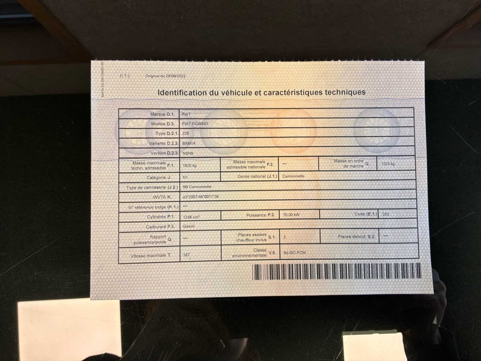 Schaalbare kilometer, het voertuig zal volgende week een technische inspectie ondergaan No Merk: Fiat Model: Fiorino Type: 225 Bouwjaar: 2022 Afgelezen kilometerstand: 119358km Cilinderinhoud: 1248cc Vermogen (kW): 70kW Brandstof: Diesel Chassisnummer: ZFA22500006X56207 Datum eerste toelating: 28/09/2022 Kleur: Zwart Transmissie: Handboek Stuurwiel: Links Aantal deuren: 4 Carrosserie: Pick-up truck Nationaliteit documenten: België Gelijkvormigheidsattest aanwezig: true Vavato voert geen technische keuring uit.: true Airconditioning: true Inschrijvingsbewijs - deel 1 : Oké Inschrijvingsbewijs - deel 2: Oké