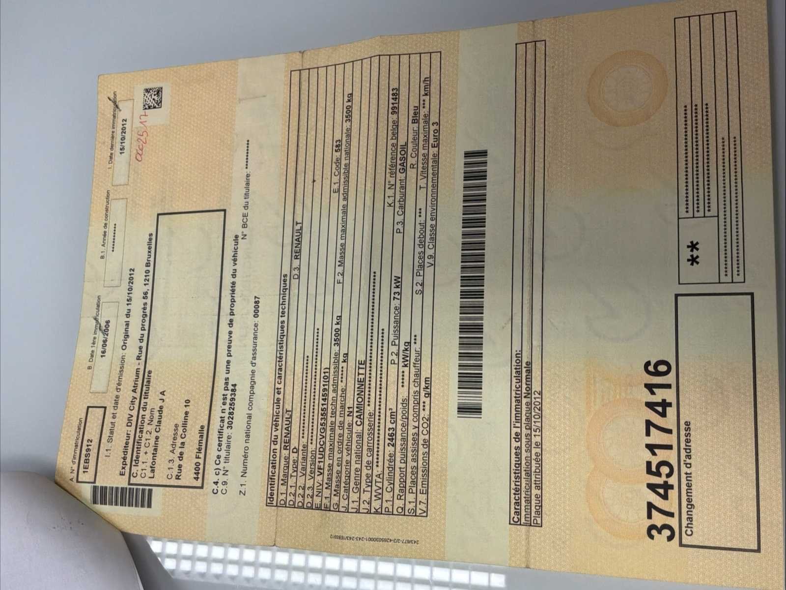 Non Merk: Renault Model: ED35 Type: Master Afgelezen kilometerstand: 147912km Cilinderinhoud: 2463cc Vermogen (kW): 73kW Brandstof: Diesel Chassisnummer: VF1EDCUCG53651459 Laadvermogen: 3500kg Aandrijving: Ja Aantal zitplaatsen: 3 Kleur: Blauw Transmissie: Handboek Stuurwiel: Links Aantal deuren: 3 Aantal sleutels: 2 Ledig gewicht: 1960kg Aantal cilinders: 4 Nationaliteit documenten: België