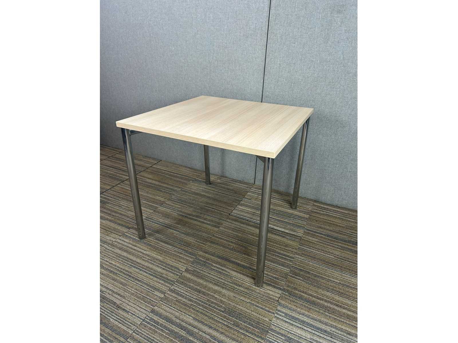 Mooie kantinetafel/bijzettafel met chrome onderstel , vierpoot, in goede staat Nee Merk: Kusch Co Model: vierkant Kleur: esdoorn Gewicht: 10kg Lengte: 80cm Breedte: 80cm Hoogte: 74cm Materiaal: melamine