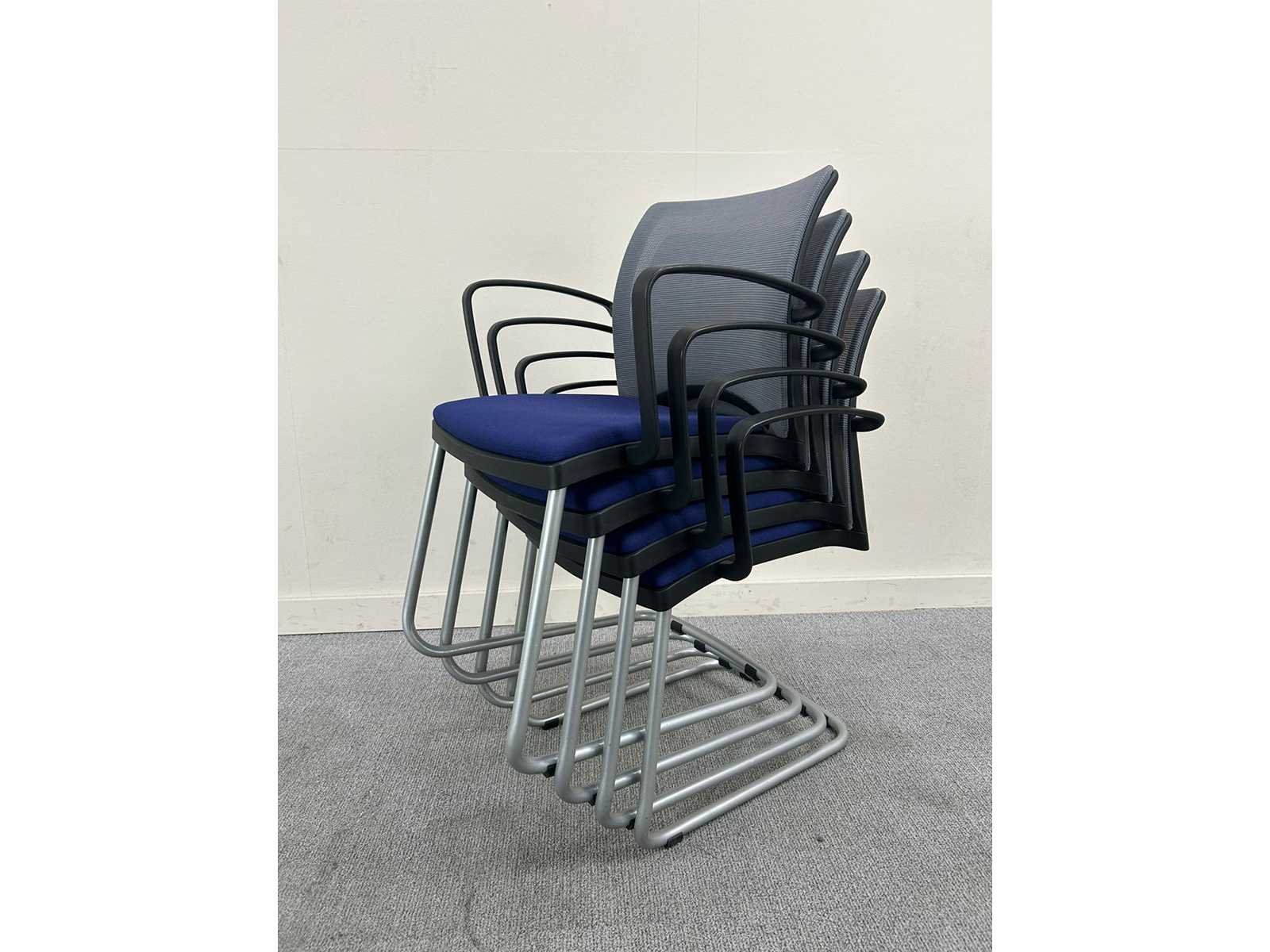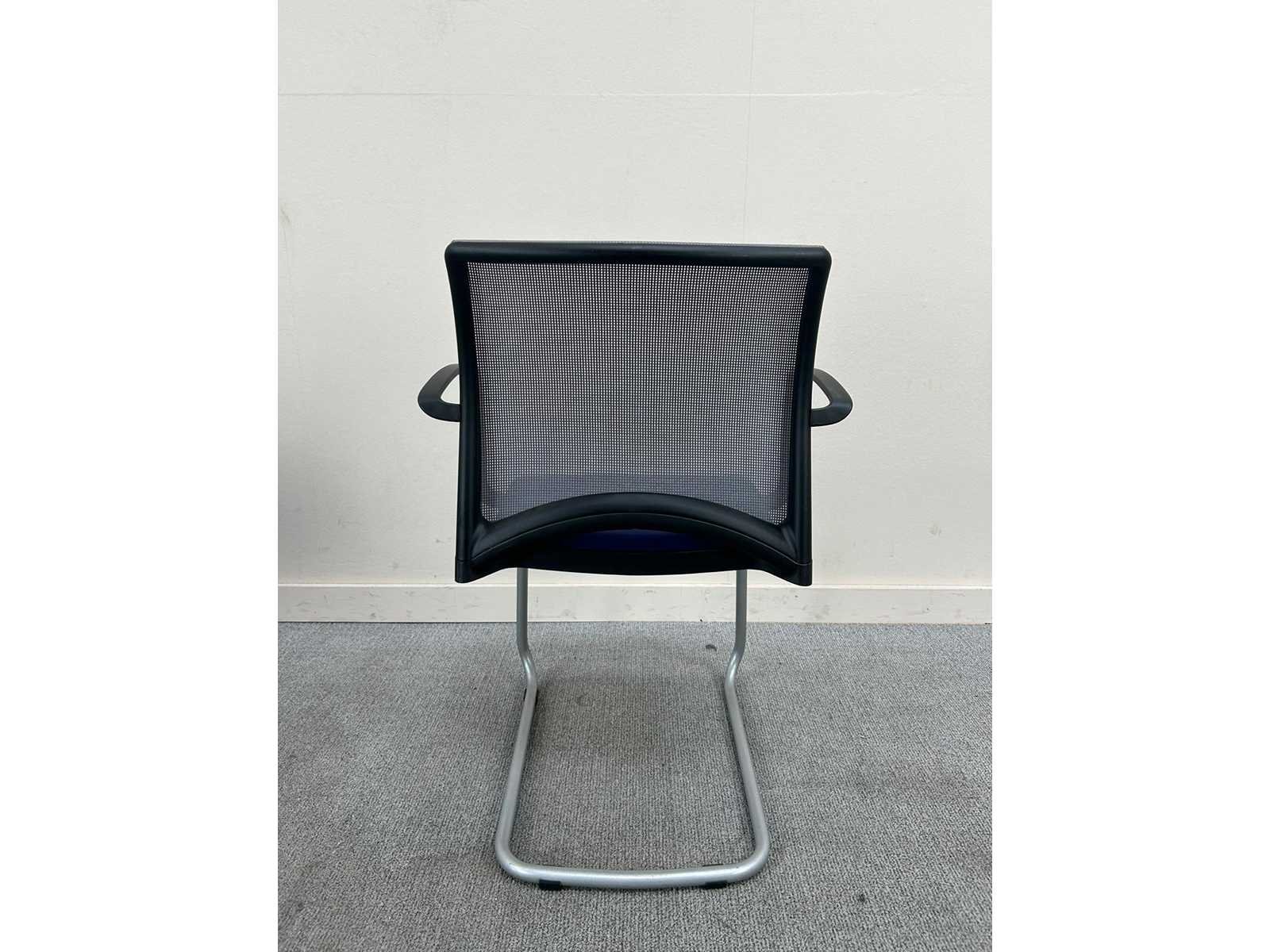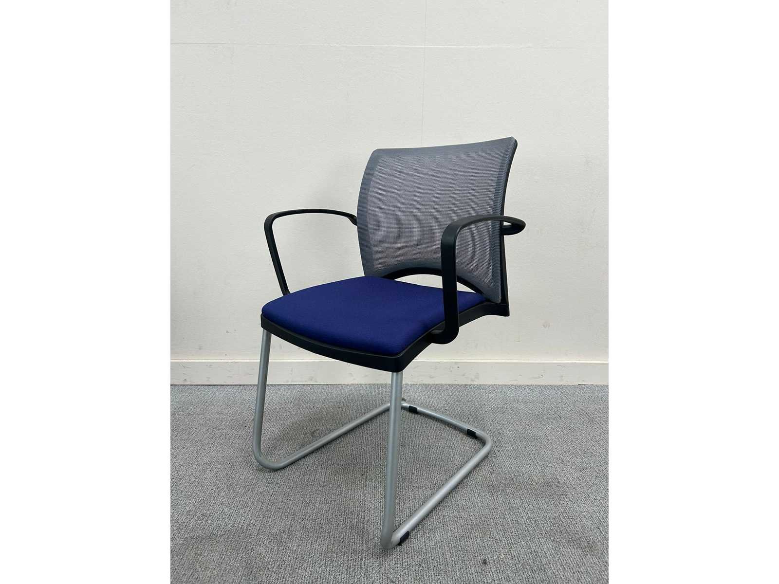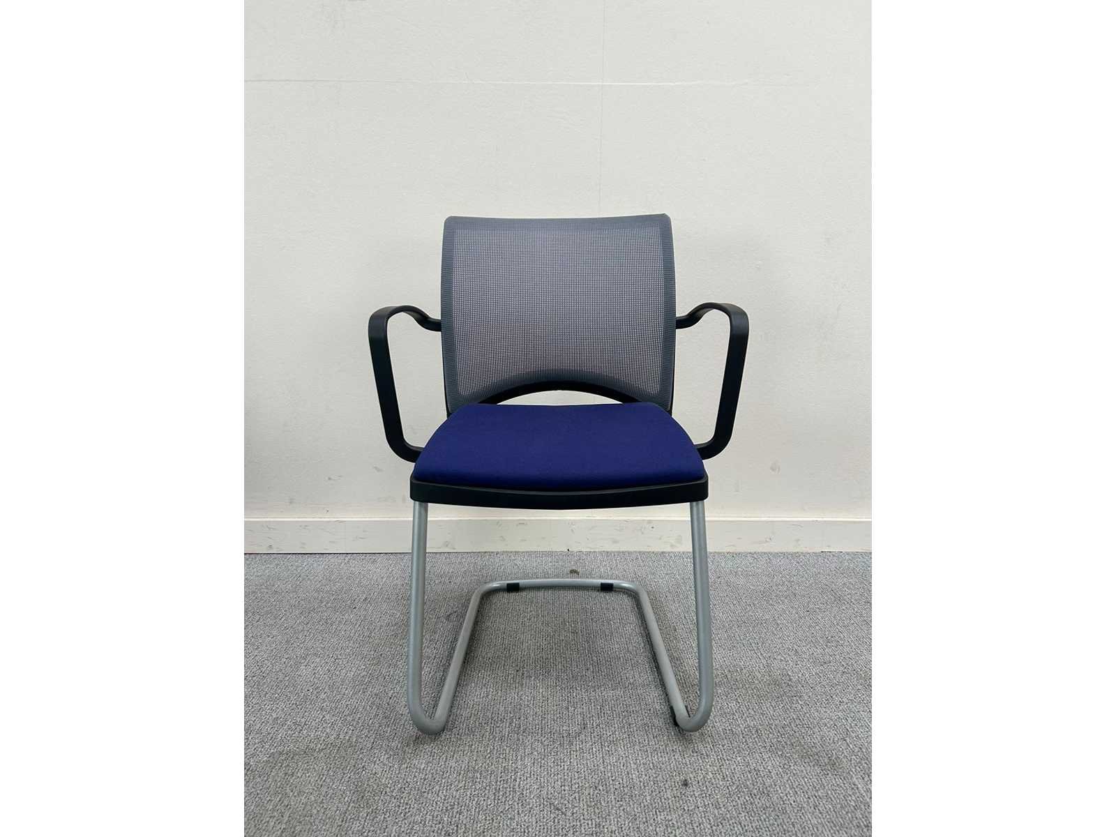 Viasit vergaderstoel, blauwe zitting , grijze mesh rug, stapelbaar met armleuningen Nee Merk: VIASIT Type: slede Kleur: blauw/grijs Materiaal: textiel/mesh