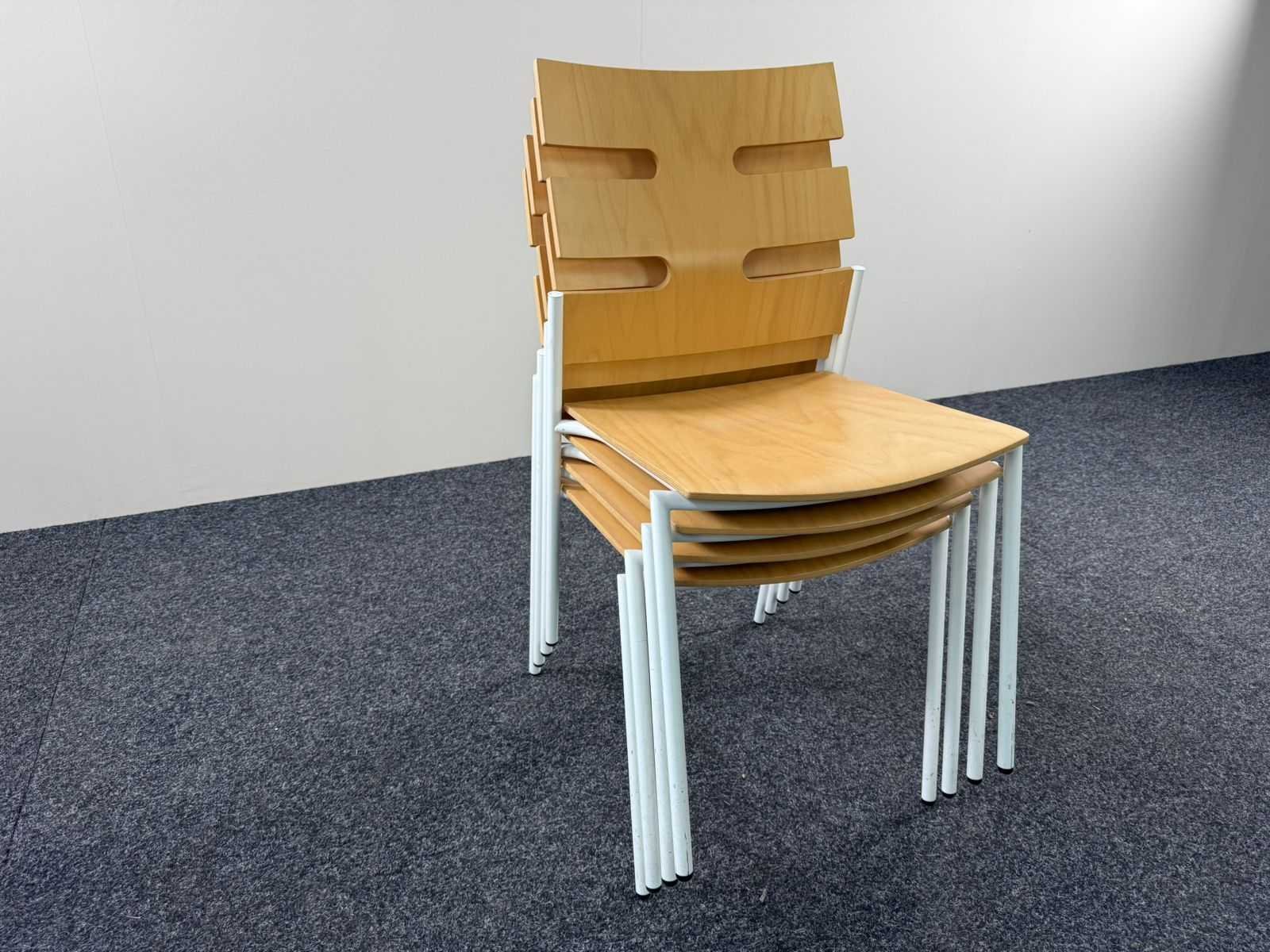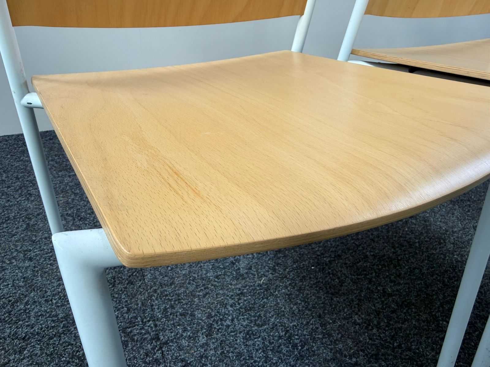 Omschrijving: Set van 9 designstoelen van het merk Casala, uitgevoerd met een gebogen houten zit en rug en een wit metalen frame. De karakteristieke open rugleuning geeft de stoelen een moderne en luchtige uitstraling. Geschikt voor vergaderruimtes, wachtruimtes, kantines of horeca. Kenmerken: Merk: Casala Zitting en rug: gelamineerd hout (lichte houtkleur) Onderstel: wit metalen frame Stapelbaar ontwerp Tijdloos en functioneel design Nee Fabrikant: CASALA Materiaal: hout