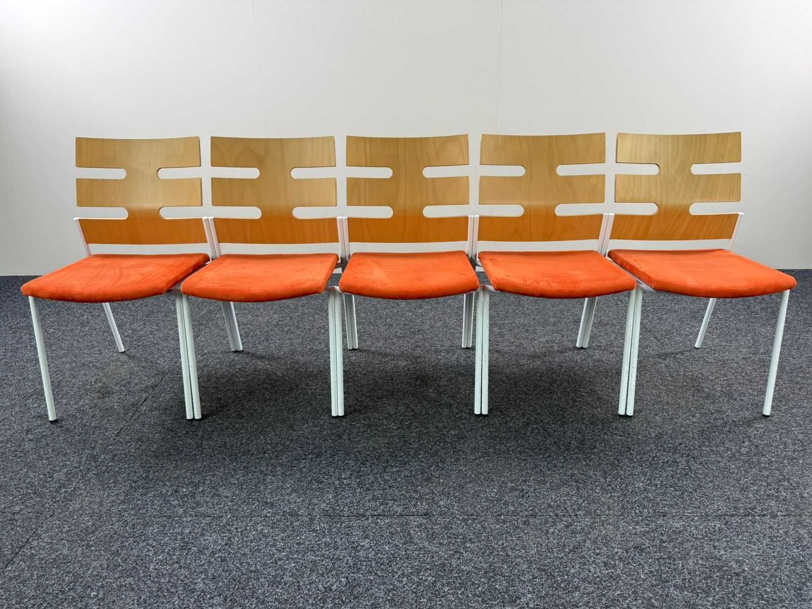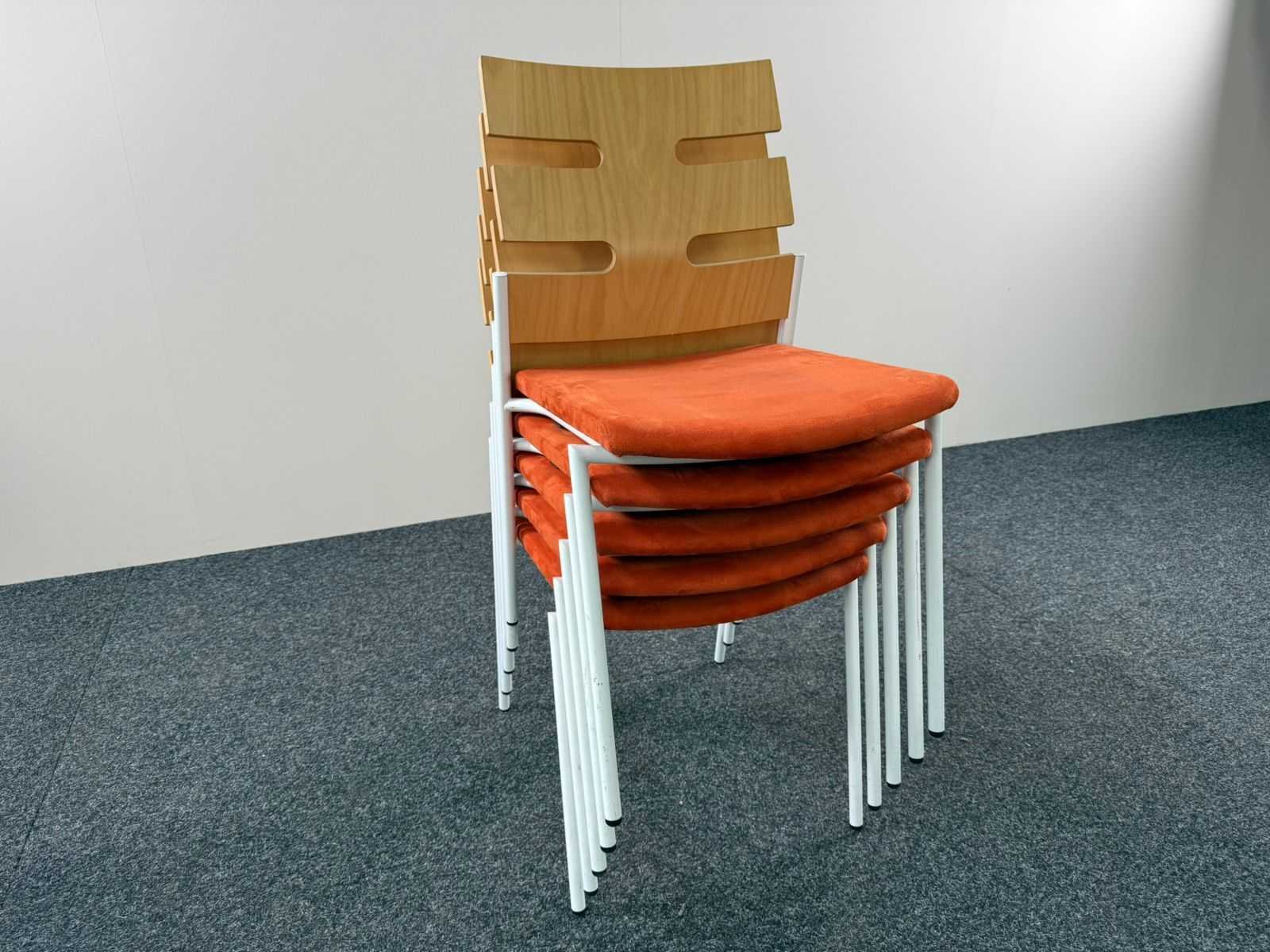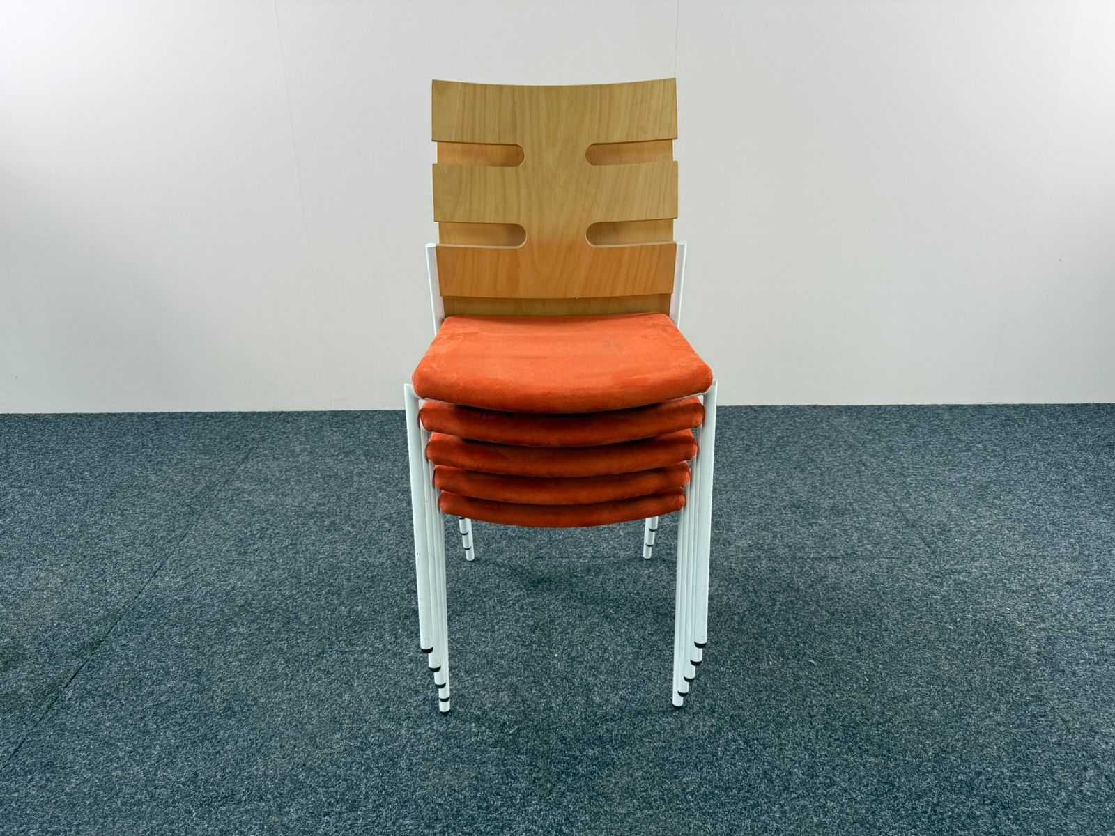 Omschrijving: Set van 5 designstoelen van het merk Casala, uitgevoerd met een gebogen houten zit en rug en een wit metalen frame. De karakteristieke open rugleuning geeft de stoelen een moderne en luchtige uitstraling. Geschikt voor vergaderruimtes, wachtruimtes, kantines of horeca. Kenmerken: Merk: Casala Zitting : gestoffeerd rug: gelamineerd hout (lichte houtkleur) Onderstel: wit metalen frame Stapelbaar ontwerp Tijdloos en functioneel design Nee Fabrikant: CASALA