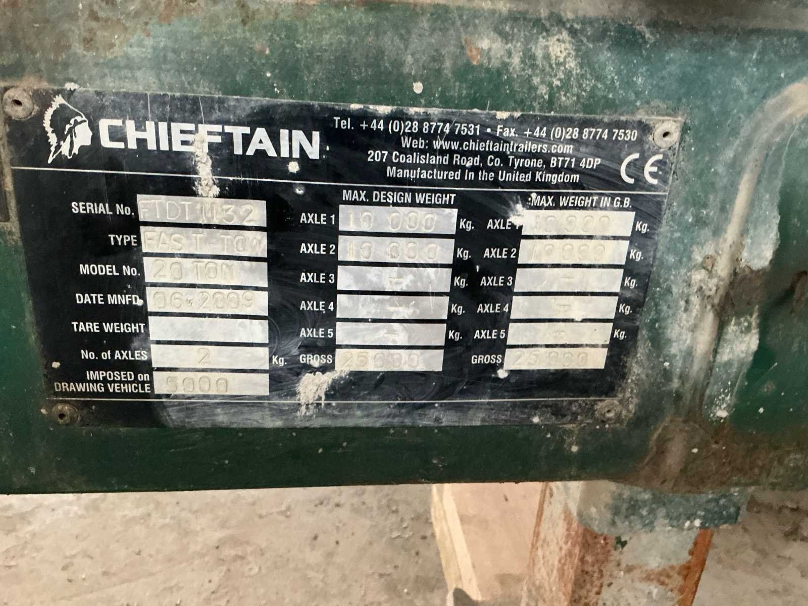 Perfect werkende 2 assige Chieftain. Vervoer van zware machines of materiaal achter tractors • Industrie‑ of bouwtransport • Intern gebruik bij logistiek of op sites No Merk: Chieftain Type: FAST TO LOW Bouwjaar: 2009 Serienummer: FTDT U32 Opslagcapaciteit: 8m³ Laadvermogen: 15800kg Eigen gewicht: 3200kg Totaal max. gewicht: 19t Laadhoogte: 1m Max. snelheid: 50km/h Luchtdrukremmen: true Hydraulische remmen: true Totale afmeting L: 640mm Totale afmeting Breedte: 250mm Totale afmeting Hoogte: 230mm