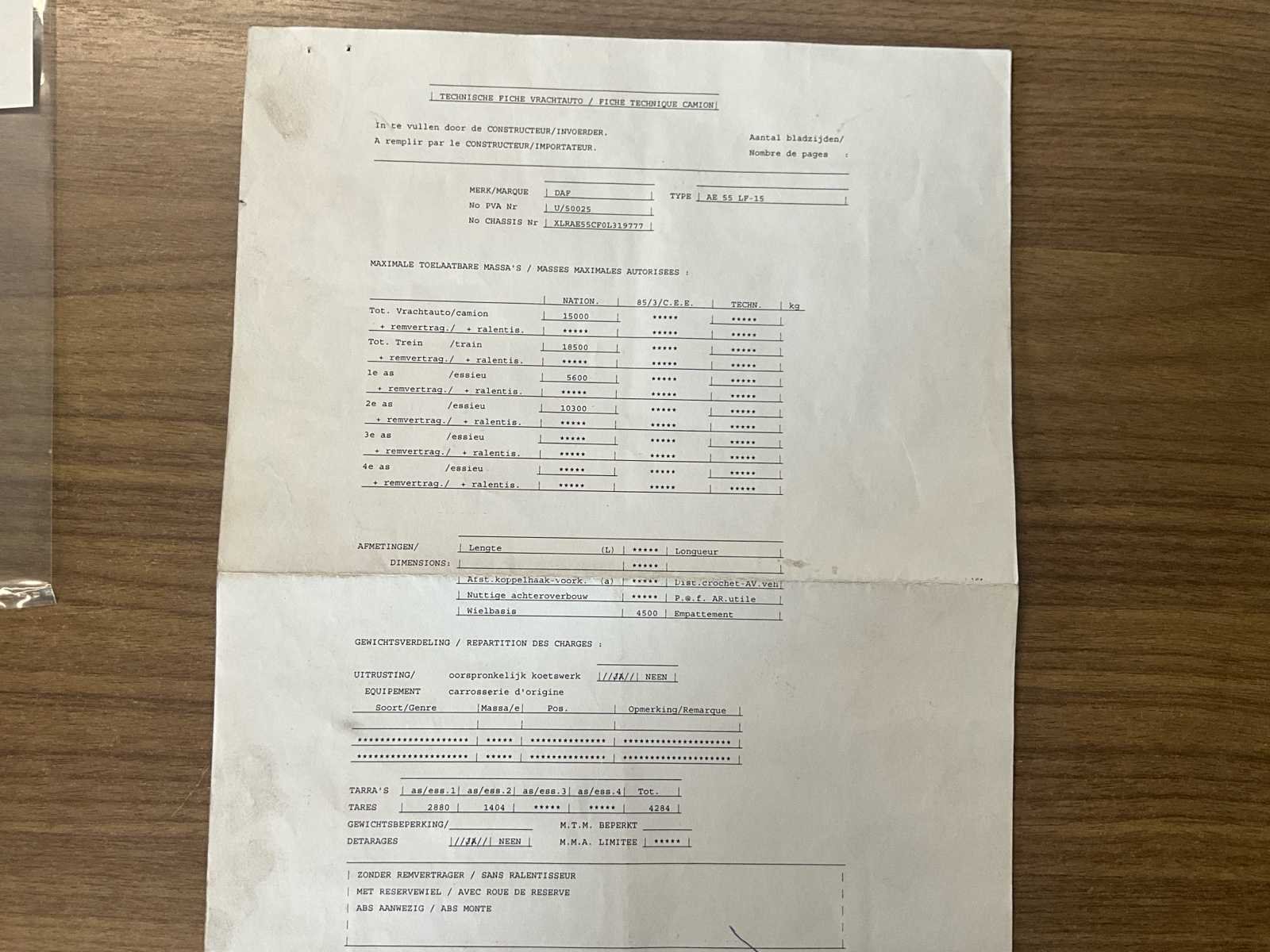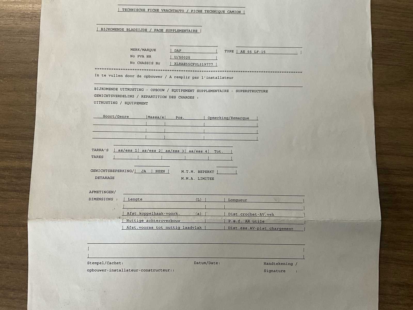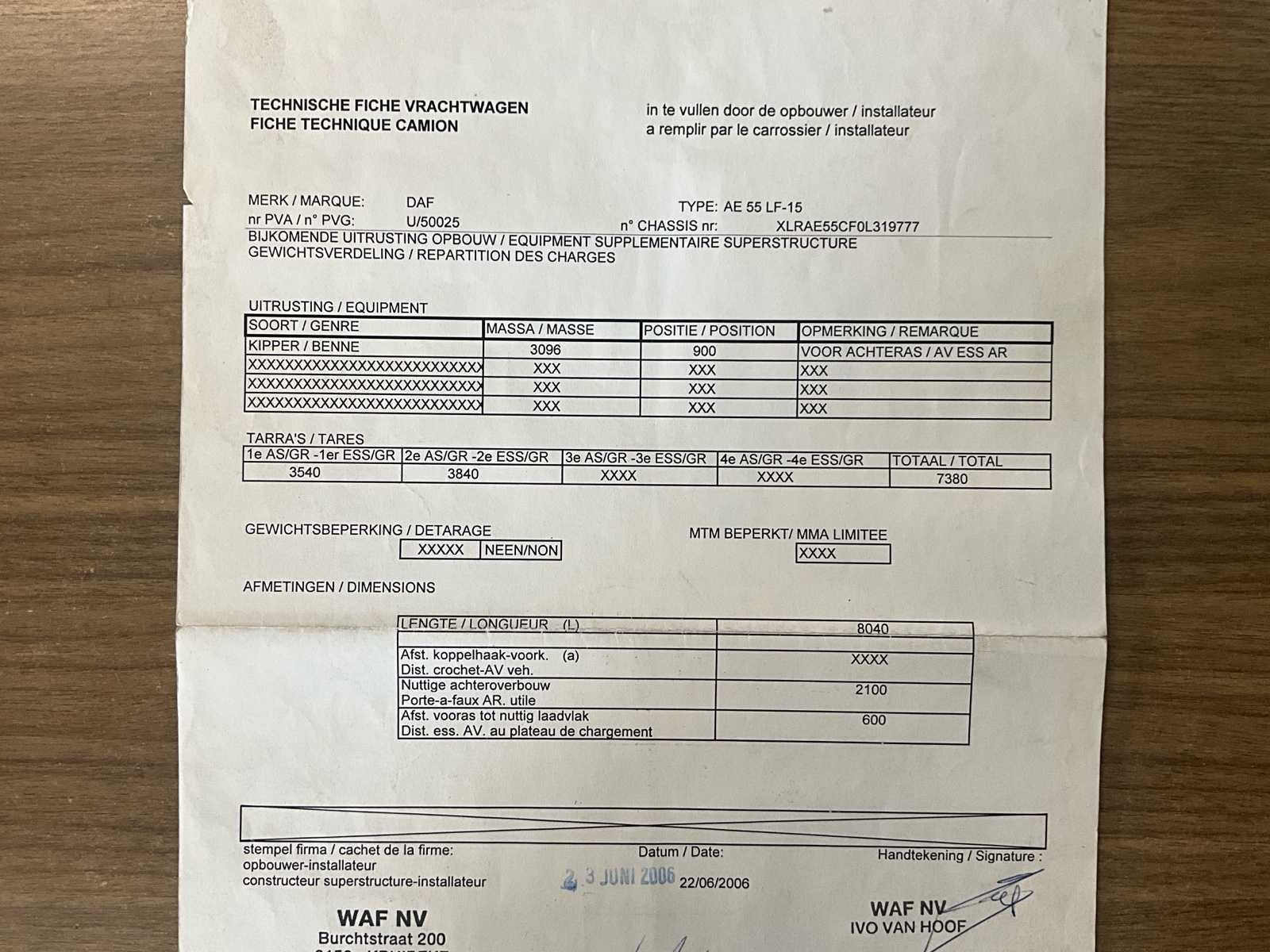 Start, rijdt, remt, kipfunctie werkt - melding “ABS-storing” dashboard (niet verder onderzocht) + klink binnenkant deur bestuurder dient gerepareerd No Merk: DAF Type: AE55 LF-15 open bak - kipper Bouwjaar: 2006 Chassisnummer VIN: XLRAE55CF0L319777 Cilinderinhoud: 5880cc Kilometerstand bij opname: 142558km Datum eerste toelating: 20/6/2006 Aantal assen: 2 Fuel Type: Diesel Laadvermogen: 7540kg Emissieklasse: Euro 3 Eigen gewicht: 7460kg Totale afmeting L: 8040mm Nationaliteit documenten: B Kentekenpapieren compleet?: true Aantal zitplaatsen: 2 Handgeschakelde versnellingsbak: true
