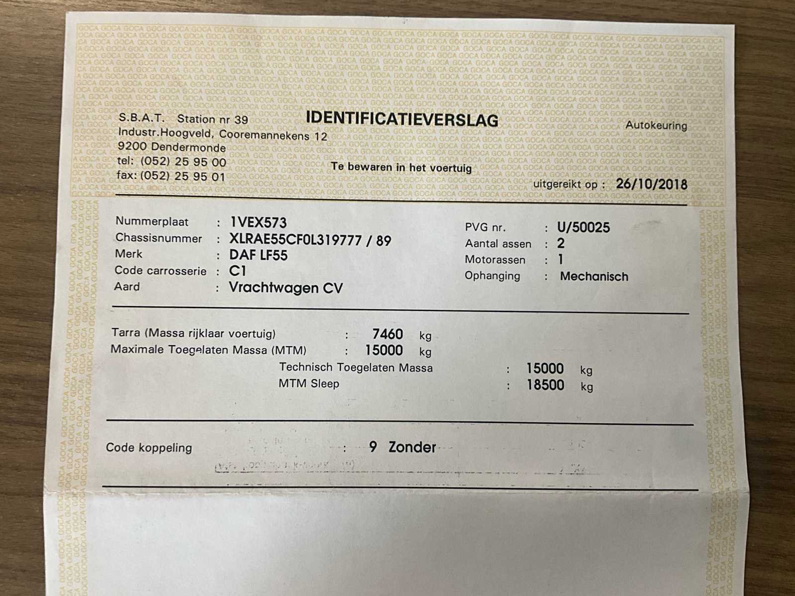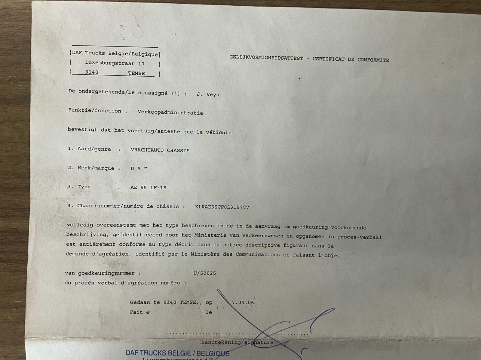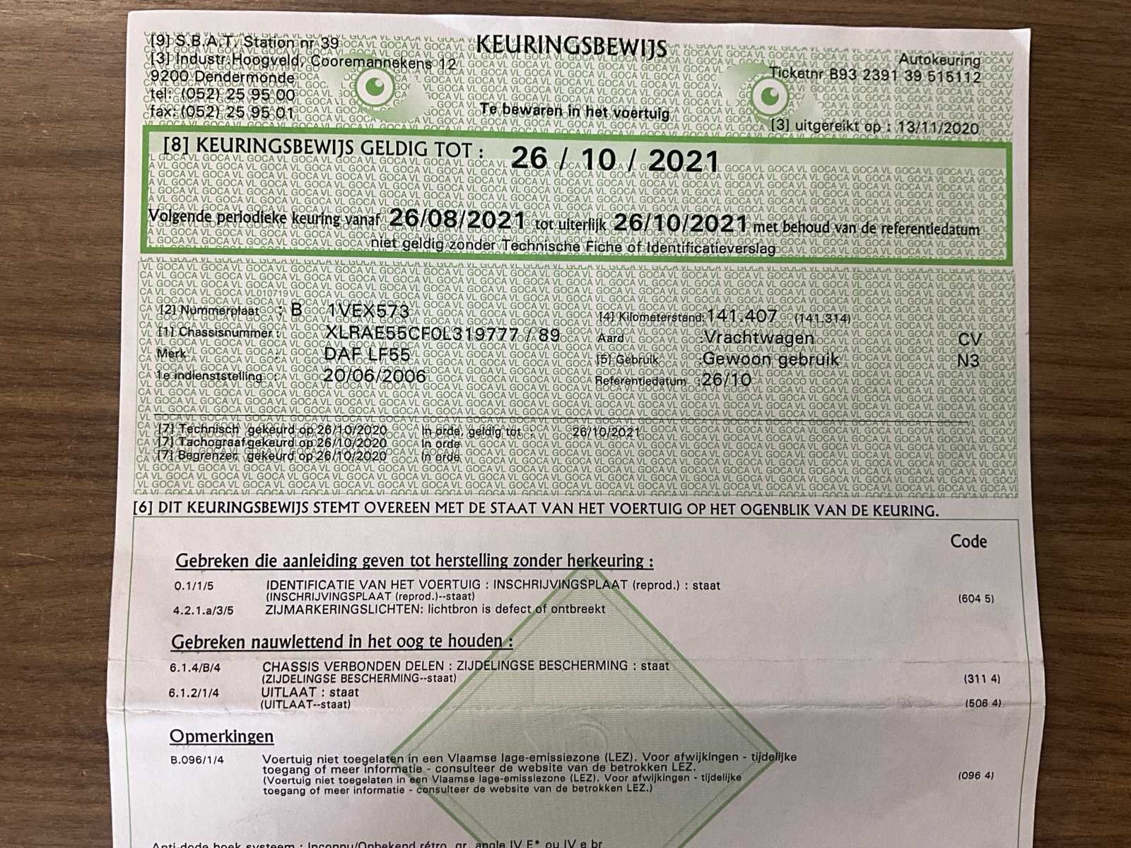 Start, rijdt, remt, kipfunctie werkt - melding “ABS-storing” dashboard (niet verder onderzocht) + klink binnenkant deur bestuurder dient gerepareerd No Merk: DAF Type: AE55 LF-15 open bak - kipper Bouwjaar: 2006 Chassisnummer VIN: XLRAE55CF0L319777 Cilinderinhoud: 5880cc Kilometerstand bij opname: 142558km Datum eerste toelating: 20/6/2006 Aantal assen: 2 Fuel Type: Diesel Laadvermogen: 7540kg Emissieklasse: Euro 3 Eigen gewicht: 7460kg Totale afmeting L: 8040mm Nationaliteit documenten: B Kentekenpapieren compleet?: true Aantal zitplaatsen: 2 Handgeschakelde versnellingsbak: true