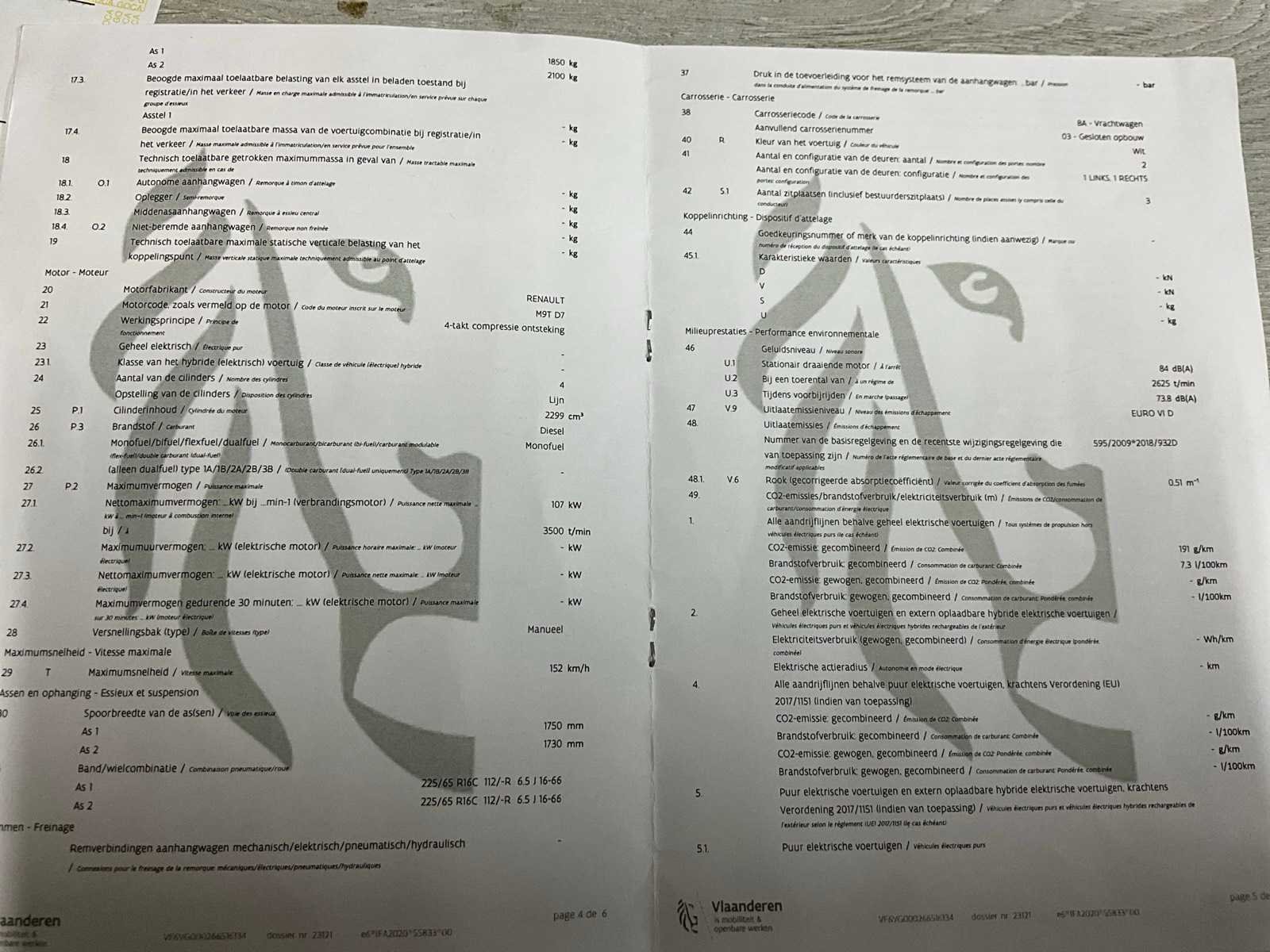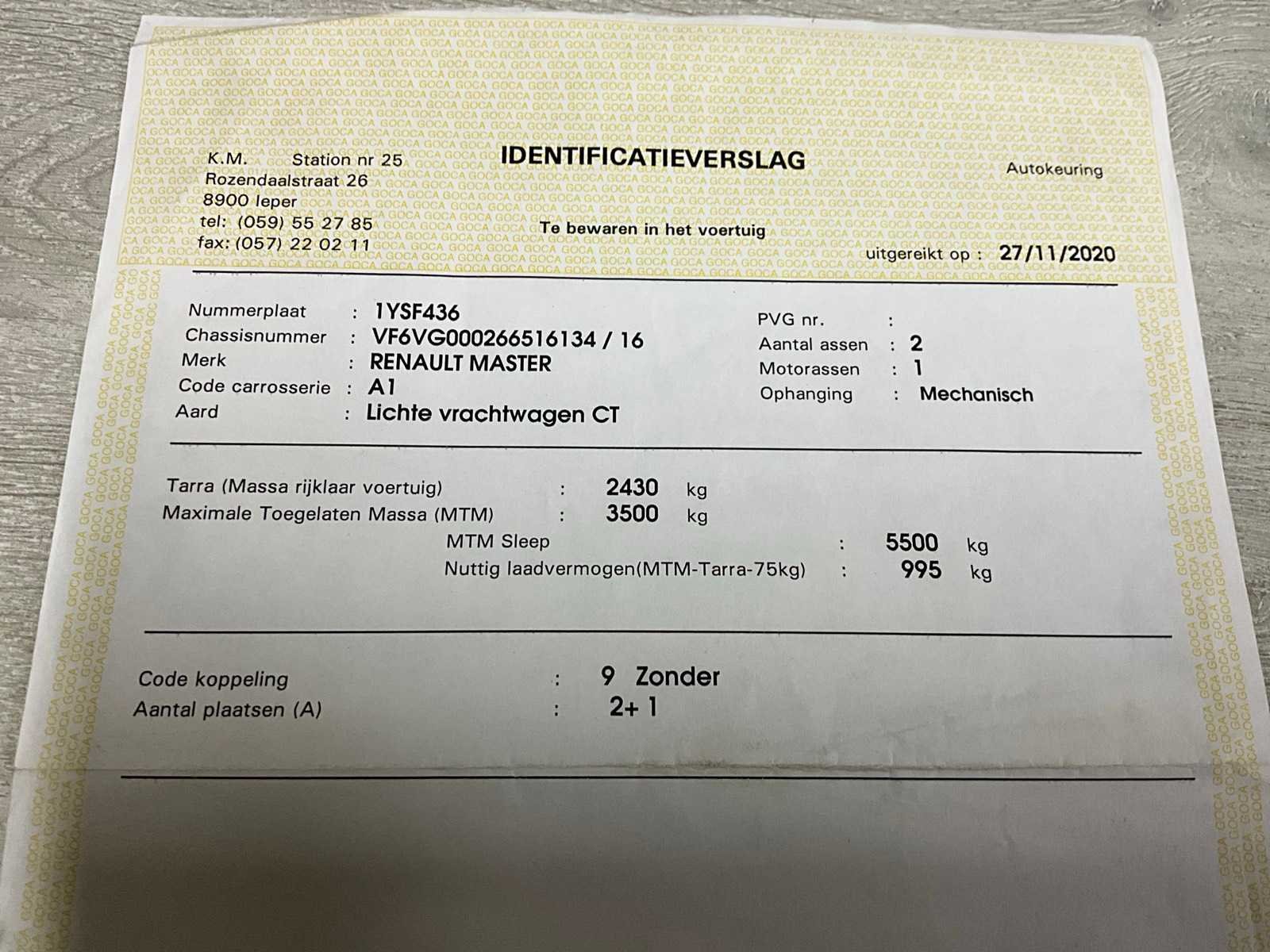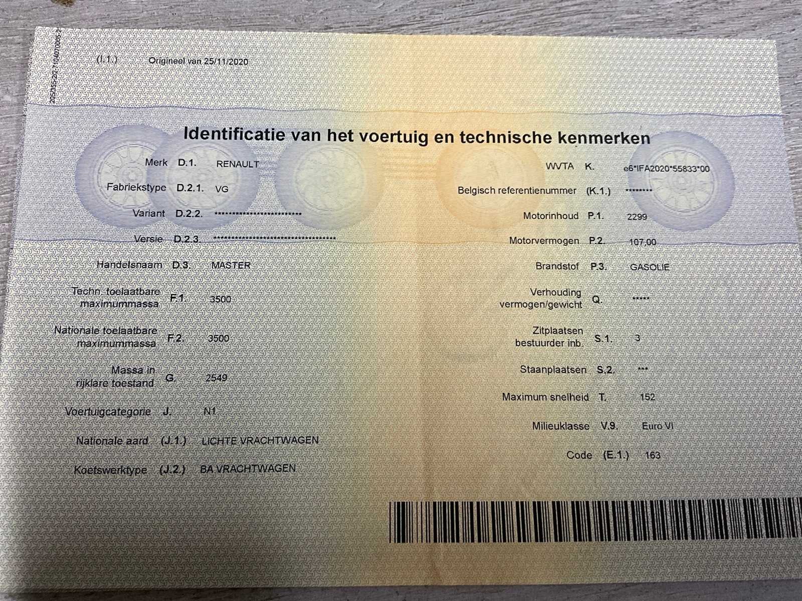 Technische keuring dd. 6/12/2024 op 448779km. met slechts 1 opmerking 8.2.2/A/5. - eerste en tweede versnelling maakt lawaai - 6 versnellingen - beschadiging aan beide spiegels maar functioneel - met airco Nee Merk: Renault Model: Master Type: lichte vracht Bouwjaar: 2020 Afgelezen kilometerstand: 521571km Cilinderinhoud: 2299cc Vermogen (kW): 107kW Brandstof: diesel Chassisnummer: VF6VG000266516134 Laadvermogen: 995kg Datum eerste toelating: 25/11/2020 Aantal zitplaatsen: 3 Transmissie: Handgeschakeld Emissieklasse: Euro 6 Aantal deuren: 2 Ledig gewicht: 2430kg Nationaliteit documenten: B Gelijkvormigheidsattest aanwezig: true Start en rijdt: ja Keuringsrapport geldig tot: 27/11/2025 Zichtbare schade: ja Vavato voert geen technische keuring uit.: true Airconditioning: true Navigatie: true Inschrijvingsbewijs - deel 1 : Aanwezig Inschrijvingsbewijs - deel 2: Aanwezig
