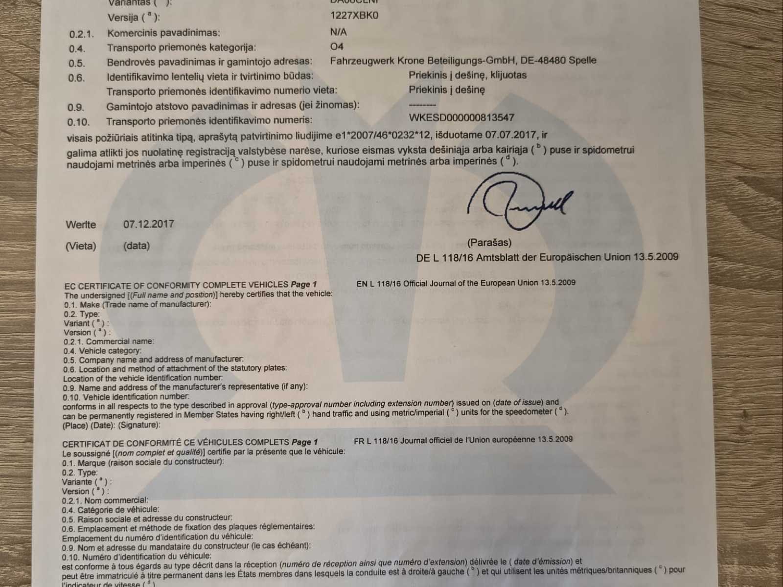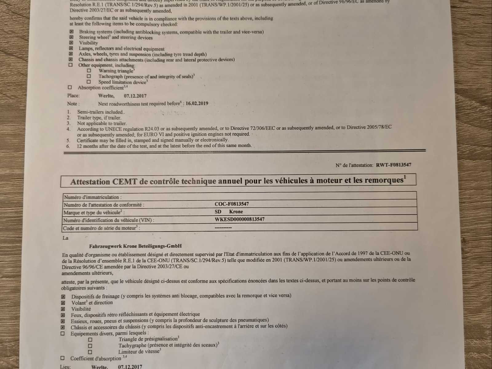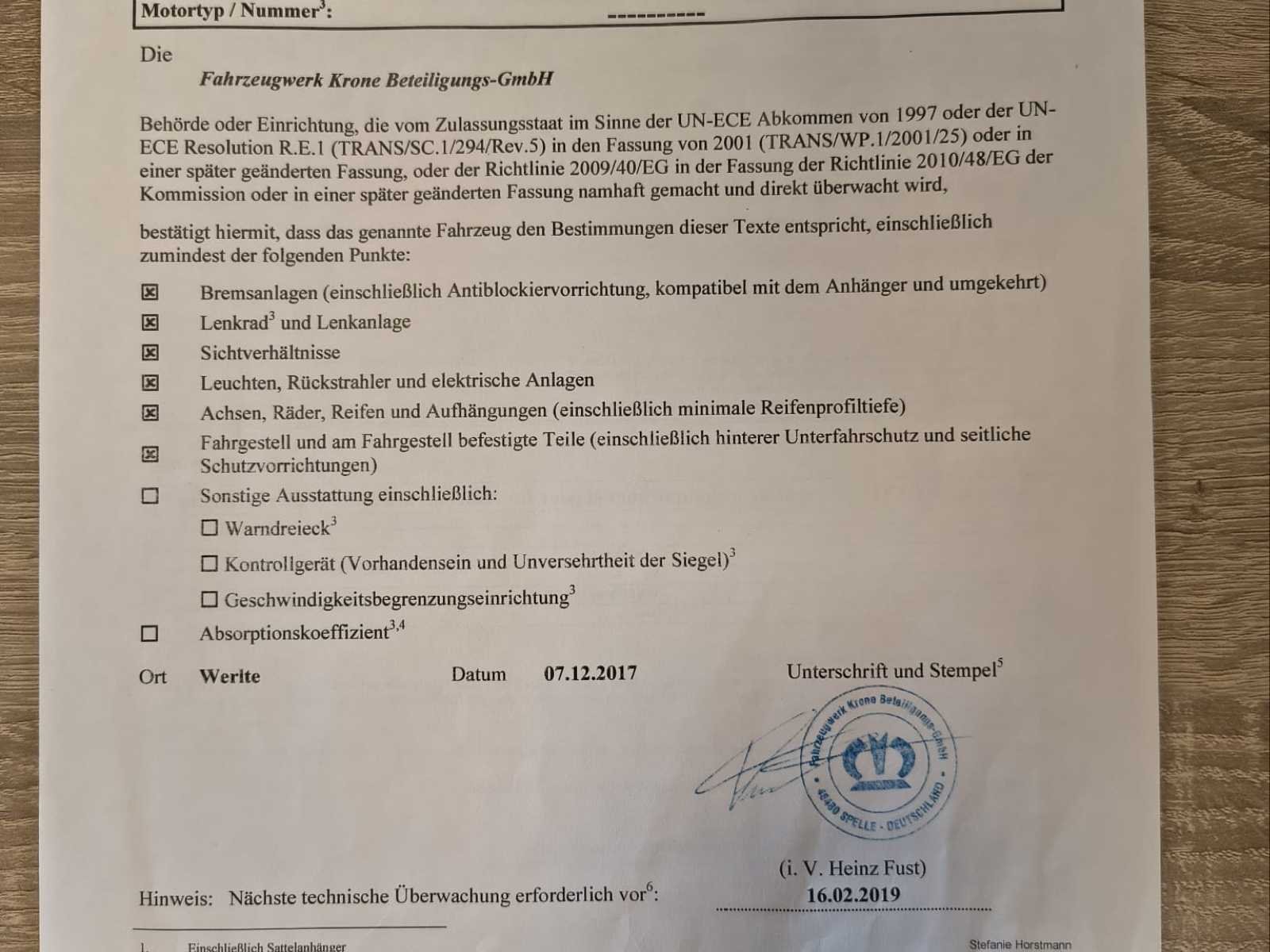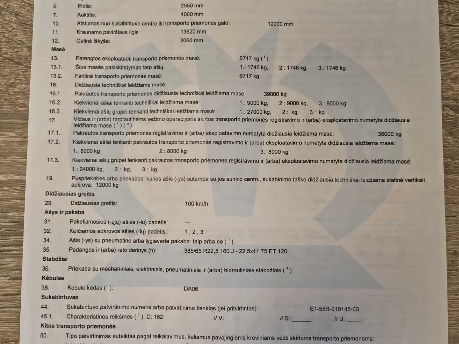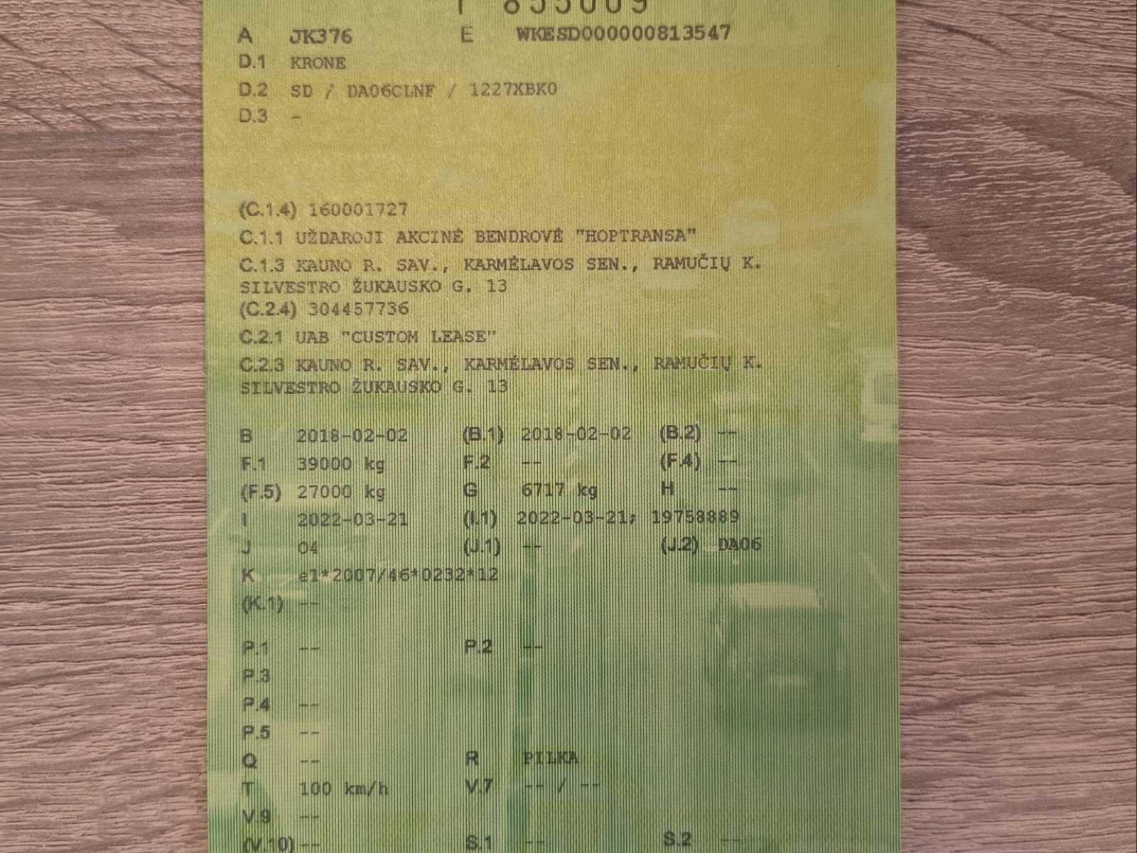 Krone SD schuifzeiloplegger uit 2018 in nette, direct inzetbare staat. Voorzien van 3 assen met luchtvering, schuifzeilen, schuifdak en dubbele achterdeuren. Europese documenten (Estland) aanwezig inclusief typegoedkeuring en ECMT certificaat. Voertuig dient door koper ingevoerd te worden in land van bestemming. Maximaal toegestaan totaalgewicht 39.000 kg. Ideaal voor internationaal transport. Normale gebruikssporen passend bij leeftijd en inzet - specificaties: Schuifzeil links en rechts, Schuifdak, Aluminium zijborden, Houten vloer geschikt voor palletvervoer, Achterdeuren (dubbele deuren), ABS / EBS remsysteem, Trommelremmen, Liftas, Reservewielhouder, Achterbumper conform EU-norm, Snelheidsstickers 60/70/80 km/u, ECMT / CEMT certificaat aanwezig, Europees typegoedkeuringsdocument aanwezig, geschikt voor 33 europallets No Merk: Krone Bouwjaar: 2018 Chassisnummer VIN: WKESD000000813547 Datum eerste toelating: 2/2/2018 Aantal assen: 3 Eigen gewicht: 6598kg Totale afmeting L: 13860mm Totale afmeting Breedte: 2550mm Totale afmeting Hoogte: 4000mm