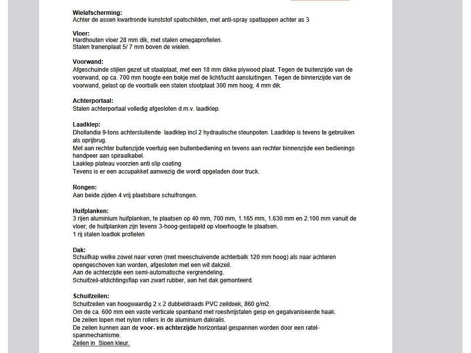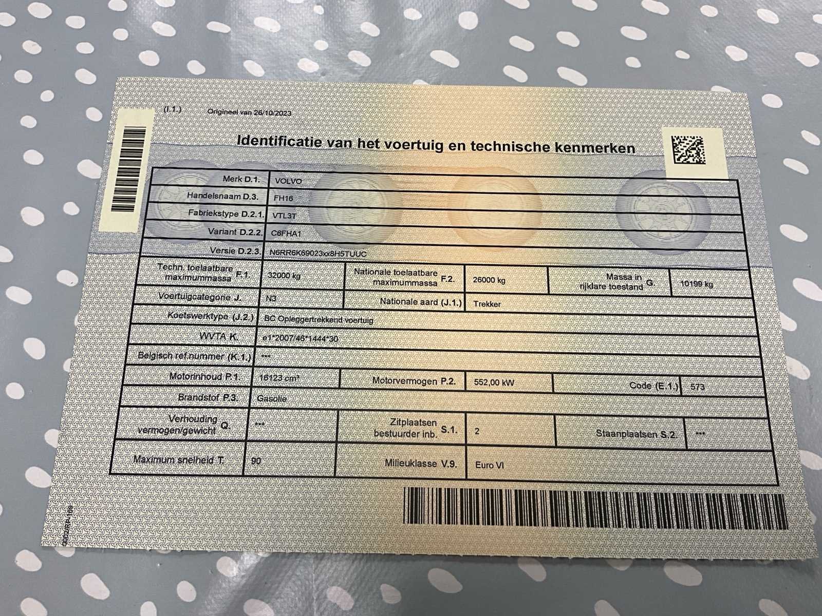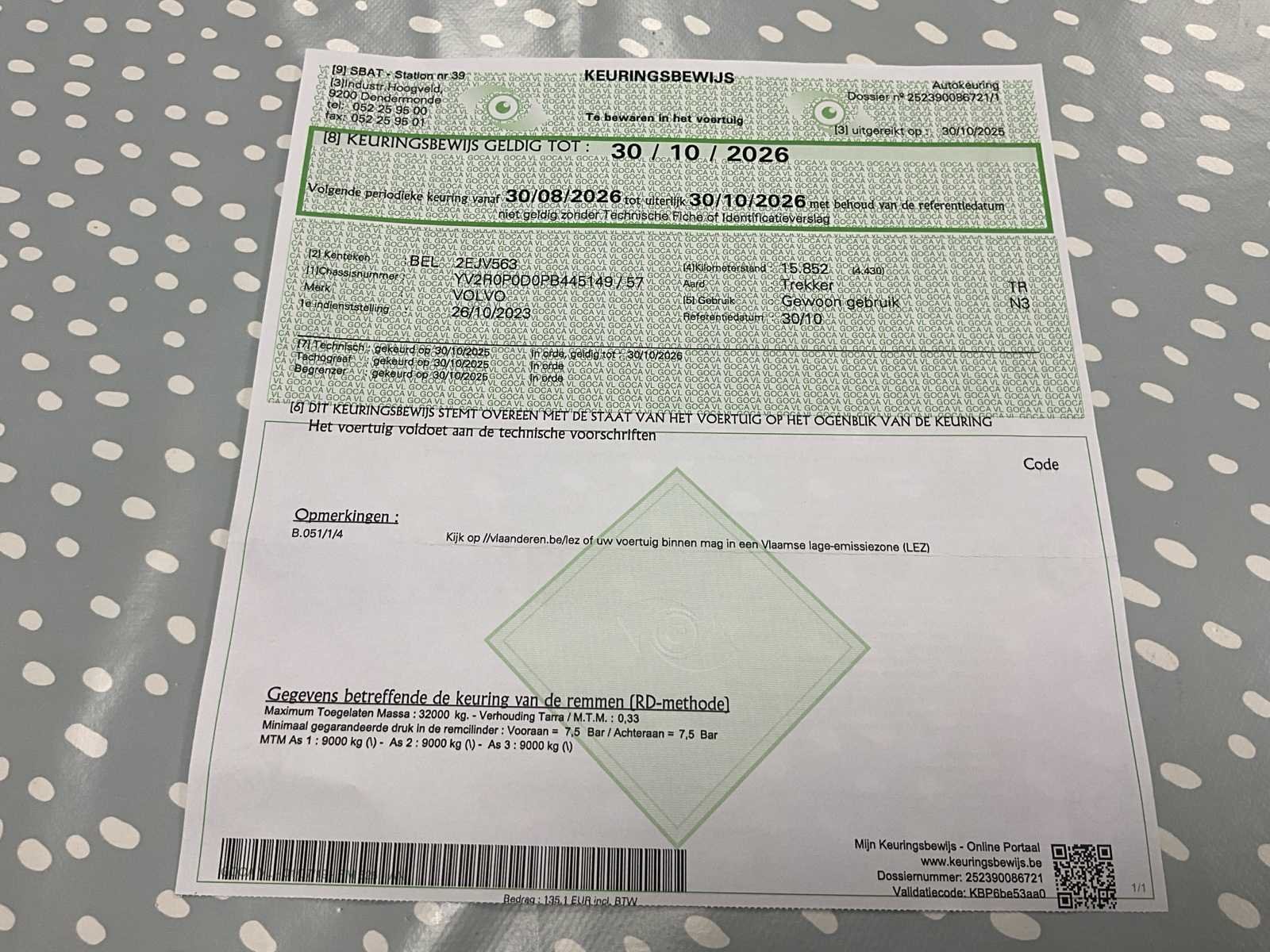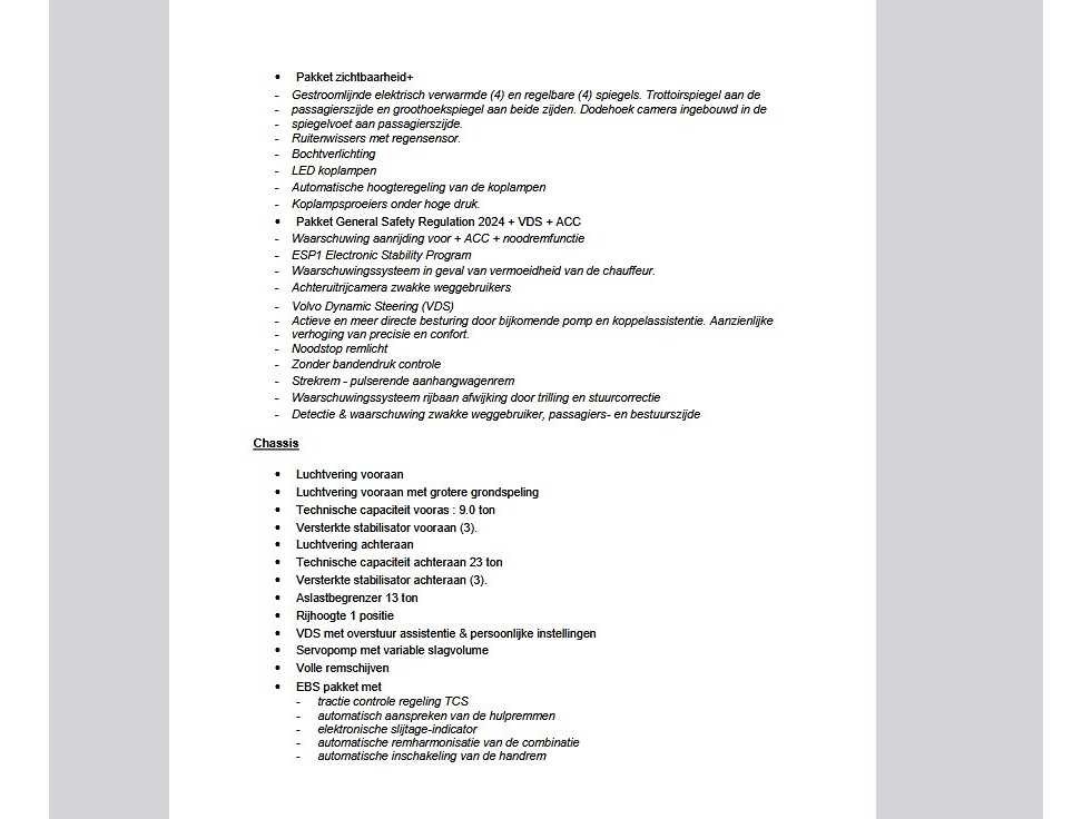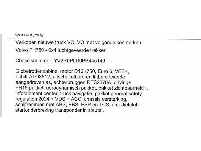 Hydrauliek en elektro stekker voor aansluiten hijskraan op trekker 80 ton Voorzien van hydraulische aansluiting 750 pk (topsegment) Nieuw voertuig Full option uitvoering I-Shift + VEB+ Luchtvering volledig Ideaal voor zwaar transport gegevens trailer: Merk: Pacton Trailers Handelsnaam/Type: SWD.345 Fabriekstype: SWD.345 Kenteken: BEL - QATB726 Chassisnummer VIN: XNTSWD34500082948 Voertuigcategorie: O4 - Oplegger Koetswerktype: DA Oplegger / Schuifzeiltrailer (Curtainsider) Datum eerste inschrijving: 30/05/2024 Datum eerste gebruik: 30/05/2024 Te indienstelling: 30/05/2024 Technisch gekeurd op: 30/10/2025 Keuringsbewijs geldig tot: 09/12/2026 Technisch max. toelaatbare massa: 45.000 kg Nationale toelaatbare maximummassa: 42.000 kg Massa in rijklare toestand: 11.730 kg Max. technische nutslast: 27.000 kg WVTA: e6VAL2024/O45143*00 Afmetingen opbouw (L/B/H): 13.620 / 2.470 / 2.700 mm Aantal assen: 3 Opbouw: Schuifzeiltrailer / Curtainsider Stirnwand pruuflast (DIN EN 12642): 16.200 daN Seitenwände pruuflast: 10.800 daN Rückwand Heckportal pruuflast: 8.100 daN TÜV certificaat: LS 0710894Z1 (DIN EN 12642 Code XL) Fabrikant opbouw: Pacton Trailers B.V., Strangeweg 1, NL-7730 AB Ommen Nee Merk: Volvo Type: FH16 Bouwjaar: 2023 Chassisnummer VIN: YV2R0P0D0PB445149 Kilometerstand bij opname: 20070km Datum eerste toelating: 26/10/2023 Type transmissie: Automatisch Aantal assen: 3 Asconfiguratie: 6x4 Fuel Type: Diesel Laadvermogen: 9810kg Afgelezen mijlenstand: 10199mi Aantal sleutels: 2 CO2-uitstoot NEDC: 98 Emissieklasse: Euro VI-E Slaapcabine: true Navigatie: true Eigen gewicht: 10199kg Startinformatie: start en rijd Afgelezen kilometerstand: 20070km Nationaliteit documenten: belg Kentekenpapieren compleet?: true Aantal zitplaatsen: 2 Automaat: true Diesel: true