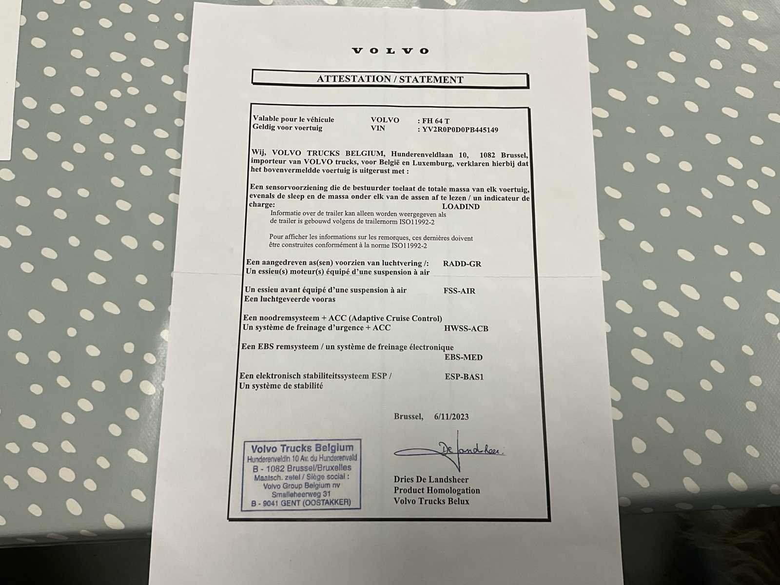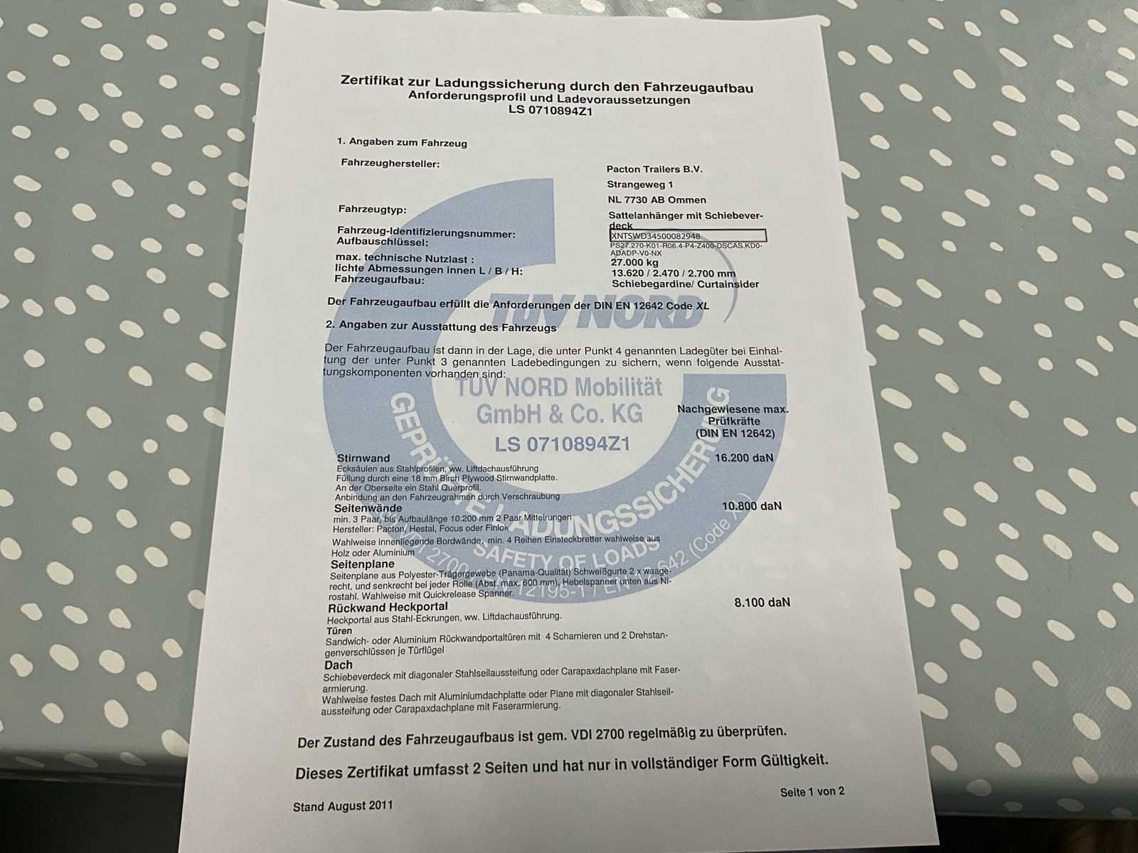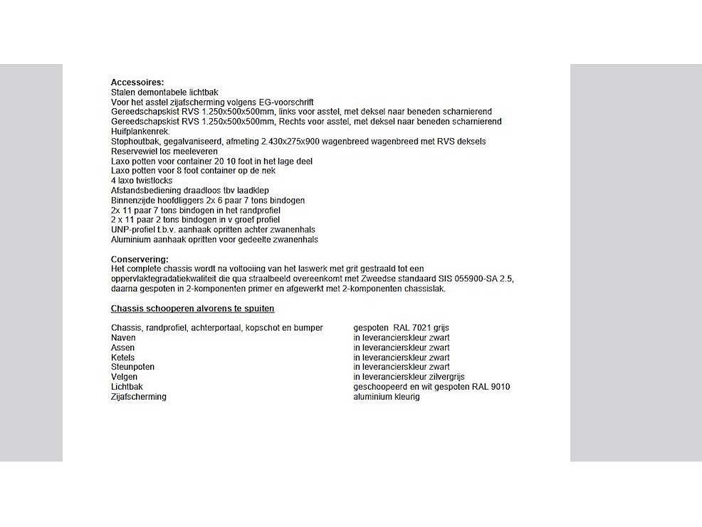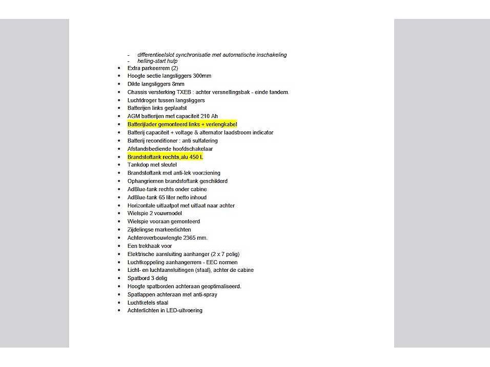 Hydrauliek en elektro stekker voor aansluiten hijskraan op trekker 80 ton Voorzien van hydraulische aansluiting 750 pk (topsegment) Nieuw voertuig Full option uitvoering I-Shift + VEB+ Luchtvering volledig Ideaal voor zwaar transport gegevens trailer: Merk: Pacton Trailers Handelsnaam/Type: SWD.345 Fabriekstype: SWD.345 Kenteken: BEL - QATB726 Chassisnummer VIN: XNTSWD34500082948 Voertuigcategorie: O4 - Oplegger Koetswerktype: DA Oplegger / Schuifzeiltrailer (Curtainsider) Datum eerste inschrijving: 30/05/2024 Datum eerste gebruik: 30/05/2024 Te indienstelling: 30/05/2024 Technisch gekeurd op: 30/10/2025 Keuringsbewijs geldig tot: 09/12/2026 Technisch max. toelaatbare massa: 45.000 kg Nationale toelaatbare maximummassa: 42.000 kg Massa in rijklare toestand: 11.730 kg Max. technische nutslast: 27.000 kg WVTA: e6VAL2024/O45143*00 Afmetingen opbouw (L/B/H): 13.620 / 2.470 / 2.700 mm Aantal assen: 3 Opbouw: Schuifzeiltrailer / Curtainsider Stirnwand pruuflast (DIN EN 12642): 16.200 daN Seitenwände pruuflast: 10.800 daN Rückwand Heckportal pruuflast: 8.100 daN TÜV certificaat: LS 0710894Z1 (DIN EN 12642 Code XL) Fabrikant opbouw: Pacton Trailers B.V., Strangeweg 1, NL-7730 AB Ommen Nee Merk: Volvo Type: FH16 Bouwjaar: 2023 Chassisnummer VIN: YV2R0P0D0PB445149 Kilometerstand bij opname: 20070km Datum eerste toelating: 26/10/2023 Type transmissie: Automatisch Aantal assen: 3 Asconfiguratie: 6x4 Fuel Type: Diesel Laadvermogen: 9810kg Afgelezen mijlenstand: 10199mi Aantal sleutels: 2 CO2-uitstoot NEDC: 98 Emissieklasse: Euro VI-E Slaapcabine: true Navigatie: true Eigen gewicht: 10199kg Startinformatie: start en rijd Afgelezen kilometerstand: 20070km Nationaliteit documenten: belg Kentekenpapieren compleet?: true Aantal zitplaatsen: 2 Automaat: true Diesel: true