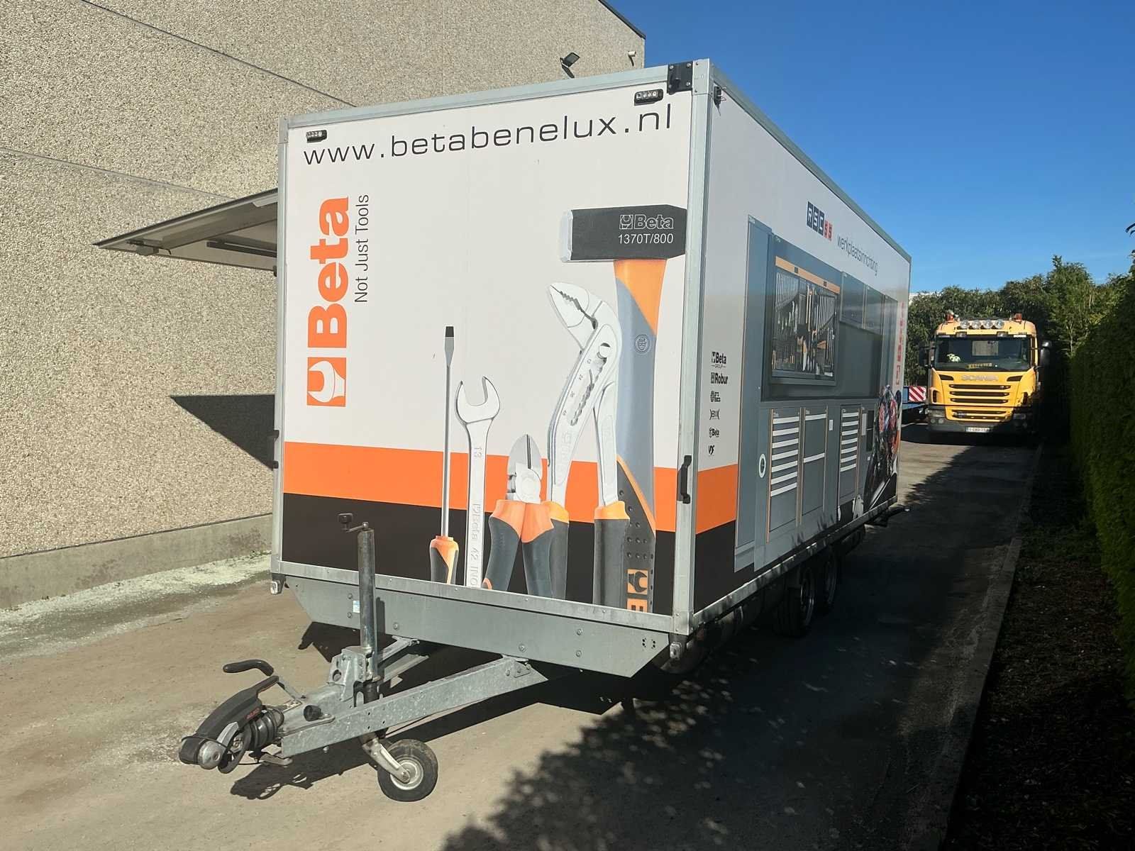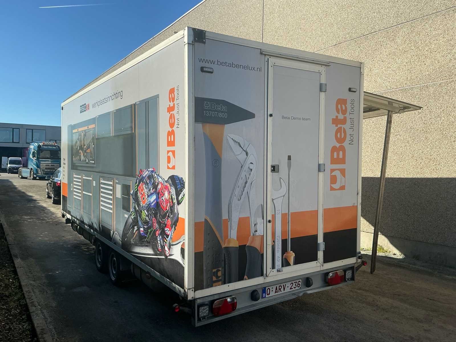 Zeer nette en professioneel ingerichte WM Meyer gesloten aanhangwagen, uitgevoerd als mobiele werkplaats. Dit betreft een ex-Beta demo voertuig, volledig uitgerust met hoogwaardige Beta werkplaatsinrichting en klaar voor onmiddellijk gebruik. De trailer verkeert in zeer goede technische en mechanische staat en is steeds correct onderhouden. Uitvoering / inrichting: Volledig ingerichte Beta werkplaats met werkbanken, opbergsystemen, ladenkasten en gereedschapswand. Voorzien van binnenverlichting, zijluik (opklapbaar) en achterdeur. Aansluitingen voor stroom aanwezig inclusief stroomaggregaat, luchtcompressor en omvormer. Volledig operationeel inzetbaar. Extra troeven: - Ex Beta demo trailer - 4 nieuwe banden met versterkt karkas - Technisch en mechanisch volledig in orde - Keuring geldig tot 19/02/2026 - Ideaal voor service, techniekers, motorsport of mobiele interventies Opmerkingen: <b> Gasveren van het zijluik worden vervangen voor verkoop waardoor de steunbalk niet meer nodig is. Verlichting voor montage aan het luik is aanwezig. Deze mobiele werkplaats is onmiddellijk inzetbaar en perfect voor professioneel gebruik. No Merk: WM Meyer Bouwjaar: 2017 Chassisnummer: WWC263C30GW000001 Aantal assen: 2 Laadbak afmeting l: 550cm Laadbak afmeting b: 221cm Ledig gewicht: 2360kg Laadvermogen: 640kg Gesloten opbouw: true Datum eerste toelating: 15/12/2017 Kentekenpapieren compleet?: true Hoogte: 283cm Lengte: 710cm Breedte: 221cm Nationaliteit documenten: BE