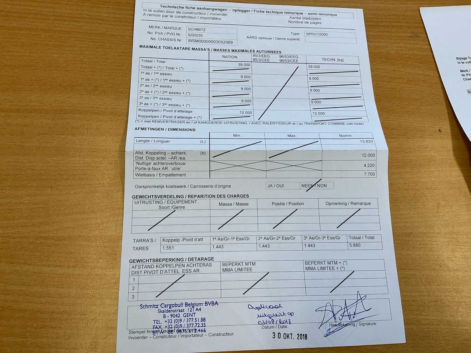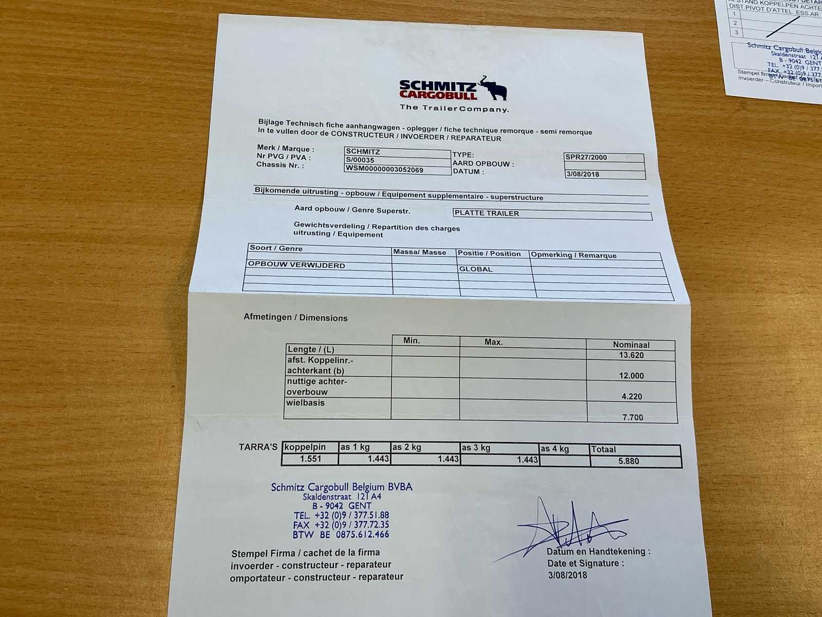 Tarra 5880kg - MTM 3900kg No Merk: Schmitz Type: Cargobull Type aanhangwagencarrosserie: Plateauwagen Bouwjaar: 2007 Chassisnummer VIN: WSM00000003052069 Aantal assen: 3