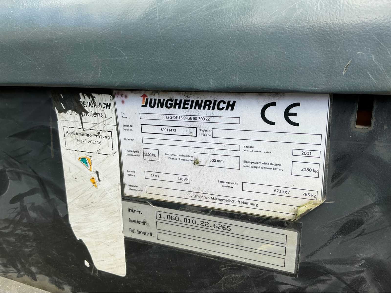 Ophalen in 2580 putte Nee Merk: JUNGHEINRICH Type: EFG-DF-SPGE 90-300ZZ Bouwjaar: 2001 Serienummer: 1.060.010.22.6265 Brandstof: Elektrisch Mast: Duplex Soort band: Volrubber banden Aantal wielen: 3 Afgelezen urenstand: 1820 Eigen gewicht: 2945kg Hefvermogen: 1300kg Lepellengte: 1100mm Min. hefhoogte: 0mm Max. hefhoogte: 3000mm Vol rubber banden: true Minimale doorrijhoogte: 2000mm Leveringsvoorwaarden: Niet gefundeerd - onverpakt