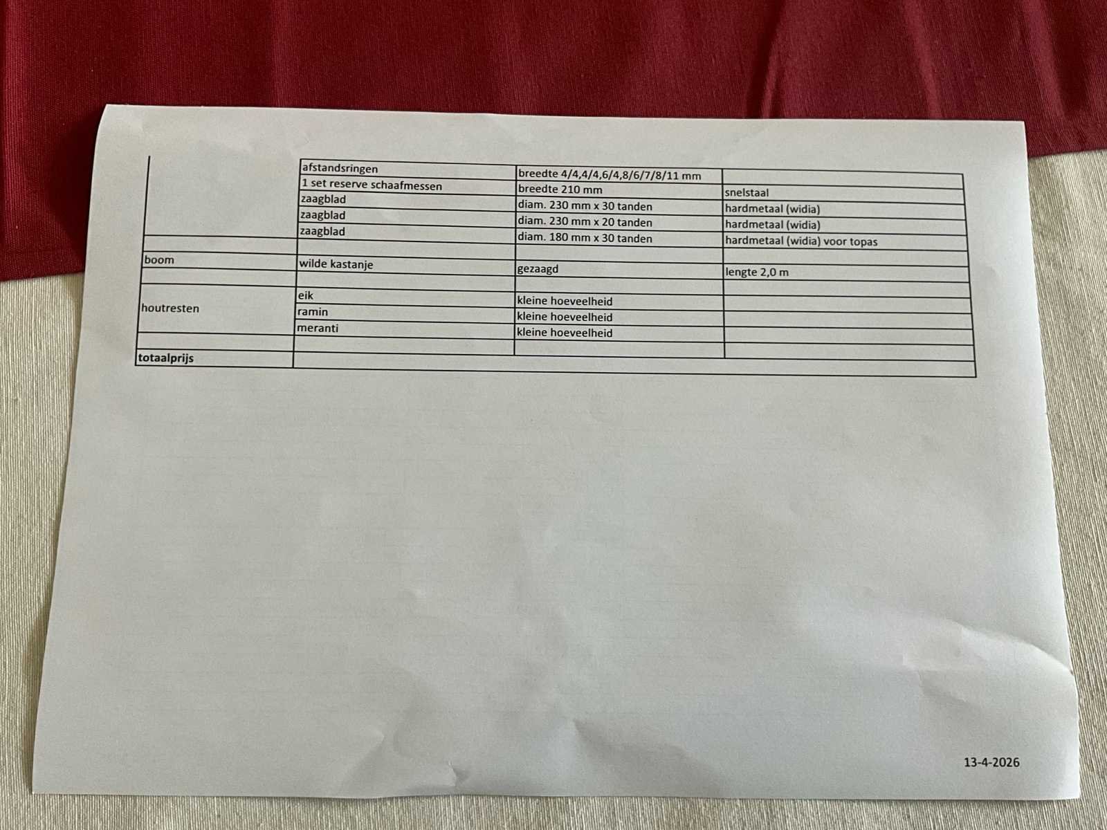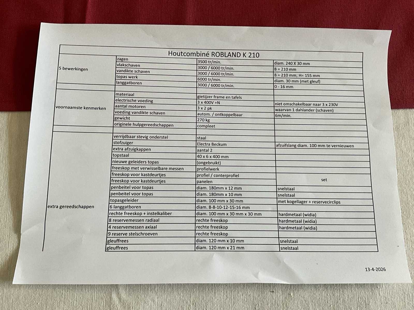 3x400v +n (niet omschakkelbaar naar 3x 230) Werkt en voert uit wat het moet doen Zelf laden (geen heftruck aanwezig) Verrijdbaar inclusief alle toebehoren Nee Merk: Robland Type: K210 Bouwjaar: 1981 Werkbreedte: 210mm Werkhoogte: 155mm Doorvoersnelheid: 6m/min Aantal snelheden: 2 Snelheid van n =: 3000rpm Snelheid tot n =: 6000rpm Aansluiting: 400V Gewicht: 270