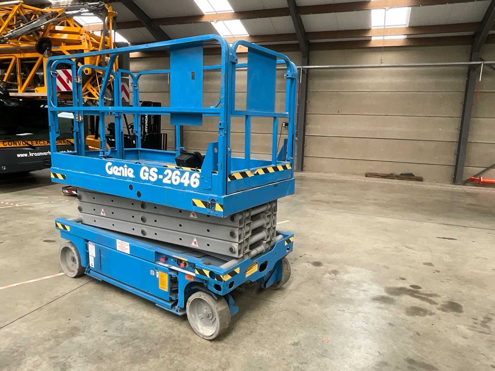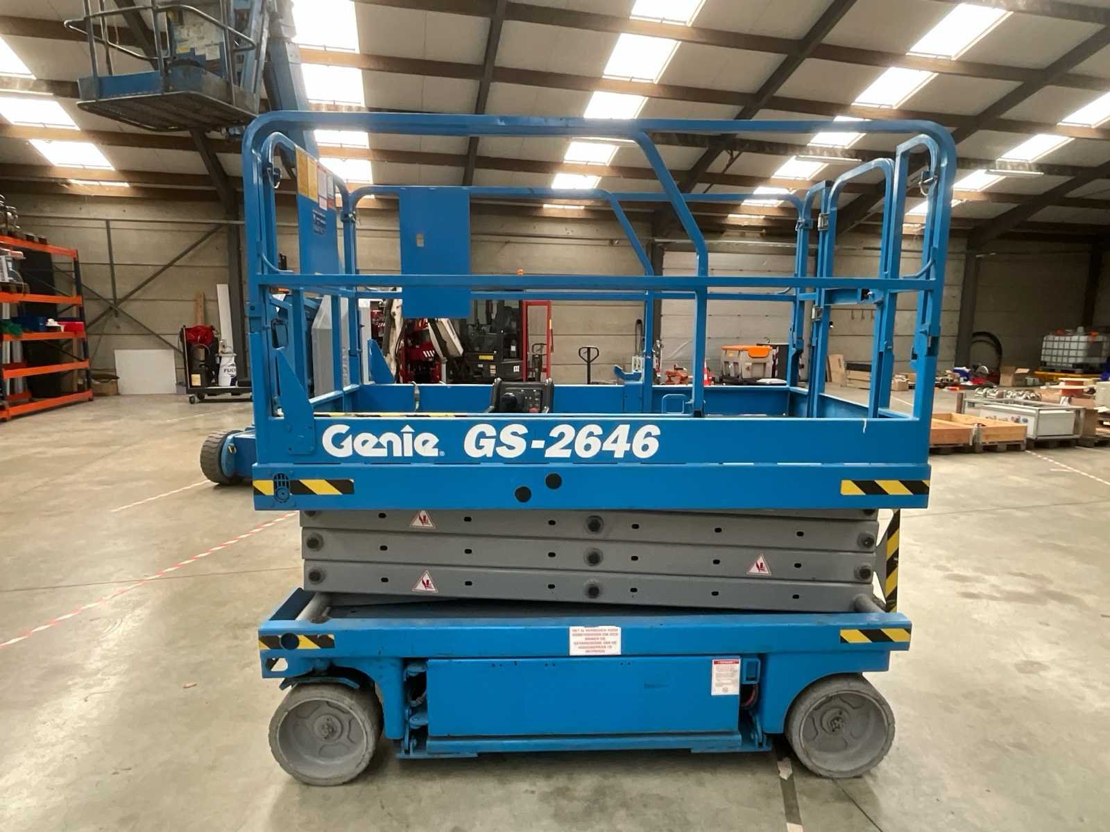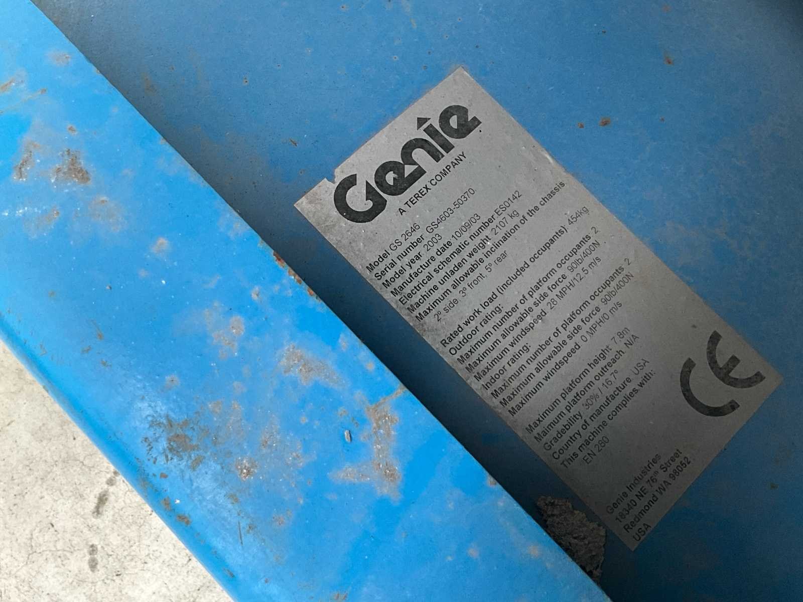 Algemene gegevens Merk: Genie Model: GS-2646 Type: Schaarhoogwerker (scissor lift) Fabrikant: Terex / Genie Bouwjaar: 2009 Identificatie Modelcode: GS 2646 Serienummer: GS4603-50370 (zoals zichtbaar op het plaatje) Chemical unit number: ES00142 Capaciteit & gebruik Maximale werkbelasting: 454 kg Aantal personen (binnen): 2 Aantal personen (buiten): 2 Machine bedoeld voor gebruik: binnen en buiten Wind & belasting Max. windsnelheid (buiten): 12,5 m/s Max. windsnelheid (binnen): 0 m/s Max. platformkracht: 400 N Afmetingen (platform) Max. platform hoogte: ± 7,8 m Platform uitschuifbaar: Ja (extension aanwezig) Veiligheidsinformatie Meerdere waarschuwingsstickers aanwezig (GEVAAR / BELANGRIJK) Gebruik volgens instructies vereist Alleen getraind personeel mag bedienen Machine voldoet aan EU-richtlijn EN 280 Overige info Fabrikant locatie: USA (Genie / Terex) CE-markering: aanwezig Gebruik: magazijnen, bouw, onderhoudswerk op hoogte Nee Merk: Genie Type: GS-2646 Bouwjaar: 2009 Serienummer: GS4603-50370