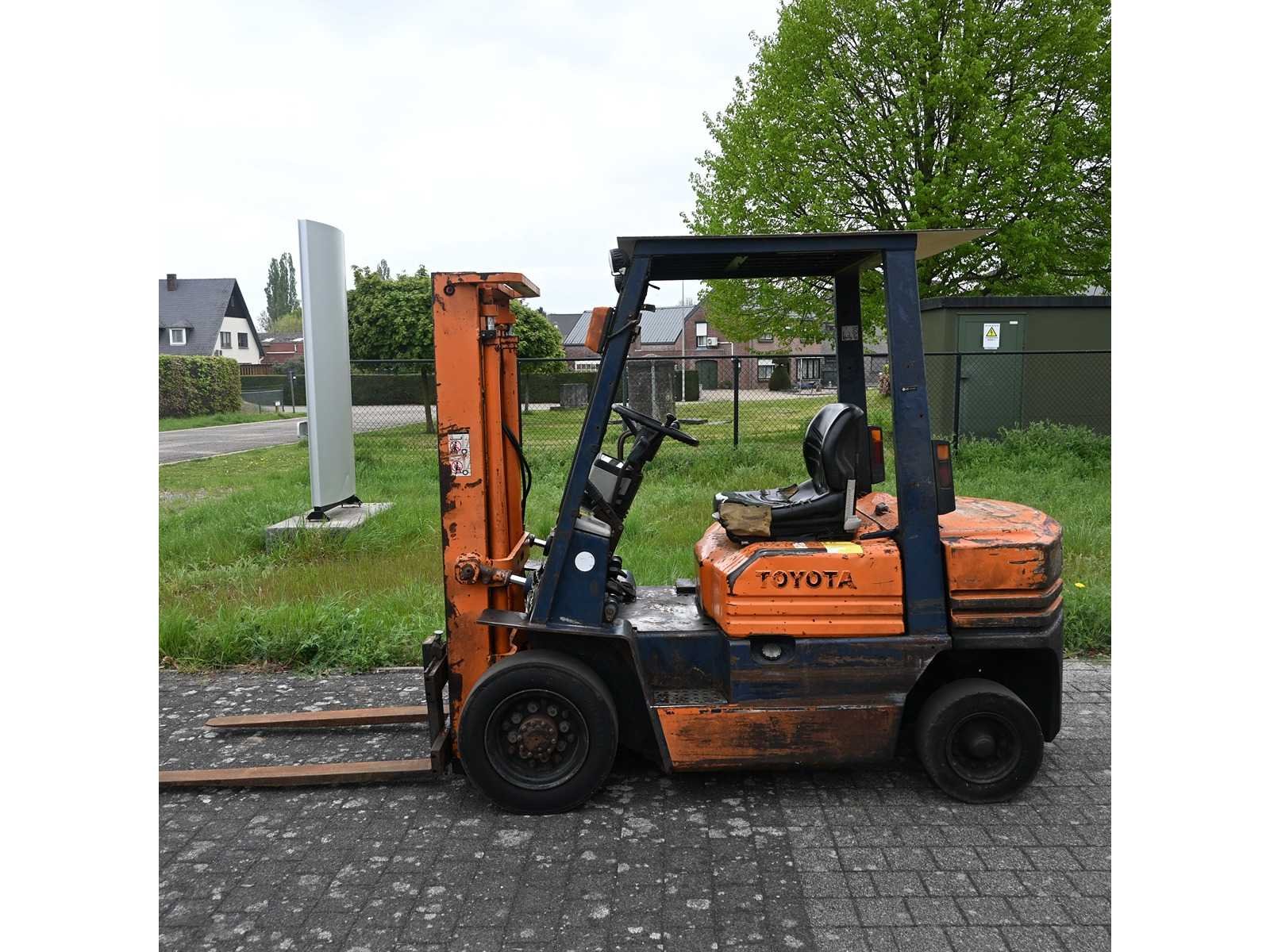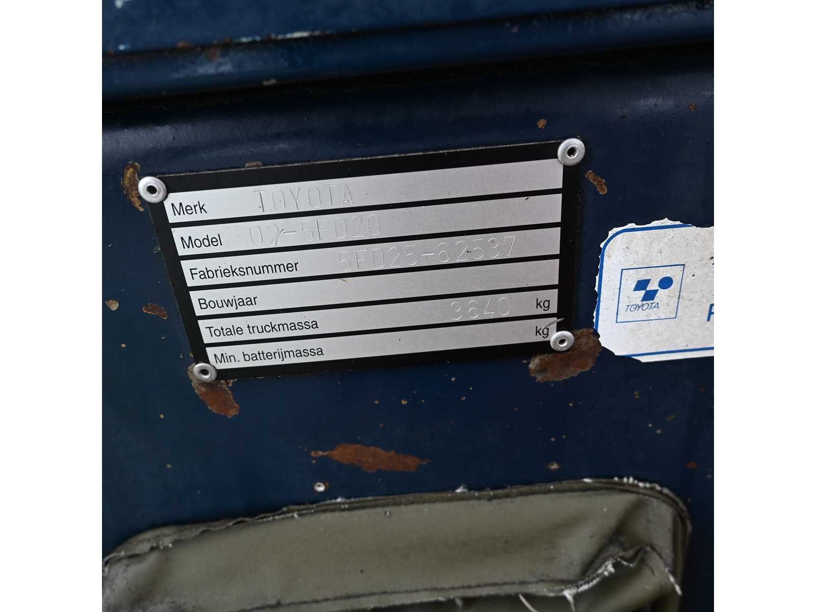 Toyota 02-5FD20 Diesel Forklift - Duplex mast - Free lift - 1 Hydraulic function Nee Merk: Toyota Type: 02-5FD20 Brandstof: Diesel Mast: Duplex Soort band: Vol rubber Aantal wielen: 4 Afgelezen urenstand: 13738 Free-lift: true Duplex mast: true Eigen gewicht: 3640kg Hefvermogen: 2000kg Hefhoogte: 3000mm Vol rubber banden: true Minimale doorrijhoogte: 2050mm Diesel: true Leveringsvoorwaarden: Gratis op vrachtwagen