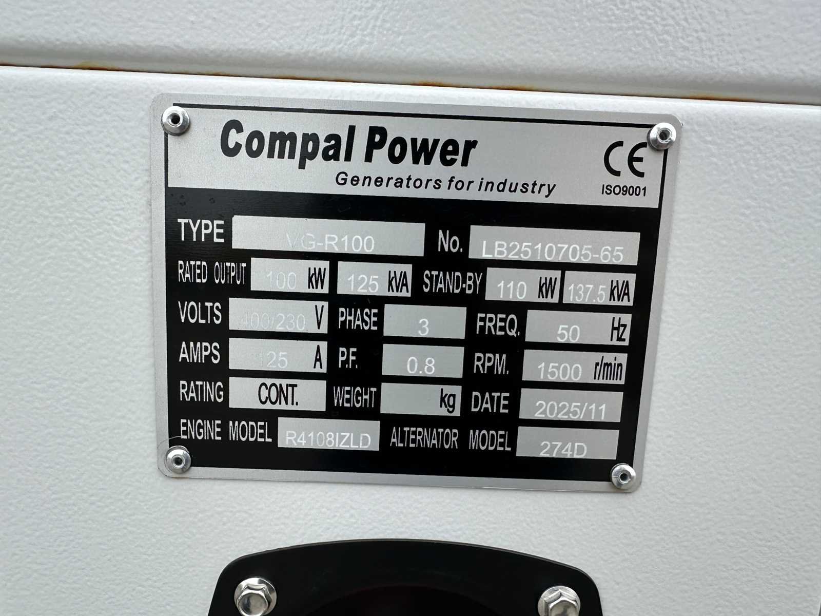 -Nieuw -Reserve en hulpstukken Nee Merk: Compal Power Type: VG-R100 Bouwjaar: 2025 Serienummer: LB2510705-65 Capaciteit.: 125kVA Diesel: true Type motor: R4108IZLD Aantal cilinders: 4 Motorvermogen (kW): 100kW Afgelezen urenstand: 0 Machinegewicht: 1300kg Totale afmeting L: 2500mm Totale afmeting Breedte: 1100mm Totale afmeting Hoogte: 1350mm