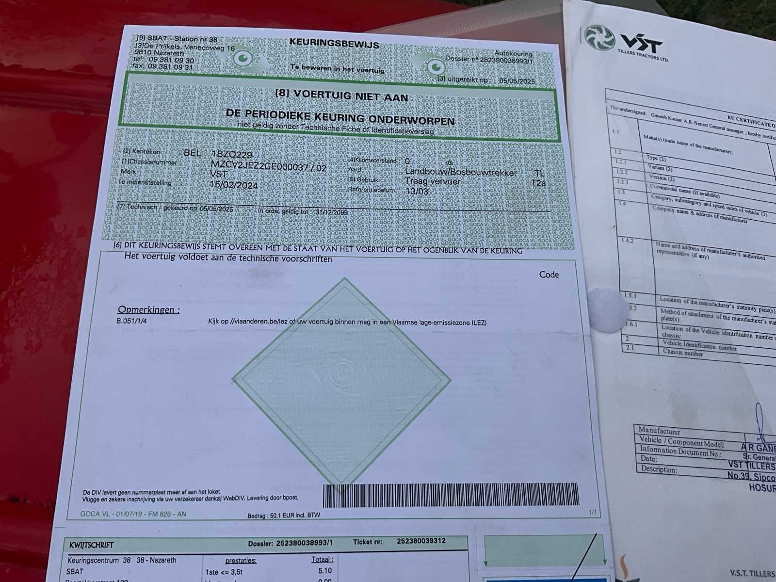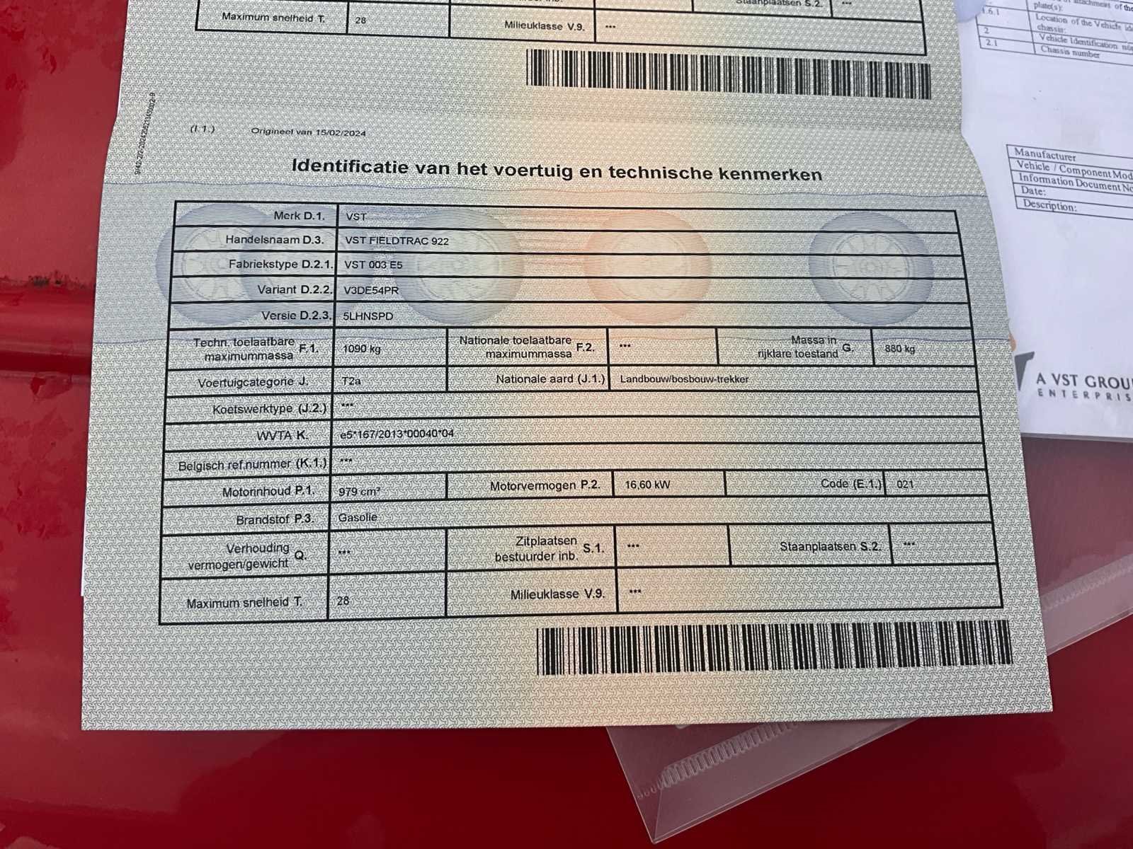 Start rijd en doet wat hij moet doen alle papieren aanwezig Nee Merk: VST Type: 003 E5 Bouwjaar: 2024 Serienummer: JTHTGE000948 Kenteken: 1BZQ229 Motorvermogen (kW): 16kW Afgelezen urenstand: 60 Versnellingsbaktype: Mechanisch (handgeschakeld) Aftakastoerental: 540rpm Bandenmaat voor: 6.00-12 Bandenmaat achter: 8.3-20 Aantal hydraulische ventielen voor: 1 Aantal hydraulische ventielen achter: 1 Eigen gewicht: 880kg GS Code: 8701.91
