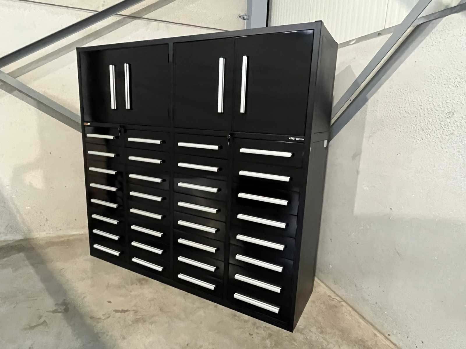 <ul> <li><strong>metalen werkplaatskast</strong></li> <li><strong>afmetingen:</strong> 2210 x 600 x 2050 mm</li> <li><strong>laden:</strong> 32 laden</li> <li><strong>afmetingen laden:</strong> 450 x 480 x 120 mm</li> <li><strong>capaciteit per lade:</strong> 40 kg</li> <li><strong>sluiting:</strong> laden afsluitbaar</li> <li><strong>deuren:</strong> 4 deuren</li> <li><strong>afmetingen deuren:</strong> 520 x 620 mm</li> <li><strong>handgrepen:</strong> aluminium handgrepen</li> <li><strong>kleur:</strong> zwart</li> <li><strong>frame:</strong> gepoedercoat frame</li> <li><strong>fronten:</strong> gelakte fronten</li> <li><strong>gewicht:</strong> 395 kg</li> <li><strong>staat:</strong> ongebruikt</li> </ul> Nee