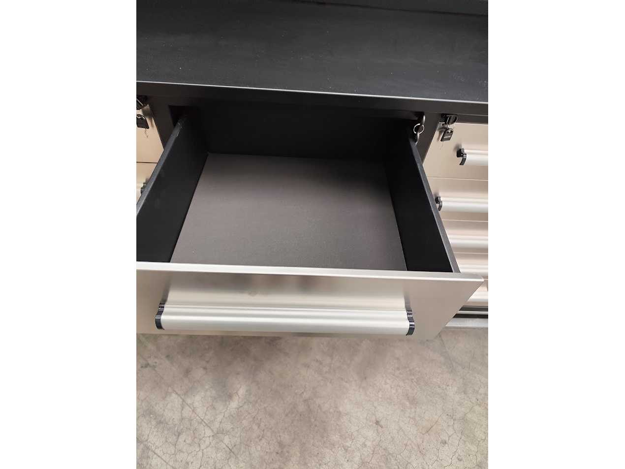 Nieuwe ongebruikte werkbank met 41 laden en 2 kasten, antislipmat in de laden, wielen, alle laden van het onderste deel kunnen op slot, inox voorzijde, zijgrepen, Nee Merk: impe Breedte: 670mm Lengte: 2845mm Hoogte: 1895mm Leveringsvoorwaarden: Geladen op vrachtwagen