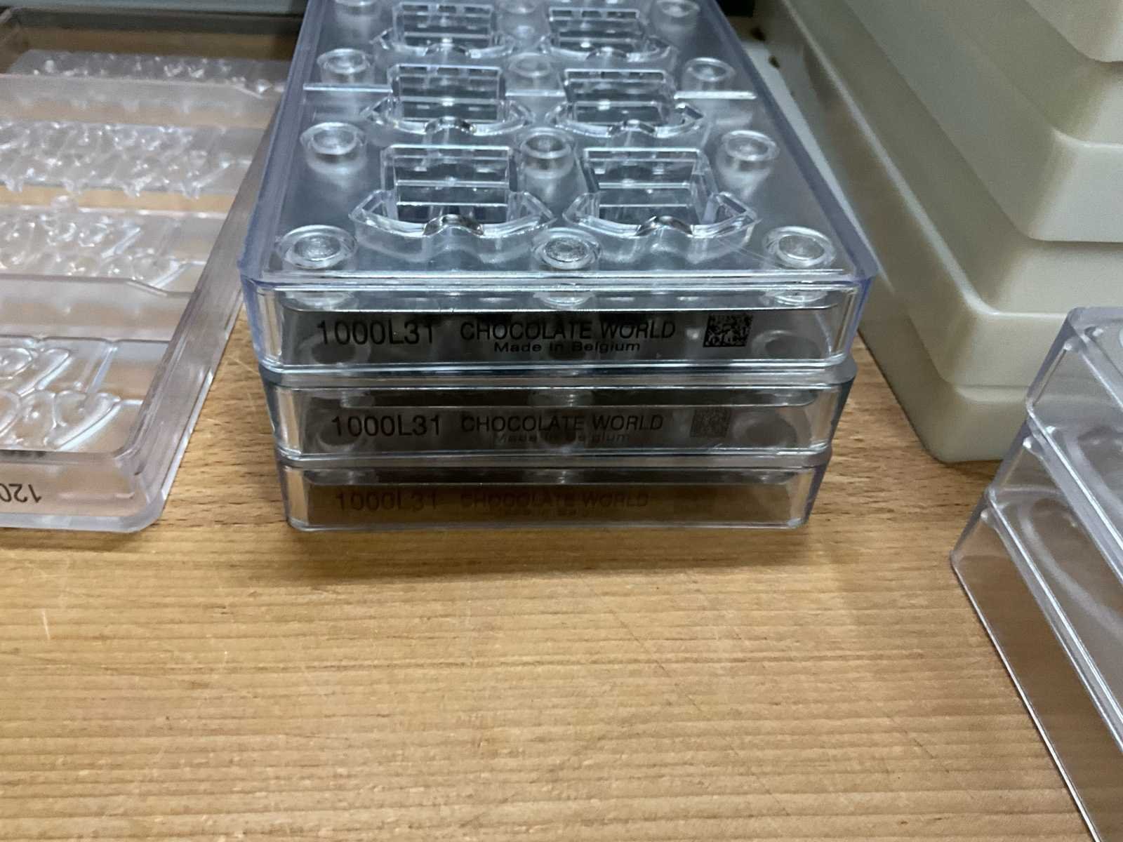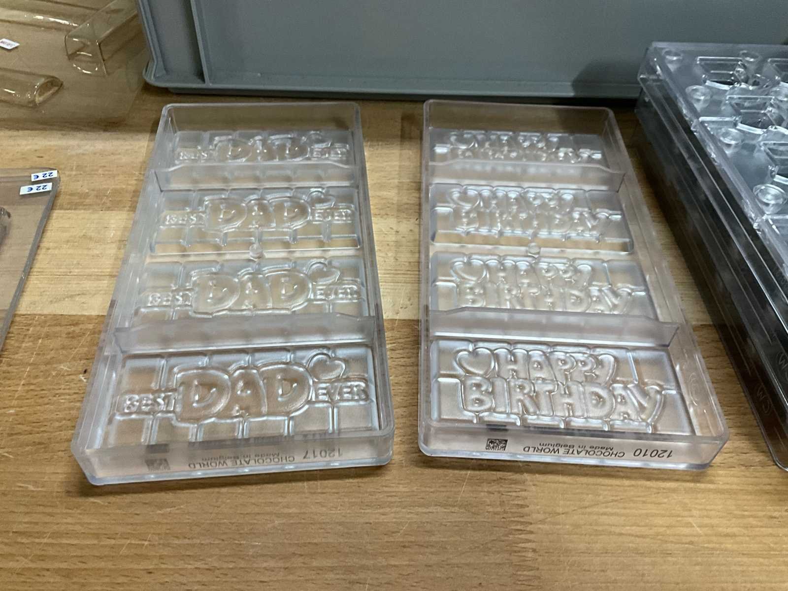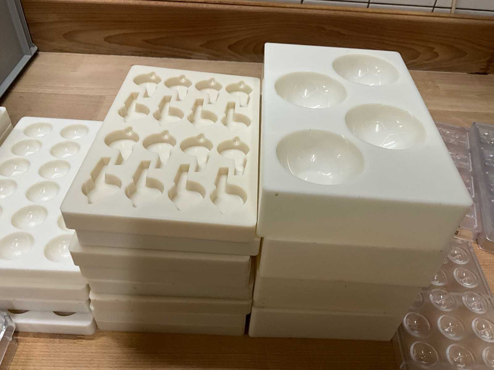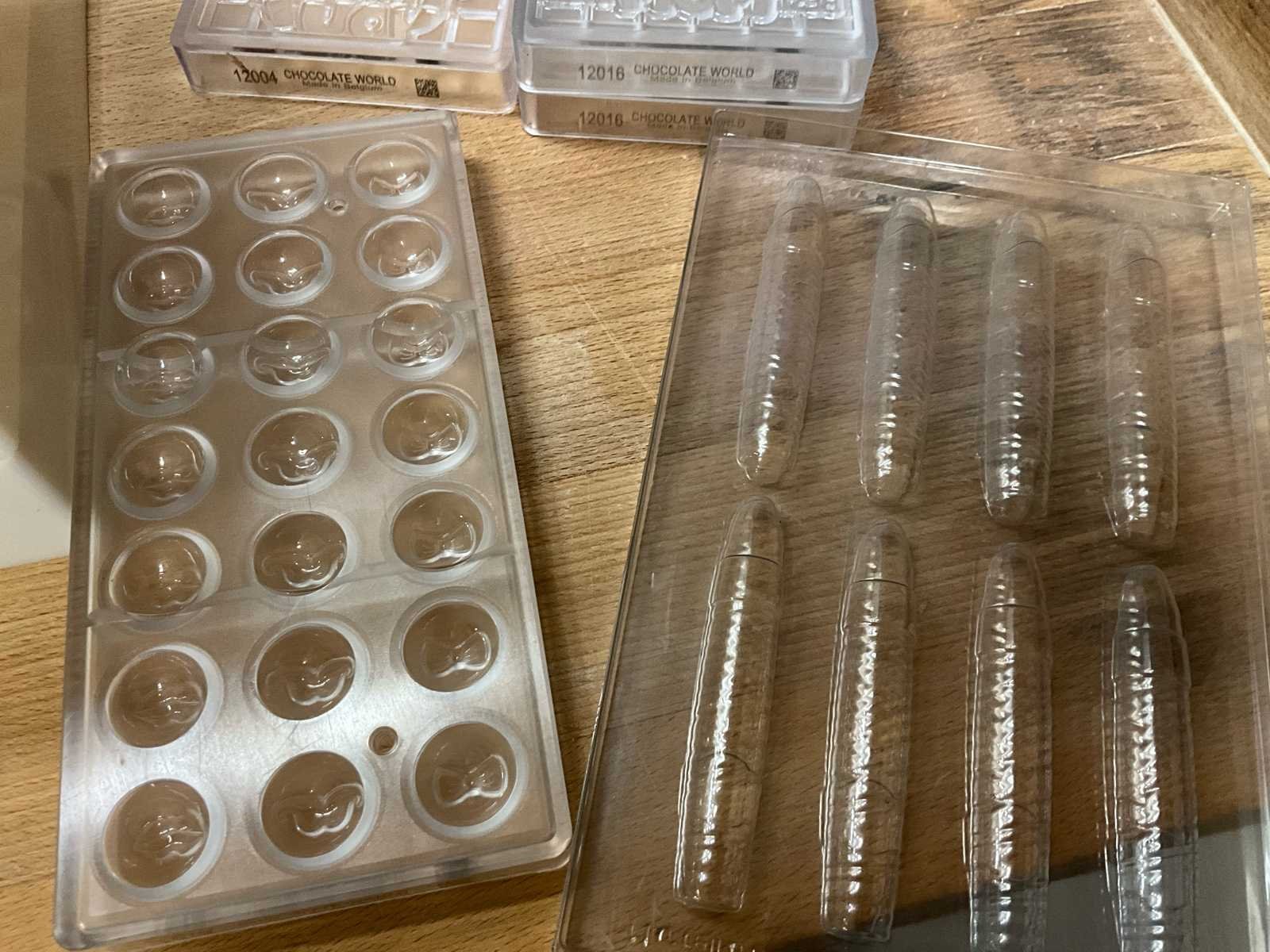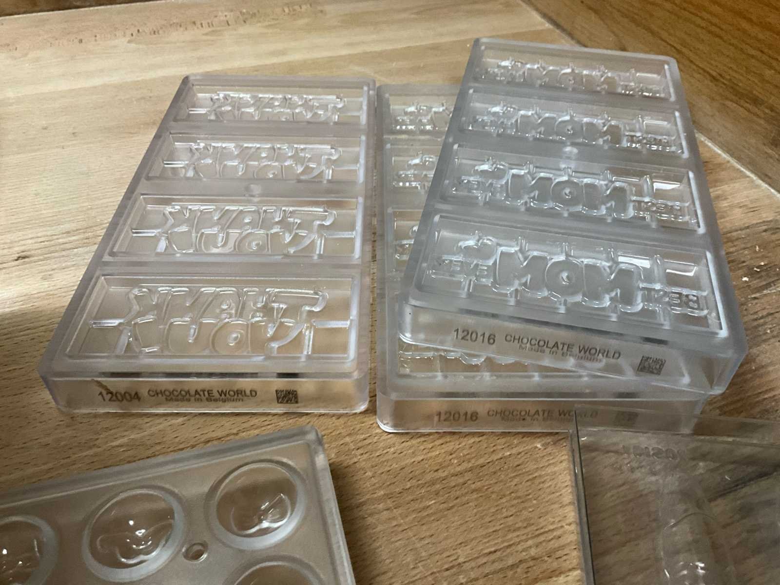 47 chocoladevormen / praline- en figuurmallen, mix van Chocolate World, Callebaut en andere kwaliteitsmerken. Mooie gevarieerde partij met seizoens- en themavormen zoals voetbal, Vaderdag, Moederdag, verjaardag, figuren, halve bollen en speciale vormen. Ideaal voor chocolatier, bakkerij, workshopruimte of hobbyist. Inhoud: 47 stuks totaal: Polycarbonaat mallen + witte productieplaten, Mix van professionele merken, Diverse thema’s en maten - Staat: nette gebruikte staat, direct inzetbaar.- opbergbox inbegrepen No Merk: Chocolate World