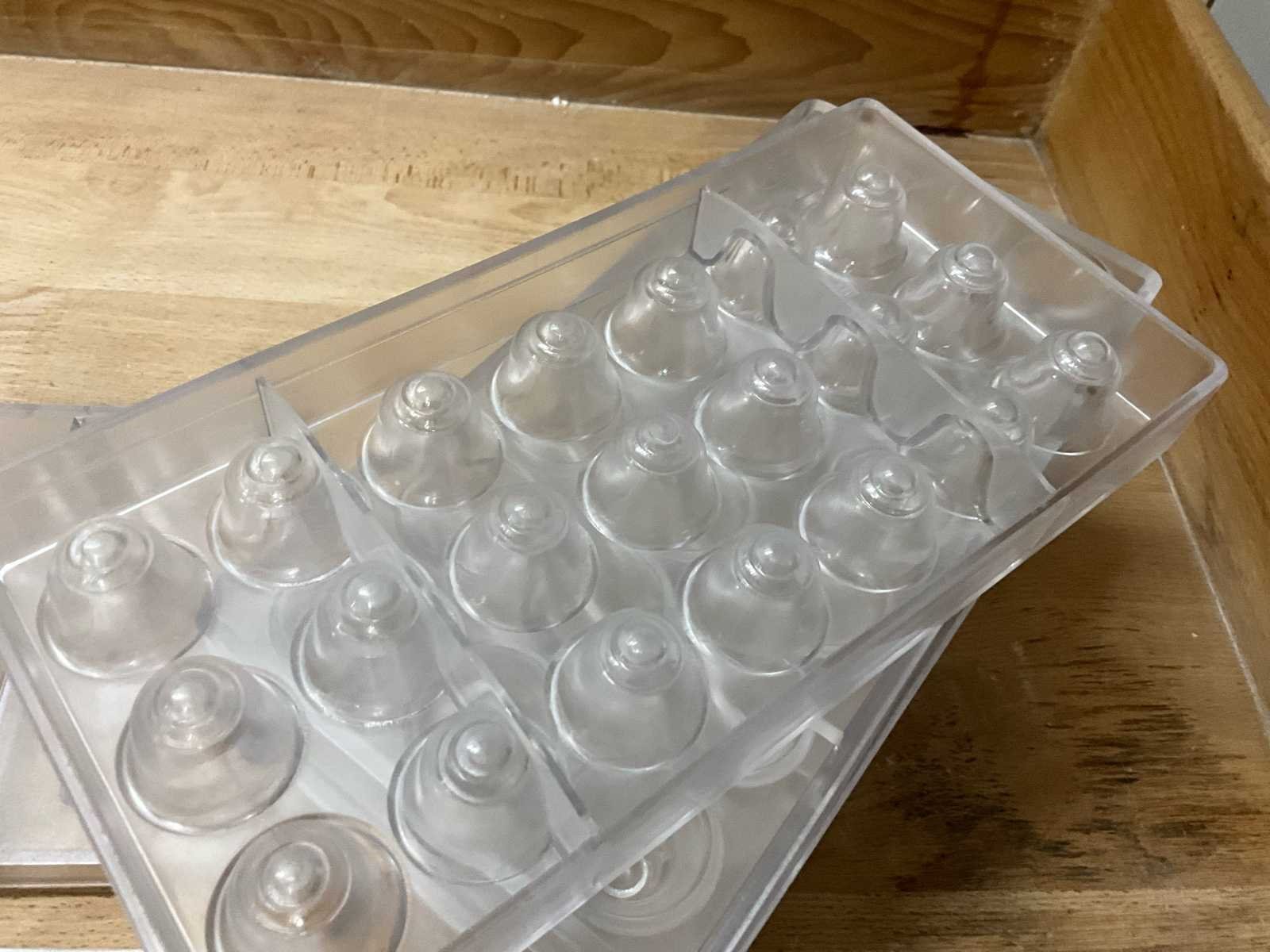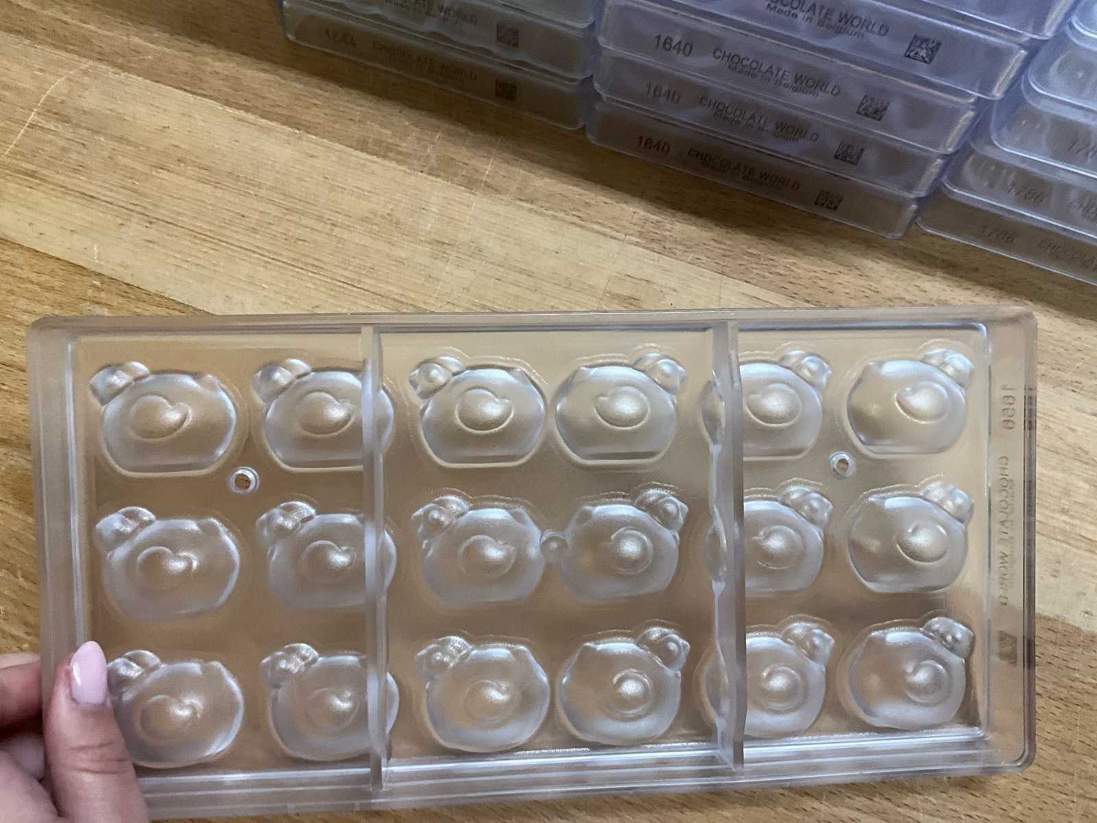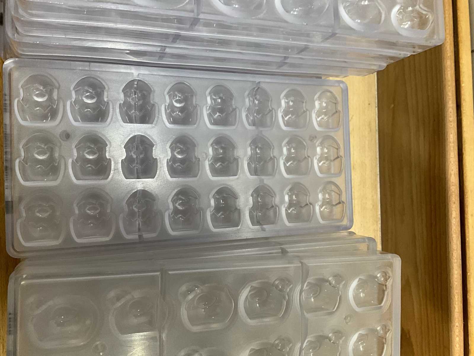 Grote partij professionele chocoladevormen voor het maken van pralines in Paas-thema. Diverse modellen aanwezig (zie nummers op foto)- inclusief 1 grote en 1 kleine opbergbak - 40 stuks plaatvormen chocolate world - 27 vormen eitjes - 4 lolly’s - 7 kippen - 6 paasklokken No Merk: Chocolate World