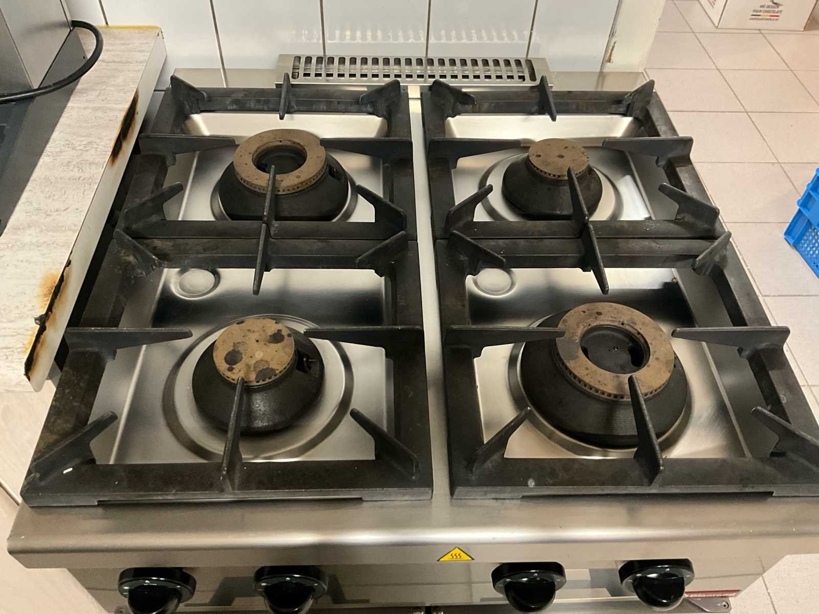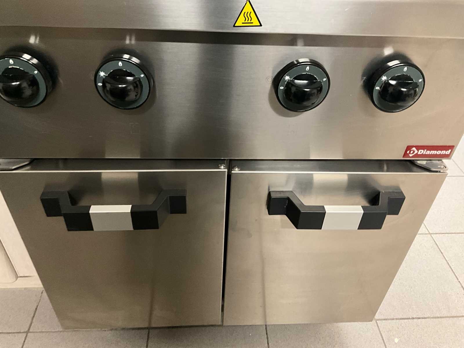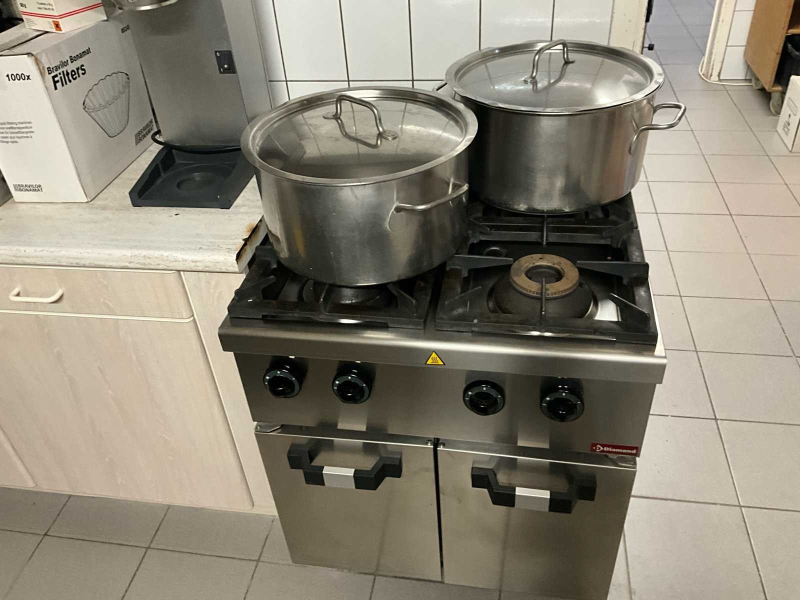 Zeer degelijk en professioneel horeca gasfornuis van het kwaliteitsmerk Diamond, uitgevoerd in roestvrij staal. Ideaal voor gebruik in restaurant, grootkeuken, catering, traiteur, kantine of professionele keuken. Compact model met krachtige branders en handige opbergruimte onderaan - Afmetingen (geschat): Breedte: ca. 80 cm Diepte: ca. 70 cm Hoogte: ca. 90 cm Staat: Gebruikte staat met normale gebruikssporen Net en verzorgd toestel Zie foto’s voor visuele staat - OPGELET: slecht 1 pot inbegrepen No Merk: Diamond