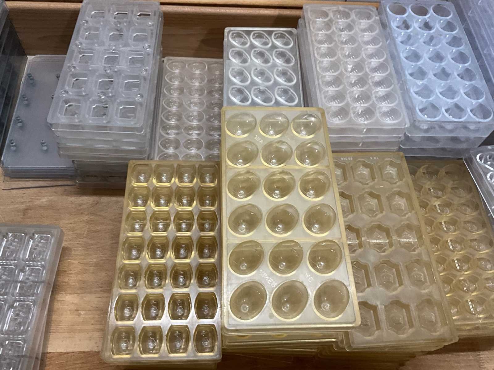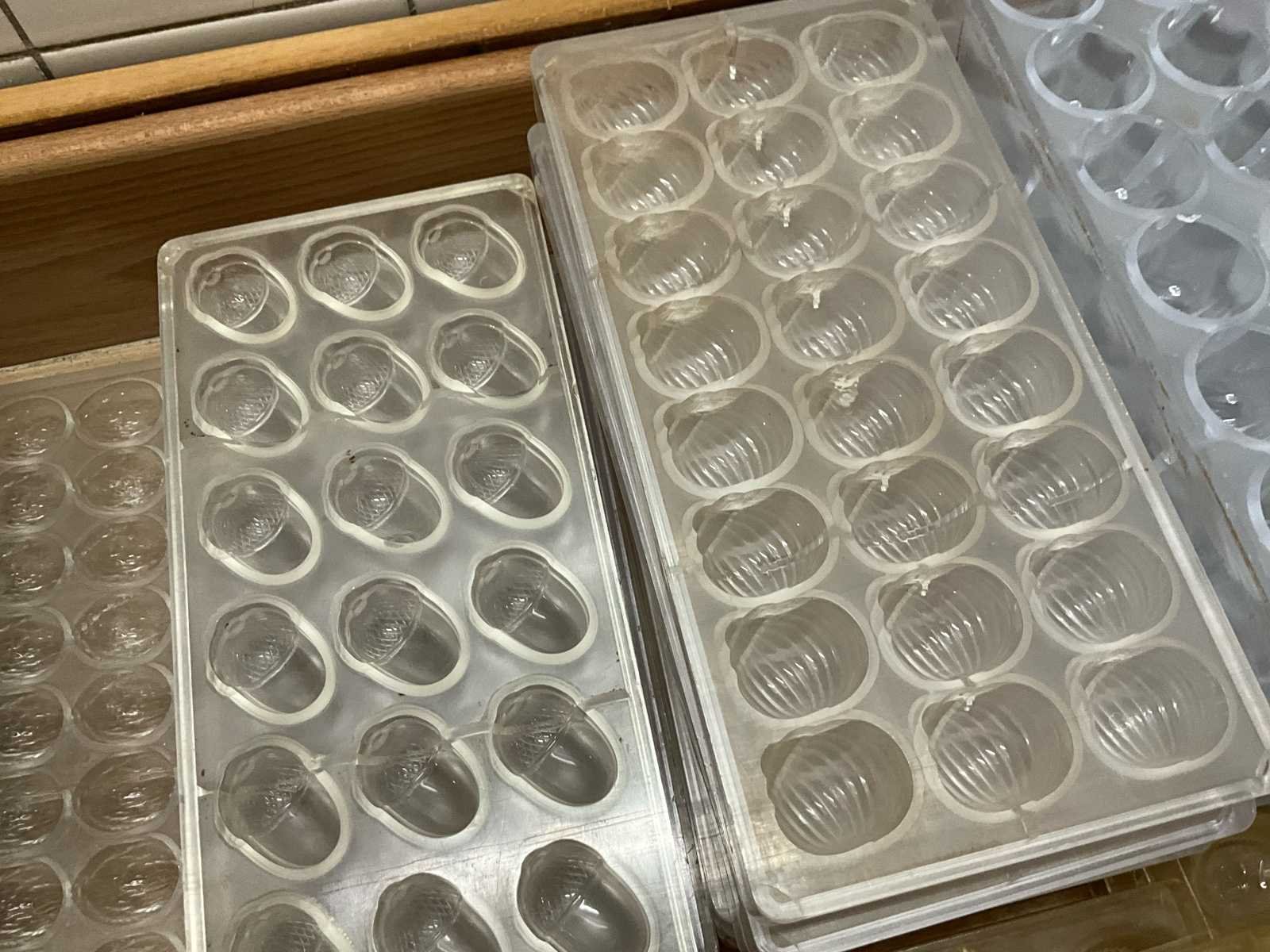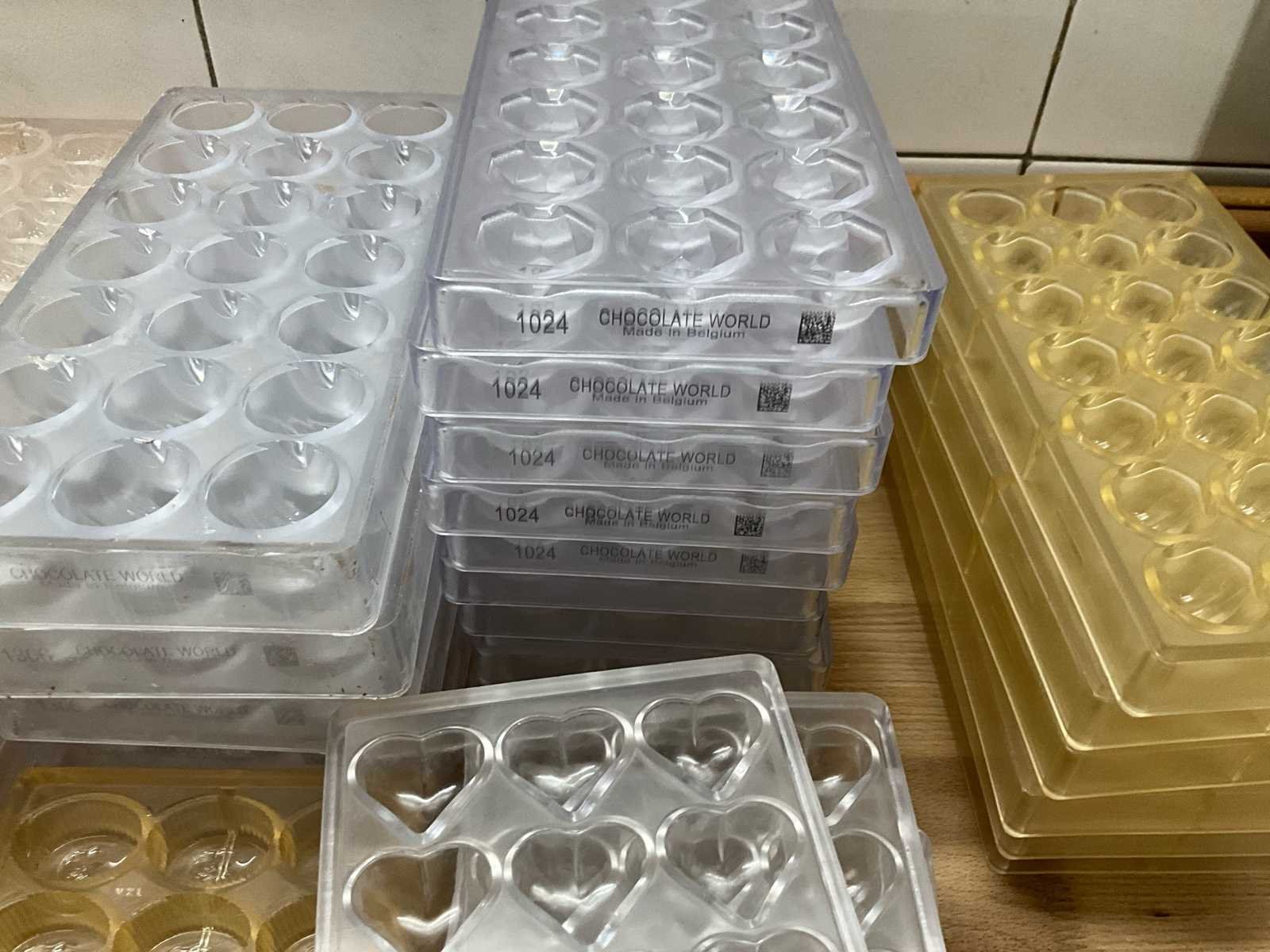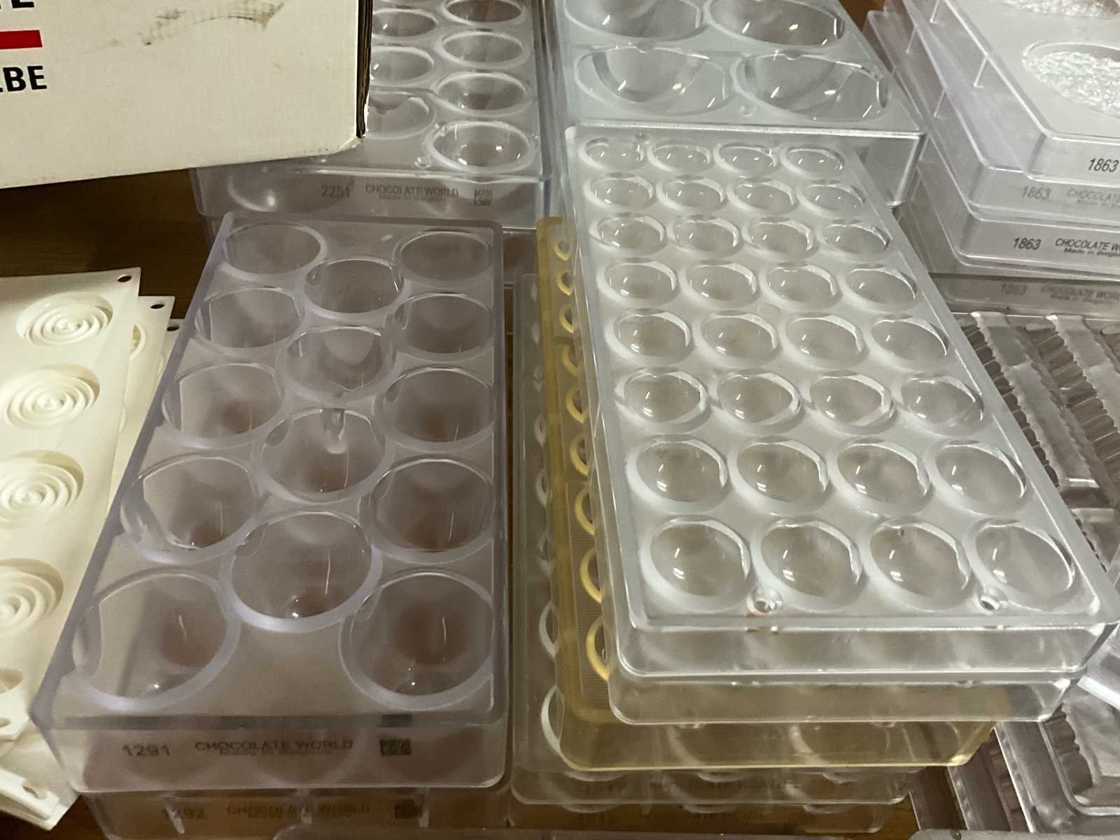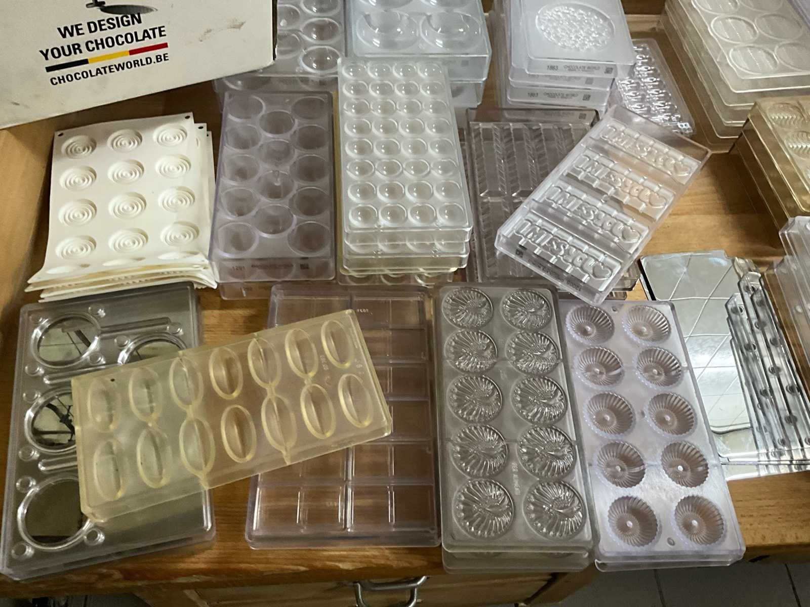 Grote partij professionele chocoladevormen voor het maken van pralines in diverse thema’s. Minimum 200 stuks. Diverse modellen aanwezig (zie nummers op foto)- inclusief 2 opbergbakken No Merk: Chocolate World