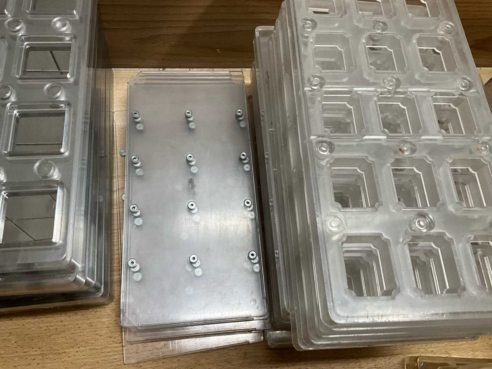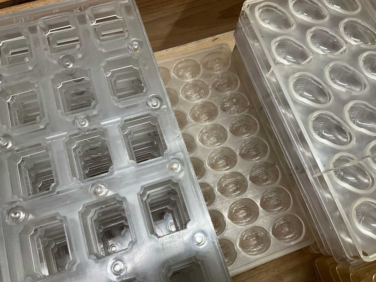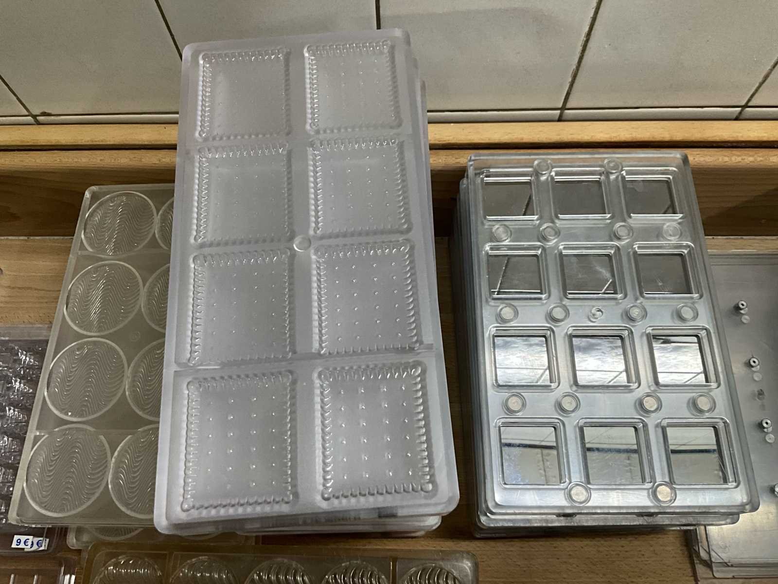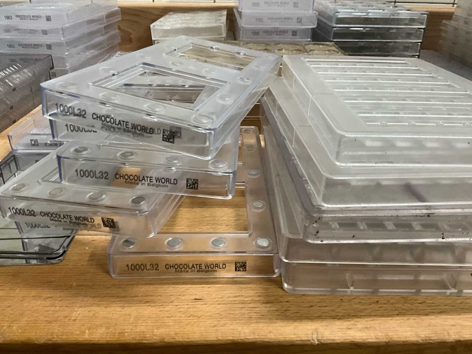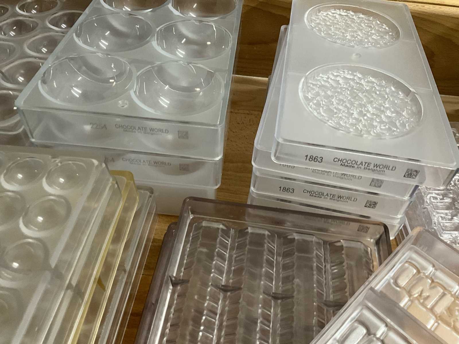 Grote partij professionele chocoladevormen voor het maken van pralines in diverse thema’s. Minimum 200 stuks. Diverse modellen aanwezig (zie nummers op foto)- inclusief 2 opbergbakken No Merk: Chocolate World