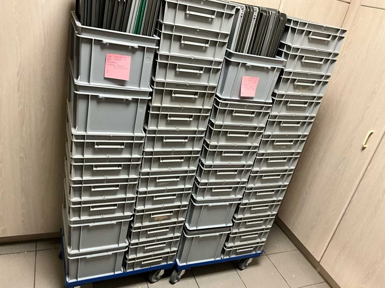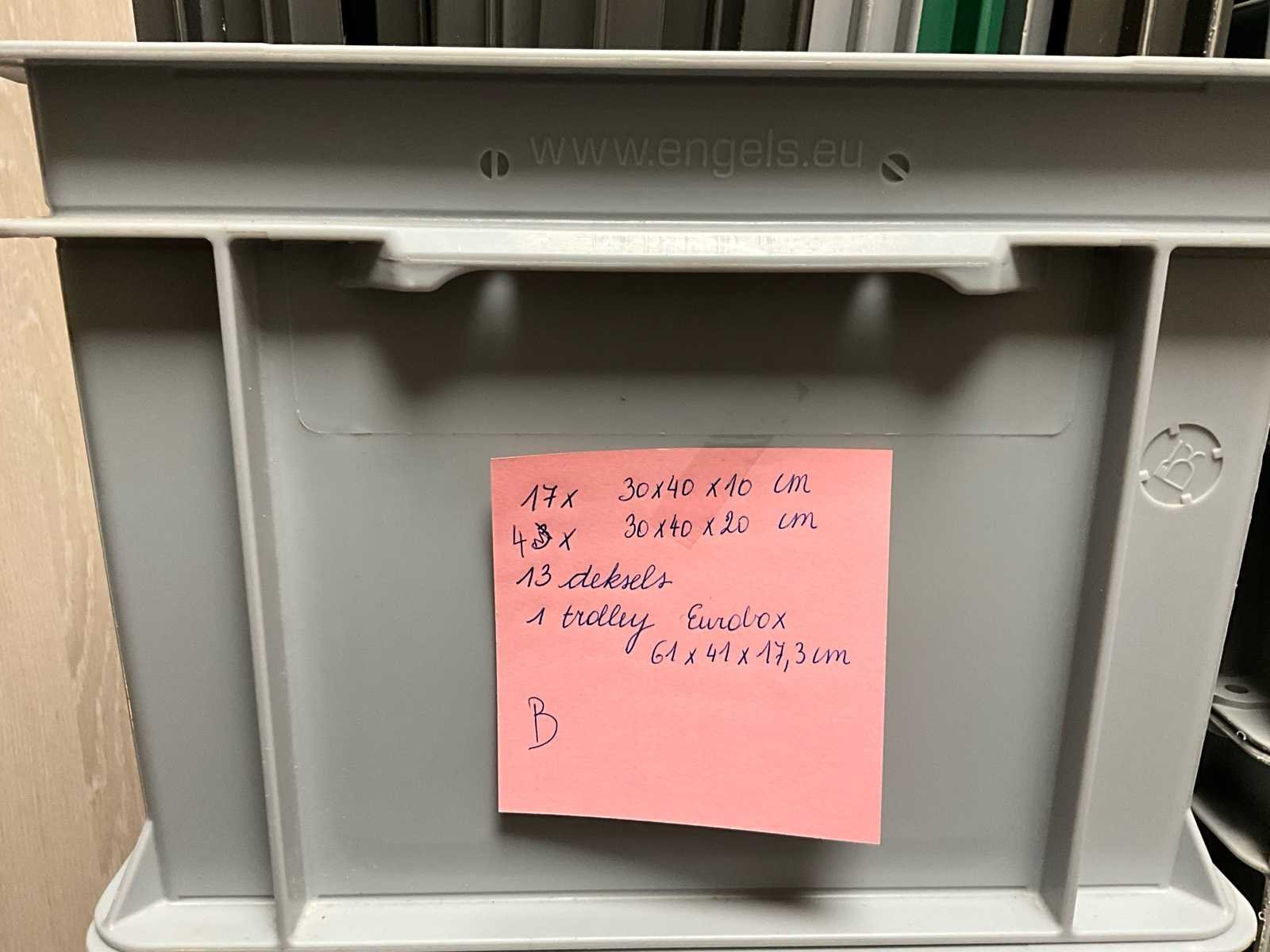 35 x bakken 30x40x10 cm, 6 x bakken 30x40x20 cm, 1 x bak 30x40x25 cm, 27 x deksels, 2 x verrijdbare transportplateaus - Kenmerken: Professionele grijze kunststof stapelbakken, Zware kwaliteit / industrieel gebruik, Stapelbaar en nestbaar systeem, Handgrepen geïntegreerd, Geschikt voor rekken, opslag of intern transport - inclusief 2 Blauwe trolleys met zwenkwielen No