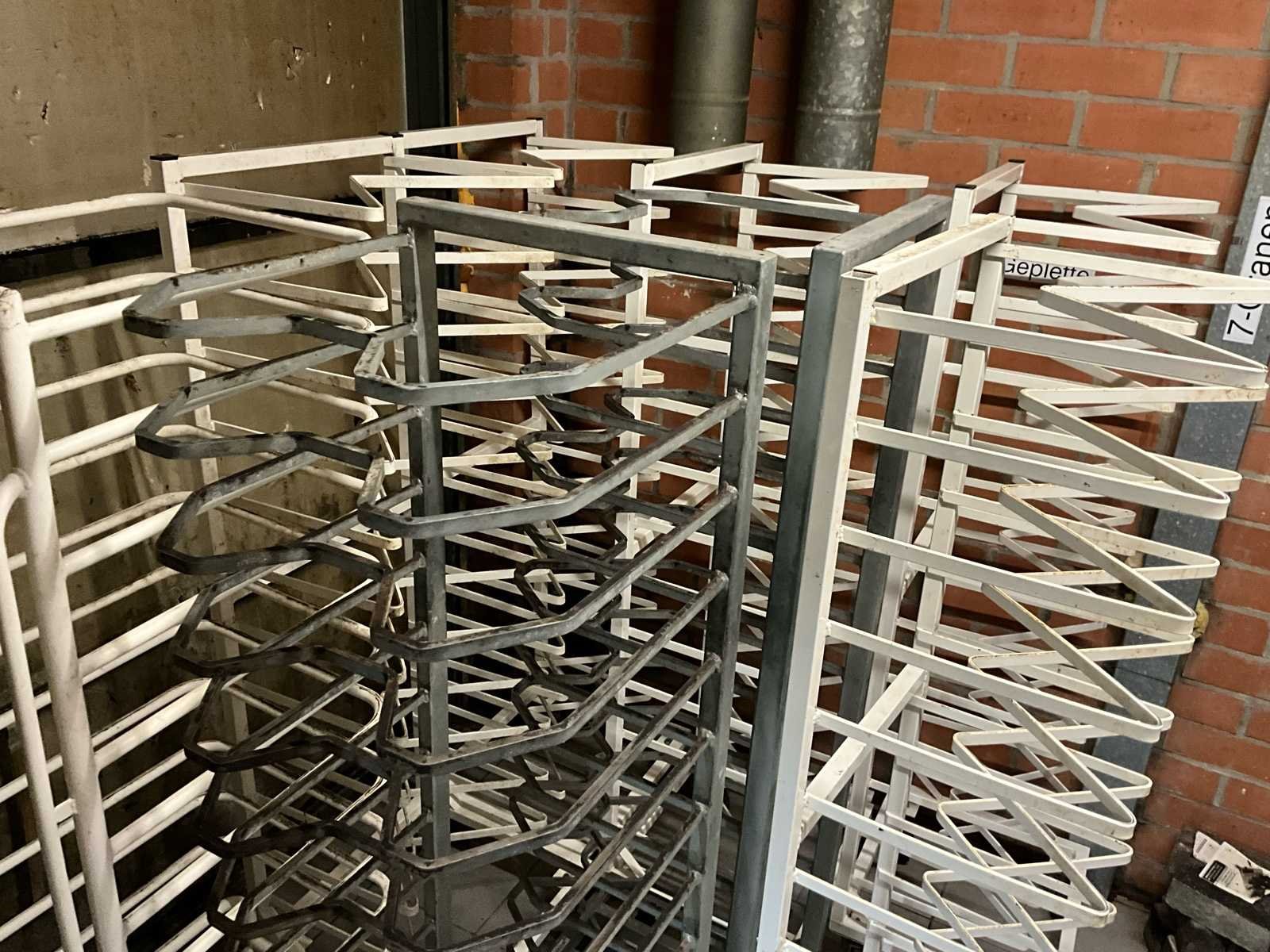 Set van 8 professionele rekwagens / platenwagens voor bakkerij, horeca of voedingsproductie. Verrijdbaar op stevige zwenkwielen. Ideaal voor transport en stockage van bakplaten, trays of producten - Specificaties: Totaal: 8 stuks, Kleur: wit en grijs, Op wielen, Stevige metalen constructie, Meerdere niveaus per kar - Staat: Gebruikte staat met normale gebruikssporen. No
