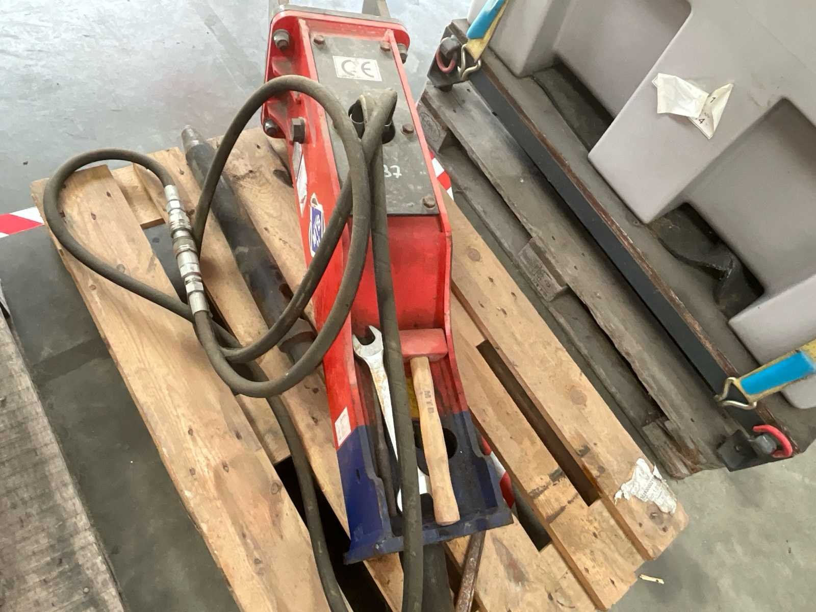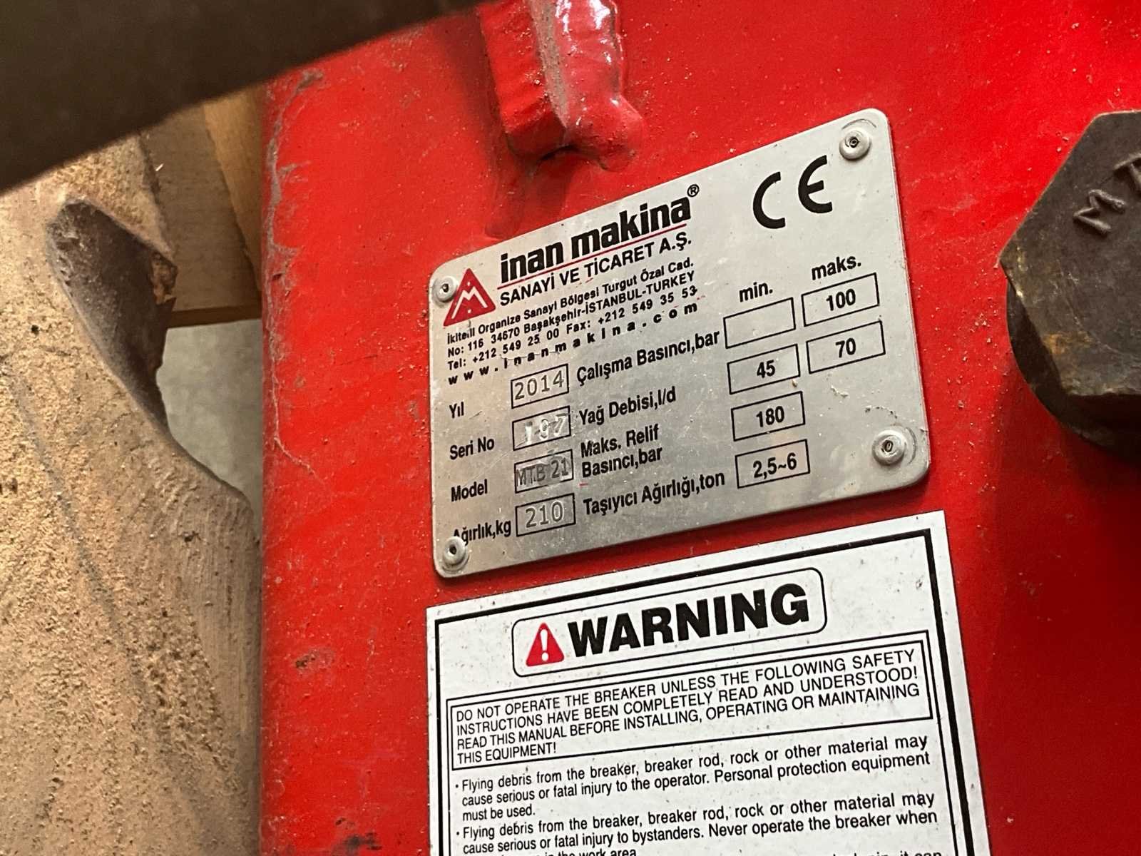 Merk: Inan Makina Sanayi ve Ticaret A.Ş. (Istanbul, Turkey) Model: MTB 21 Serienummer: 137 (gedeeltelijk leesbaar) Bouwjaar: 2014 CE-gecertificeerd: Ja Technische specificaties: Eigengewicht: 210 kg Draagvermogen graver (Taşıyıcı Ağırlığı): 2,5 – 6 ton Werkdruk (Çalışma Basıncı): 45 – 70 bar Max. werkdruk: 100 bar Olieverbruik (Yağ Debisi): 180 l/min Max. reliëfdruk: 2,5 – 6 bar Toepassing: Hydraulische betonbreker/sloophamer voor montage op minigraver of graafmachine van 2,5 tot 6 ton. Geschikt voor sloop van beton, asfalt, rots en funderingswerken. Staat: Gebruikt, zichtbare gebruikssporen, beitel aanwezig Nee