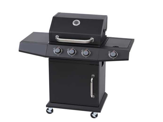 Product size: 110x48x110cm Cooking area : 515x375mm, Enamel cast iron cookinggrids,2pcs Warming rack : Stainless steel warming rack Lid: Steel, with black powder coating, double layer Thermometer: Stainless steel Firebox: Steel, with high-temp(550C) resistant powder coating Burner and Power Stainless steel tube burners, 2.8kw per mainburner, 2.5kw per side burner, total 10.9KW Oil tray: Galvanized sheet oil tray, easy remove out from back side Ignition system: Push and turn, integrated automatic easy ignition Flame tamper: Enamel flame tamper, 3pcs Control panel: Steel, with black powder coating Control knob: ABS control knob and Stainless steel knobbase Front door: Steel, with black powder coating, double layer, Side table: Steel, with black powder coating Bottom shelf: Steel, with black powder coating Wheel: 2pcs 3inch wheels with lock, 2pcs 3inch wheels without lock Cabinet side panels & Back panel Steel, with black powder coating No