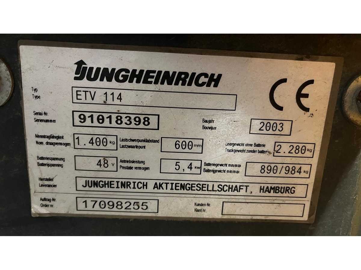 In wekende staat. Alle functies werken! 2003 ETV 114 Jungheinrich reachtruck 6500 mm hefhoogte inclusief acculader Nee Merk: Jungheinrich Type: ETV 114 Bouwjaar: 2003 Brandstof: Elektrisch Mast: Triplex Soort band: Vol Afgelezen urenstand: 1120 Accu lader: true Free-lift: true Triple mast: true Eigen gewicht: 2280kg Hefvermogen: 1400kg Lepellengte: 1150mm Max. hefhoogte: 6800mm Hefhoogte: 6500mm Vol rubber banden: true