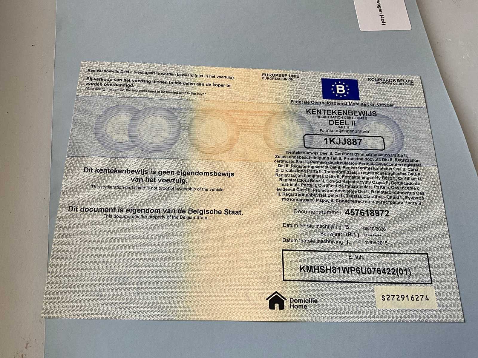 Belgische boorddocumenten compleet, MOTOR TE HERSTELLEN, ZONDER zend en communicatie apparatuur, sleutel aanwezig Nee Merk: Hyudai Model: SUV Type: Santa Fe CRDI 4WD Bouwjaar: 2006 Afgelezen kilometerstand: 150000km Cilinderinhoud: 2188cc Vermogen (kW): 110kW Brandstof: diesel Chassisnummer: KMHSH81WP6U076422 Datum eerste toelating: 05-10-2006 Aandrijving: 4 WD Aantal zitplaatsen: 4 Kleur: Rood Transmissie: Handgeschakeld Stuurwiel: Links Emissieklasse: Euro 3 Aantal deuren: 5 Aantal sleutels: 1 Aantal cilinders: 4 Vierwielaandrijving 4x4: true