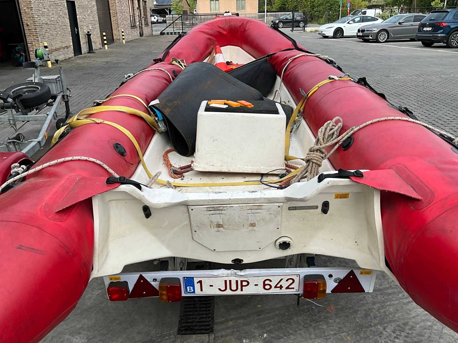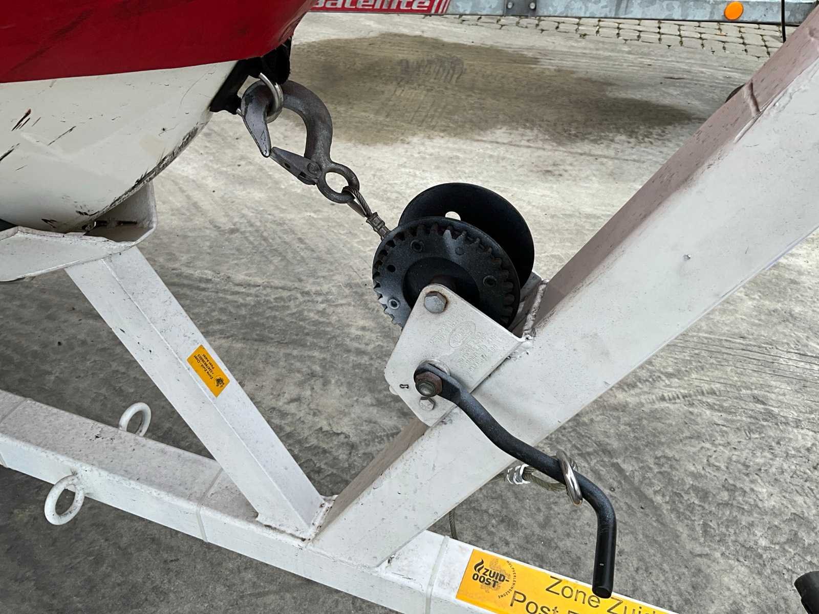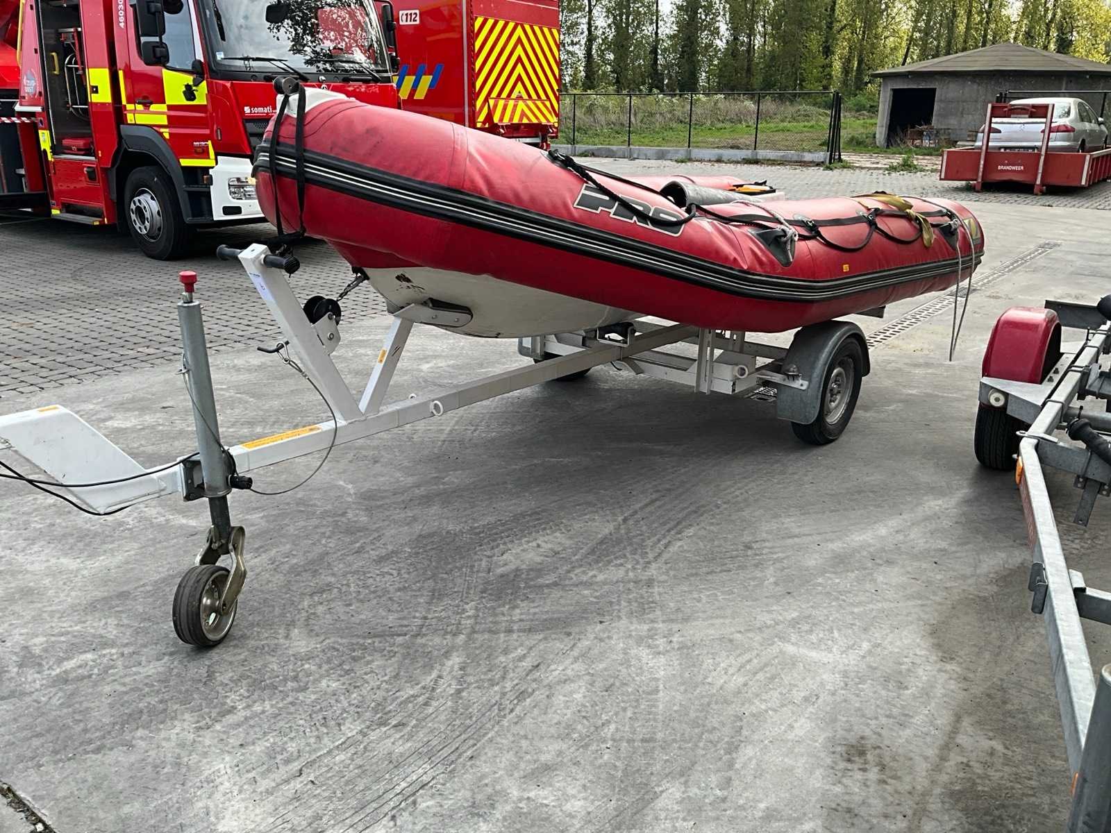 Bestaand uit trailer enkele as zonder oplooprem met oogtrekhaak diameter 4 cm steunwiel en lier, boot ZONDER MOTOR voorzien van roeispanen, overmeten lengte trailer 6 meter Nee Merk: Zodiac Type: Pro 11 470 R Rompmateriaal: Polyester Serienummer: Zz14211 Lengte over alles: 4.5m Breedte formaat: 1.9m Kleur: Rood-wit