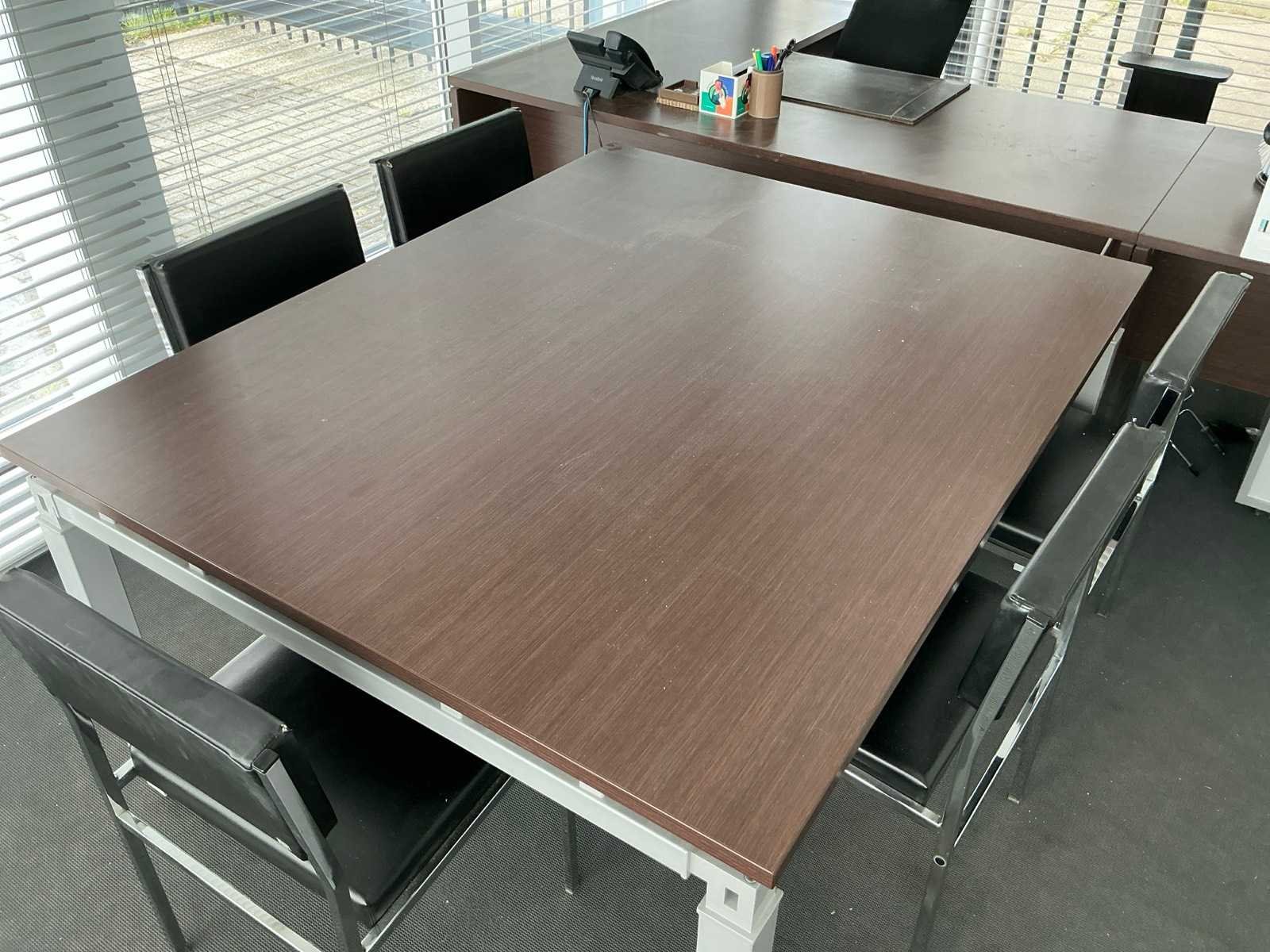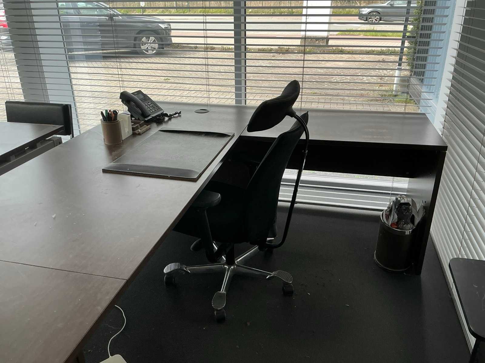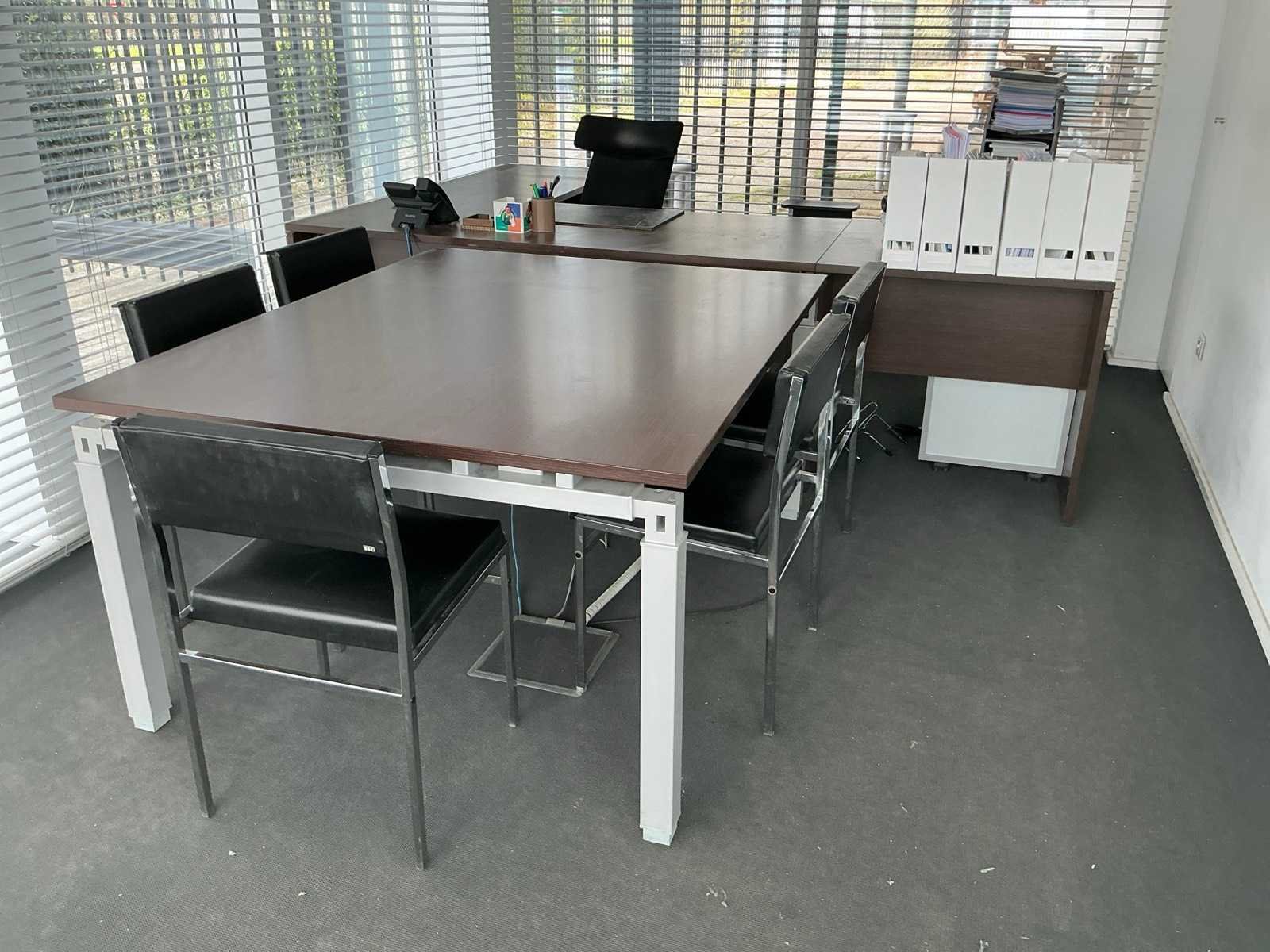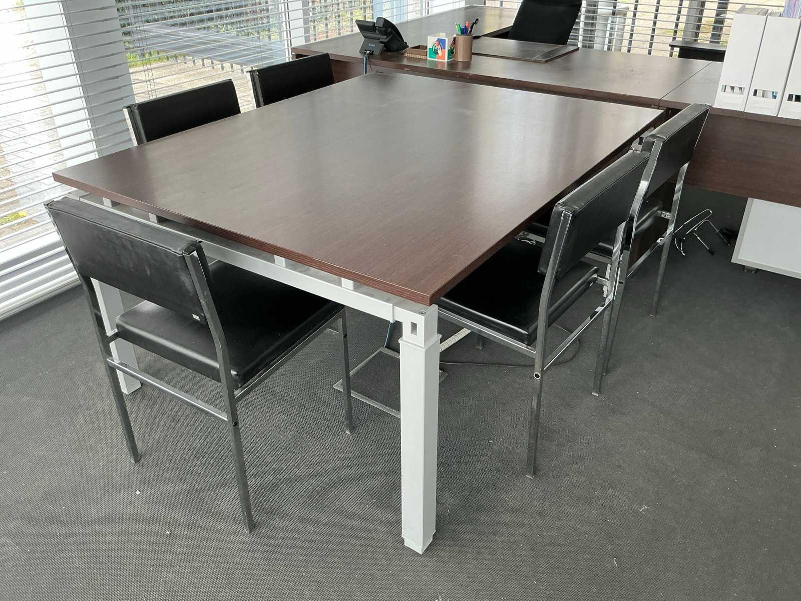 Bestaande uit: vergadertafel voorzien van metalen onderstel, afmeting: 150x120x74cm en L-vormige bureautafel 260x178x73cm met 3-schuifsladeblok, bureaustoel en 5x bijzetstoel voorzien van lederen bekleding Nee